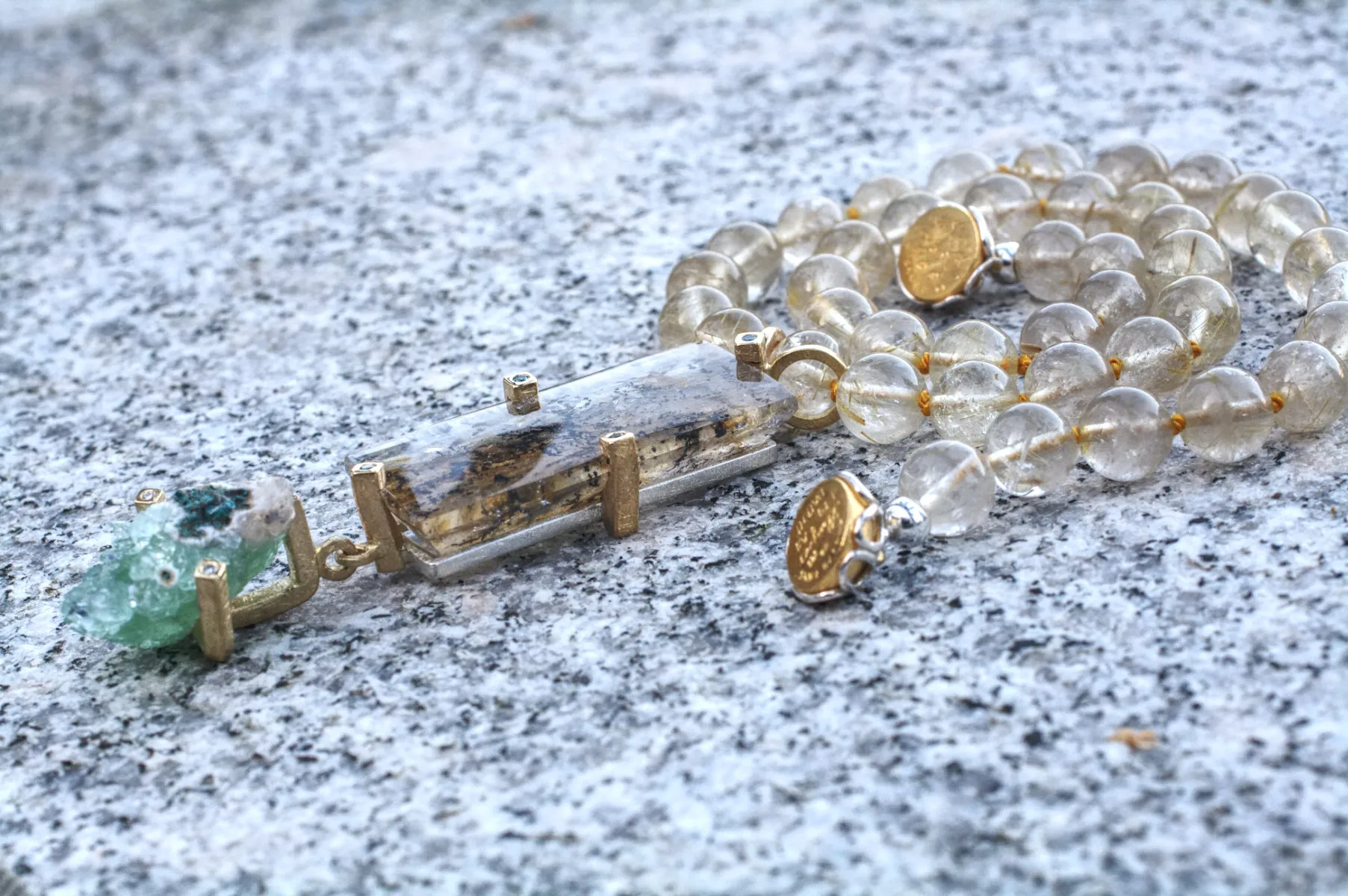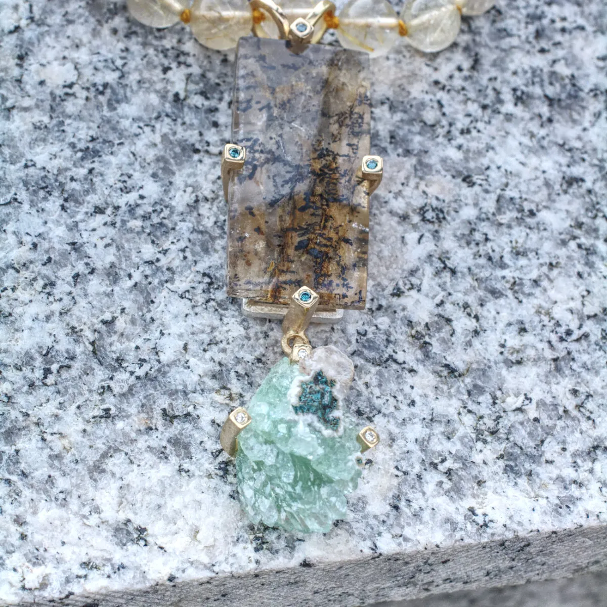 Anhänger rechteckiger Dentritenquarz mit 4 Gelbgoldkrappen mit blauen Brillanten und Apophylith Kristall mit drei Krappen in Gelbgold mit Brillanten