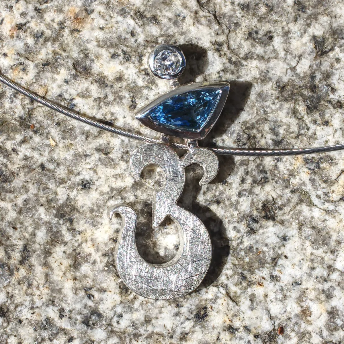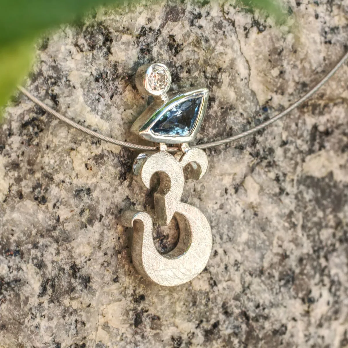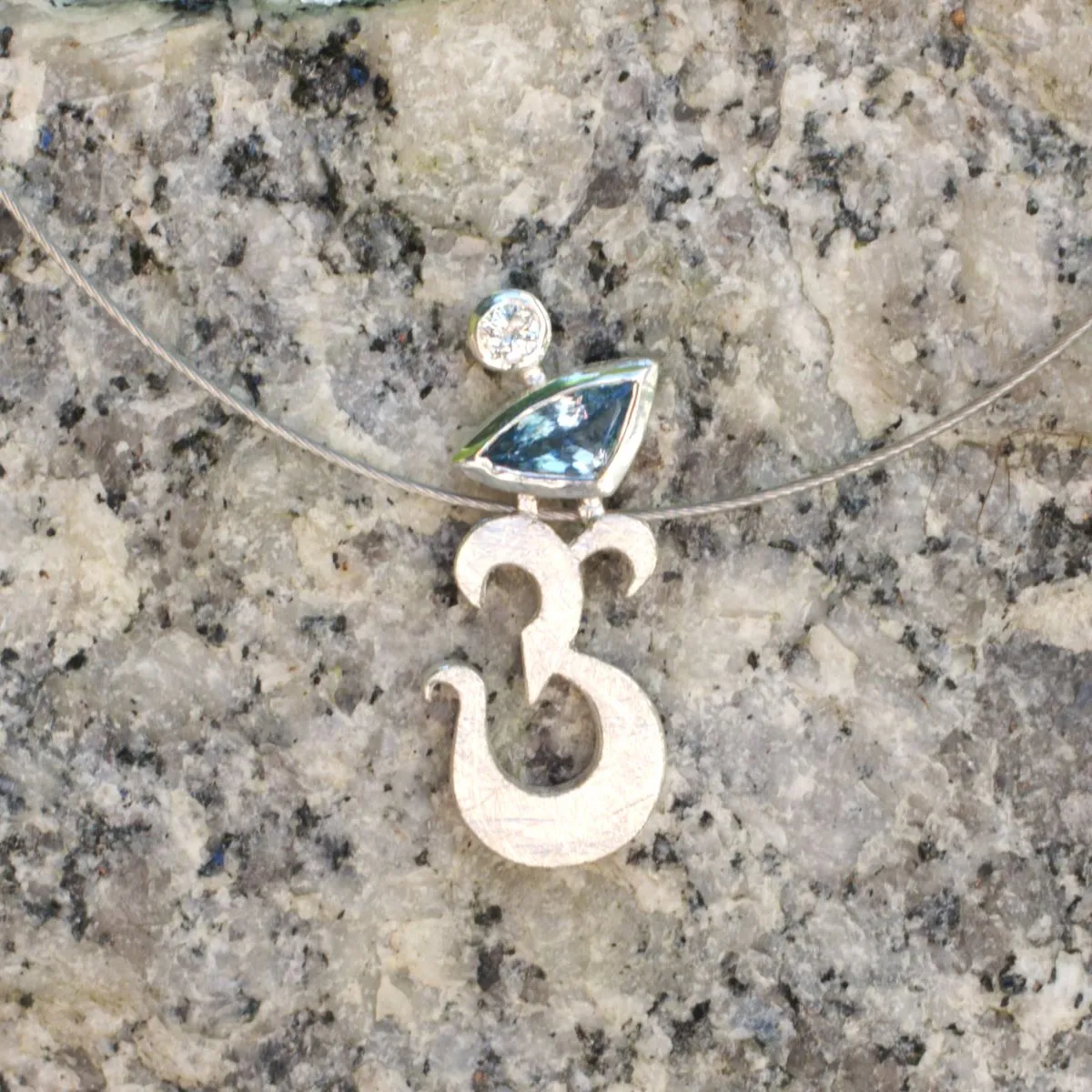 Anhänger in Form eines Om-Zeichens aus Silber mit zwei Steinen