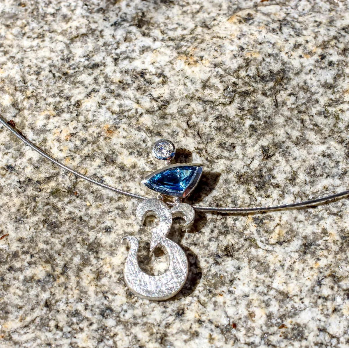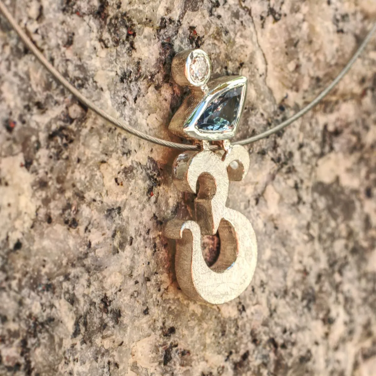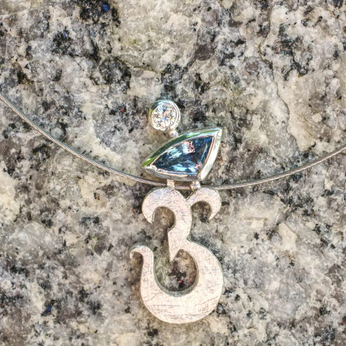 Anhänger in Form eines Om-Zeichens aus Silber mit zwei Steinen
