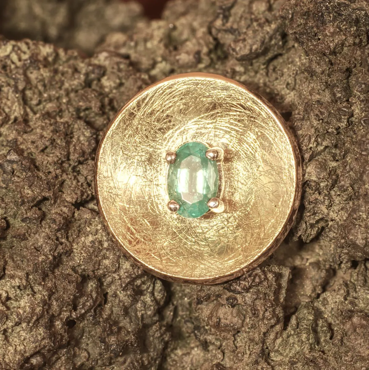 kreisförmiger konkaver Anhänger aus Gelbgold mit Ösen hinten und Weißgoldkrappenfassung mit Smaragd