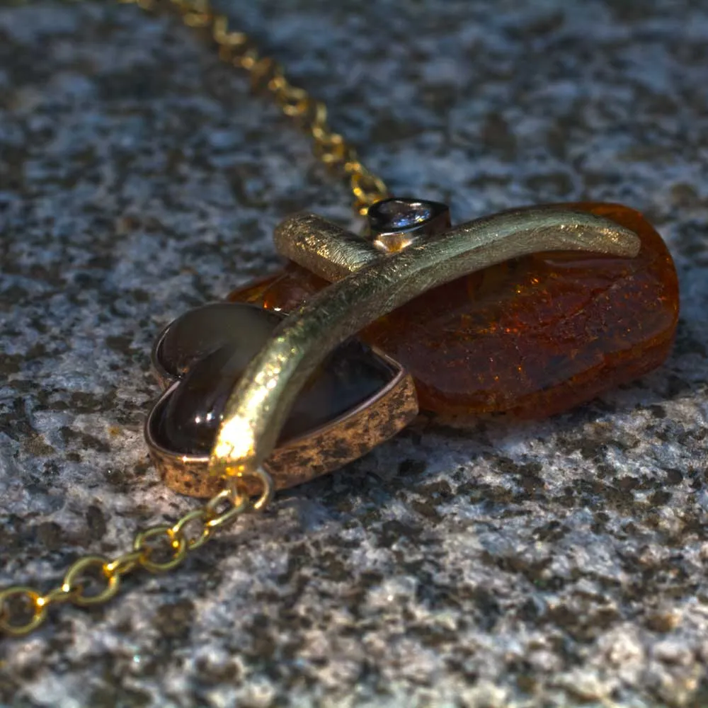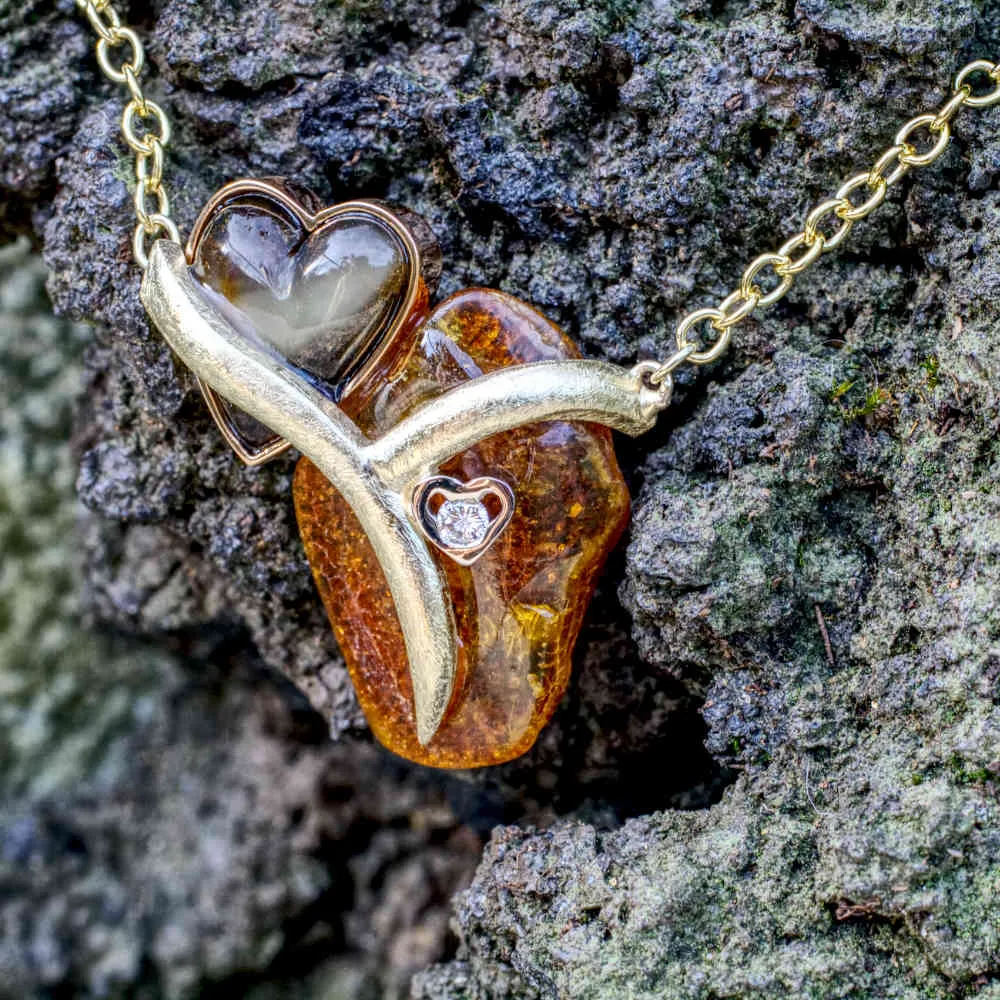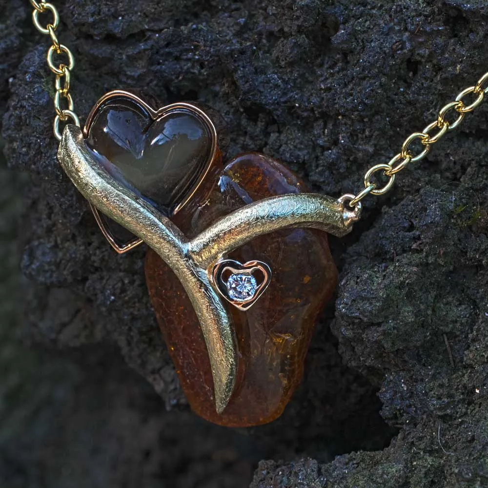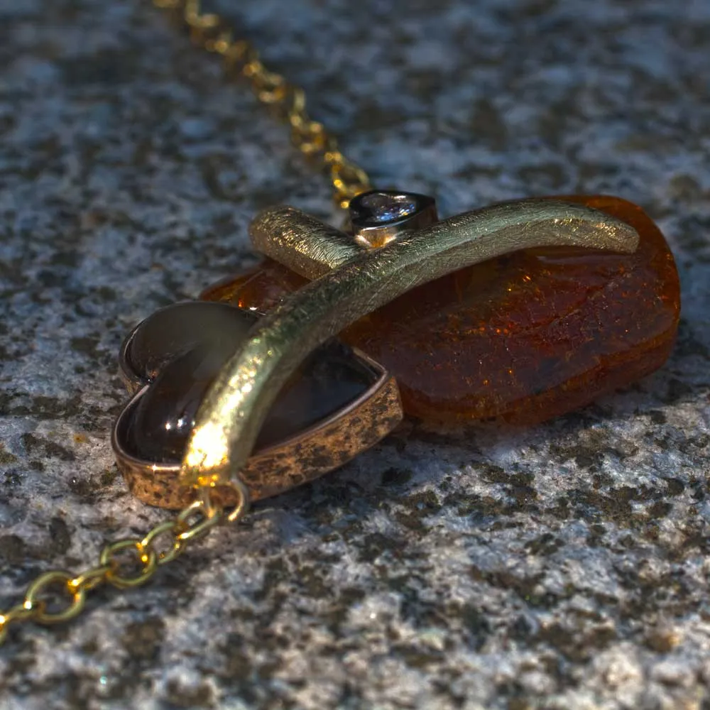 dunkles Bernsteinherz in Rotgoldfassung unter Gelbgoldbogen der sich über den zweiten goldfarbenen Bernstein zieht, von dem ein zweiter Bogen abzweigt , in deren Übergang ein Weißgoldherz sitzt, in dem ein Brillant gefasst ist, links und rechts am Goldbogen ist eine goldene Ankerkette angebracht.