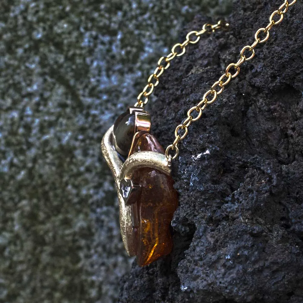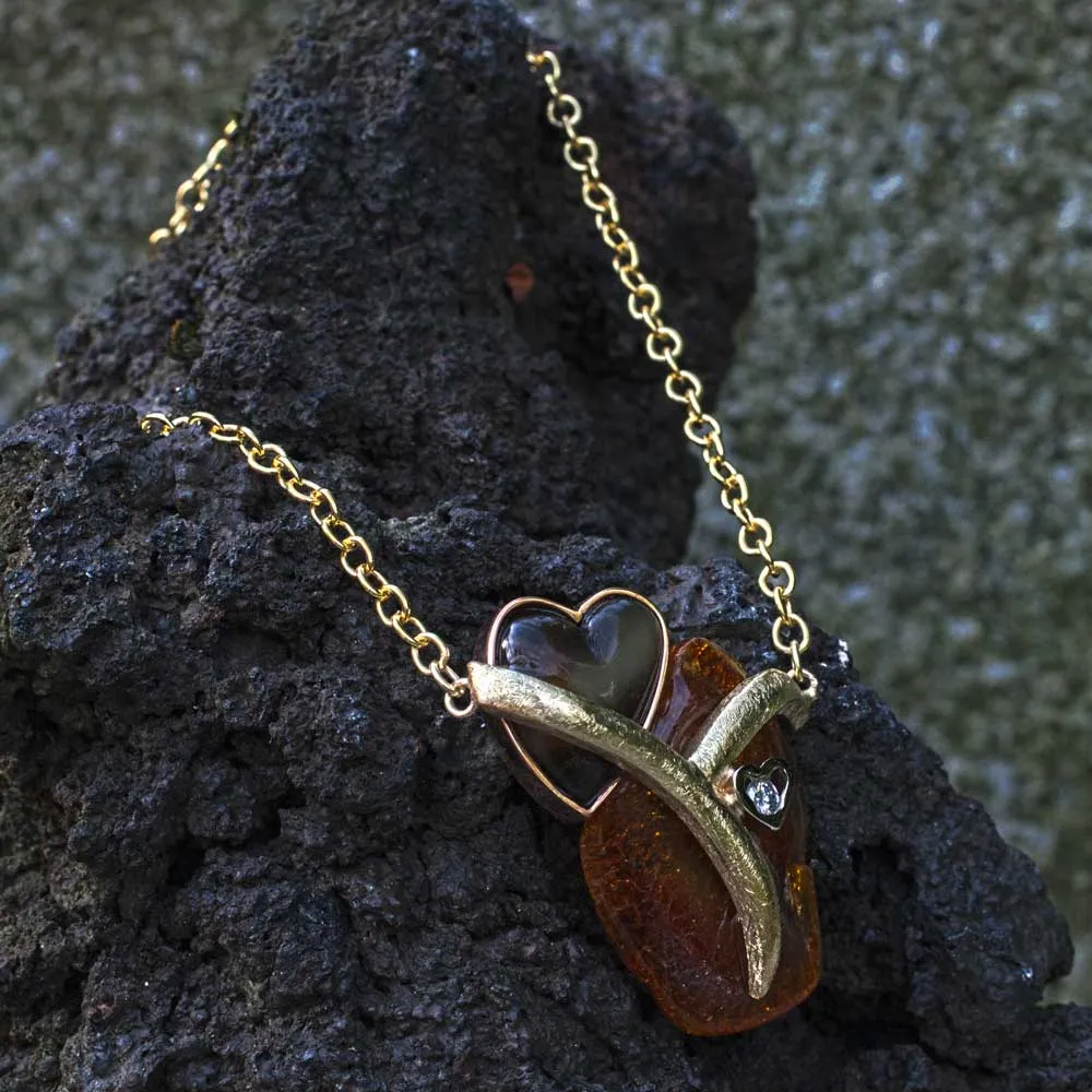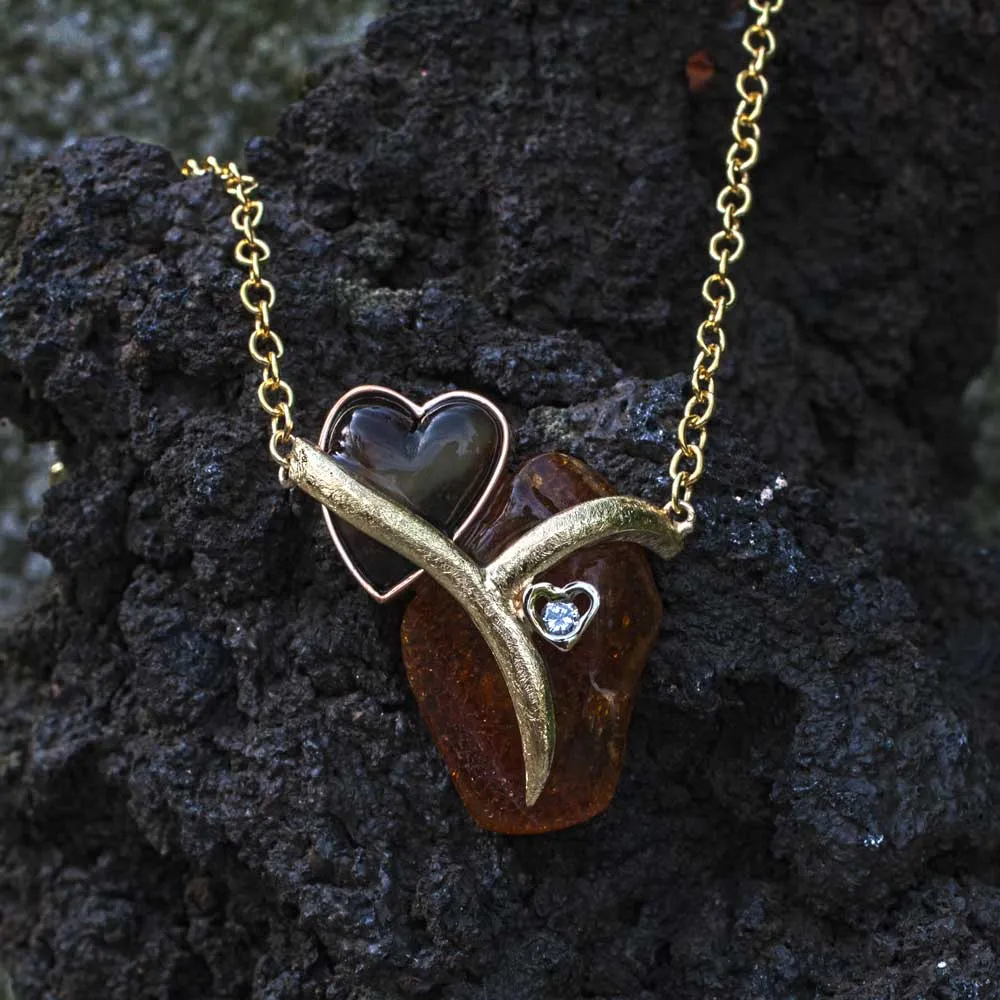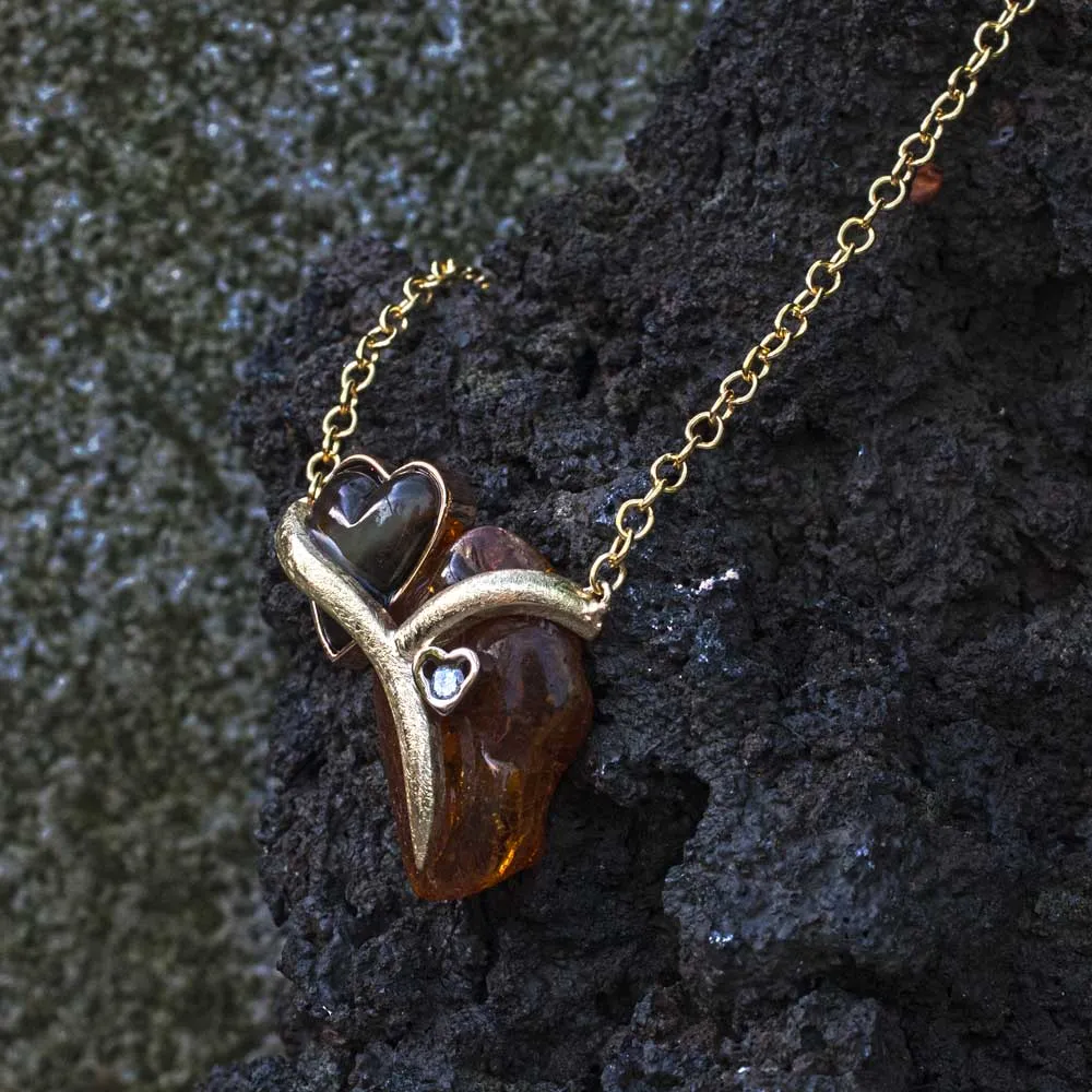 dunkles Bernsteinherz in Rotgoldfassung unter Gelbgoldbogen der sich über den zweiten goldfarbenen Bernstein zieht, von dem ein zweiter Bogen abzweigt , in deren Übergang ein Weißgoldherz sitzt, in dem ein Brillant gefasst ist, links und rechts am Goldbogen ist eine goldene Ankerkette angebracht.
