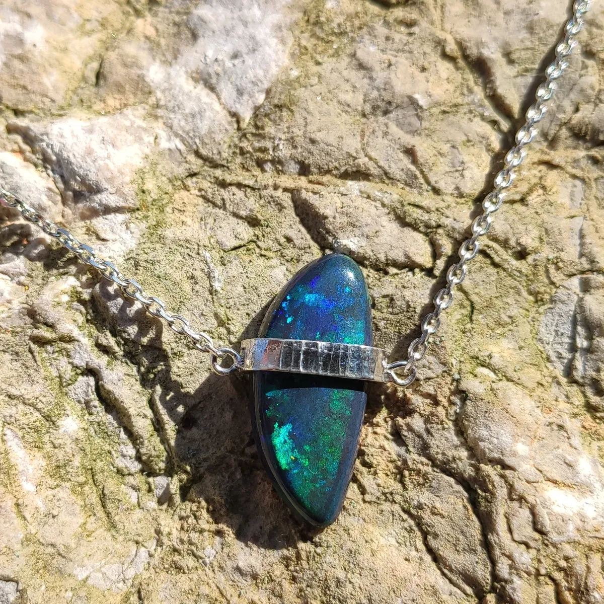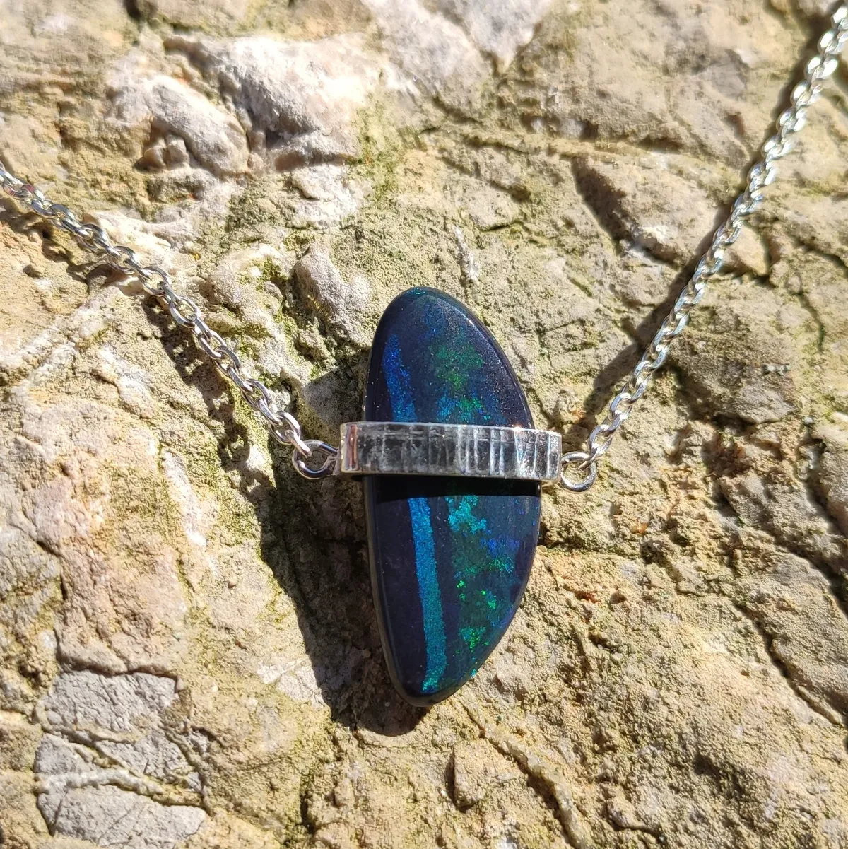 blaugrüner Opal in Silberfassung in einer silbernen Ankerkette