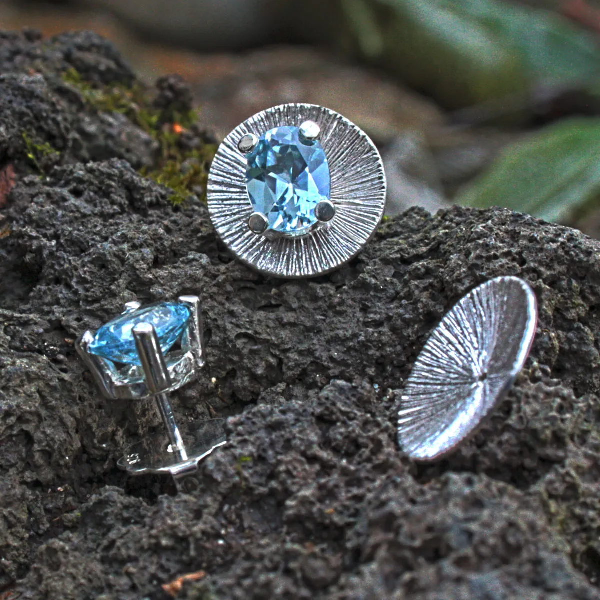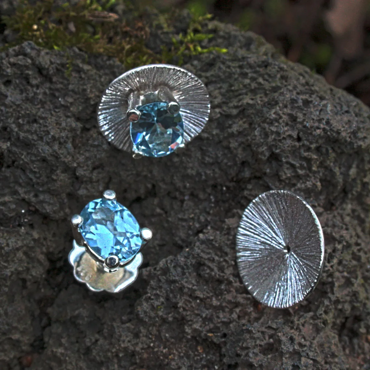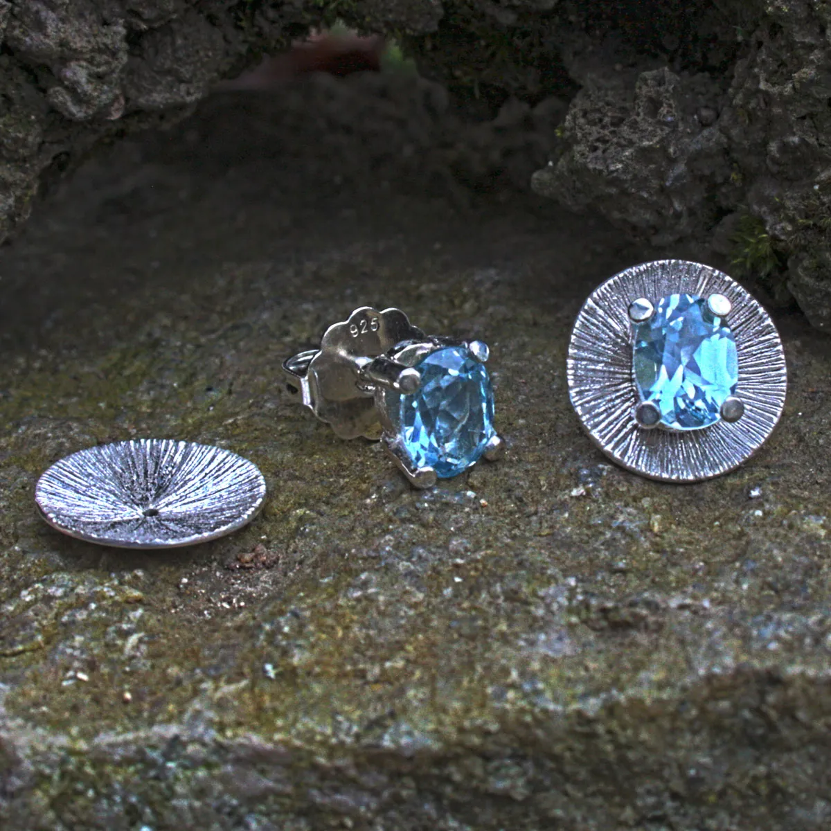 Silber-Ohrstecker mit Blautopas in Krappenfassung und runder Beilagscheibe