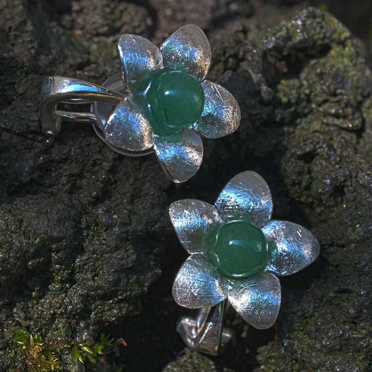 Ohrclip mit fünfblättriger Blume in Silber mit Aventurin-Kugel in der Mitte