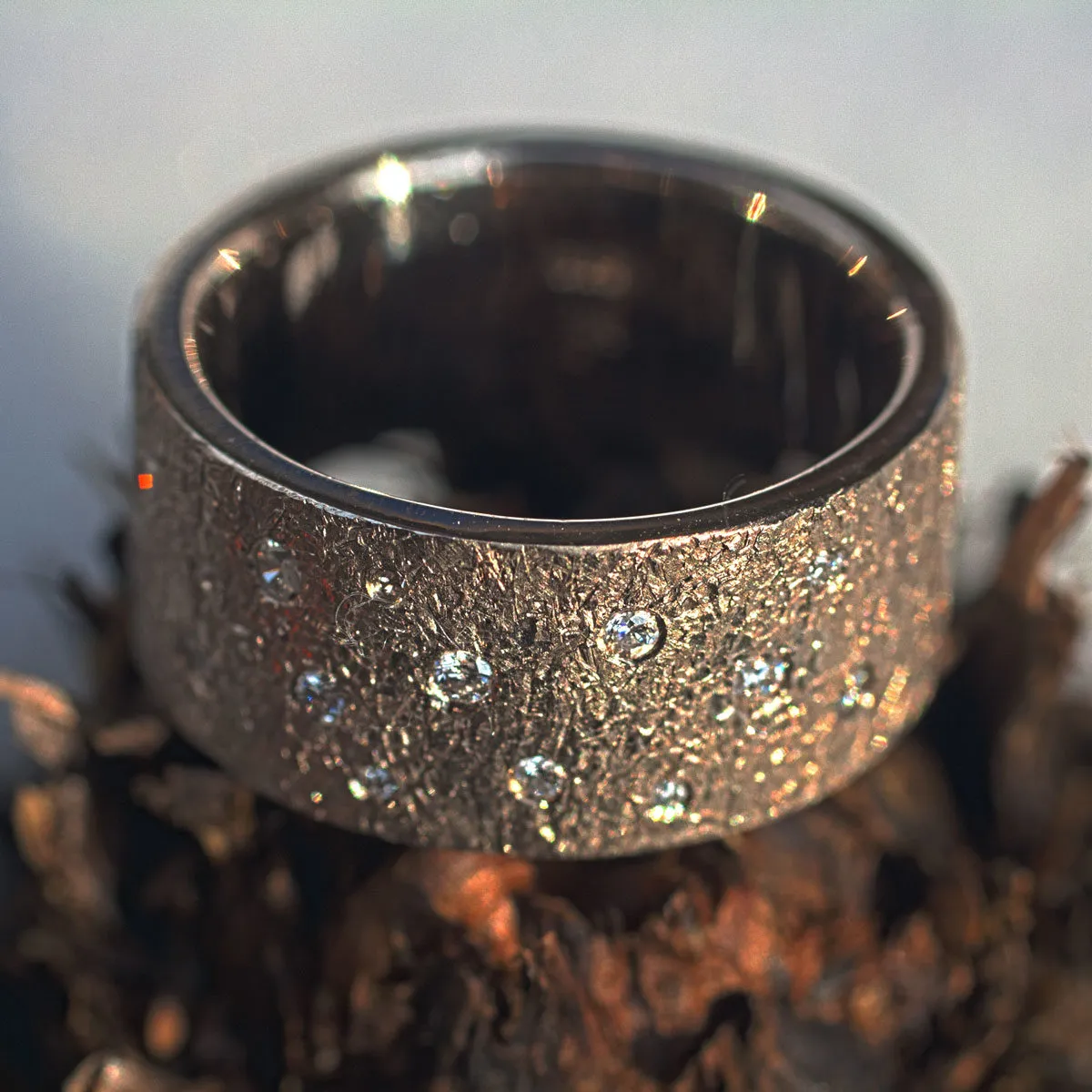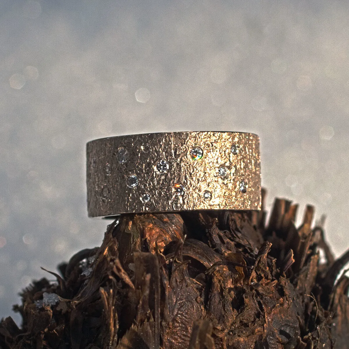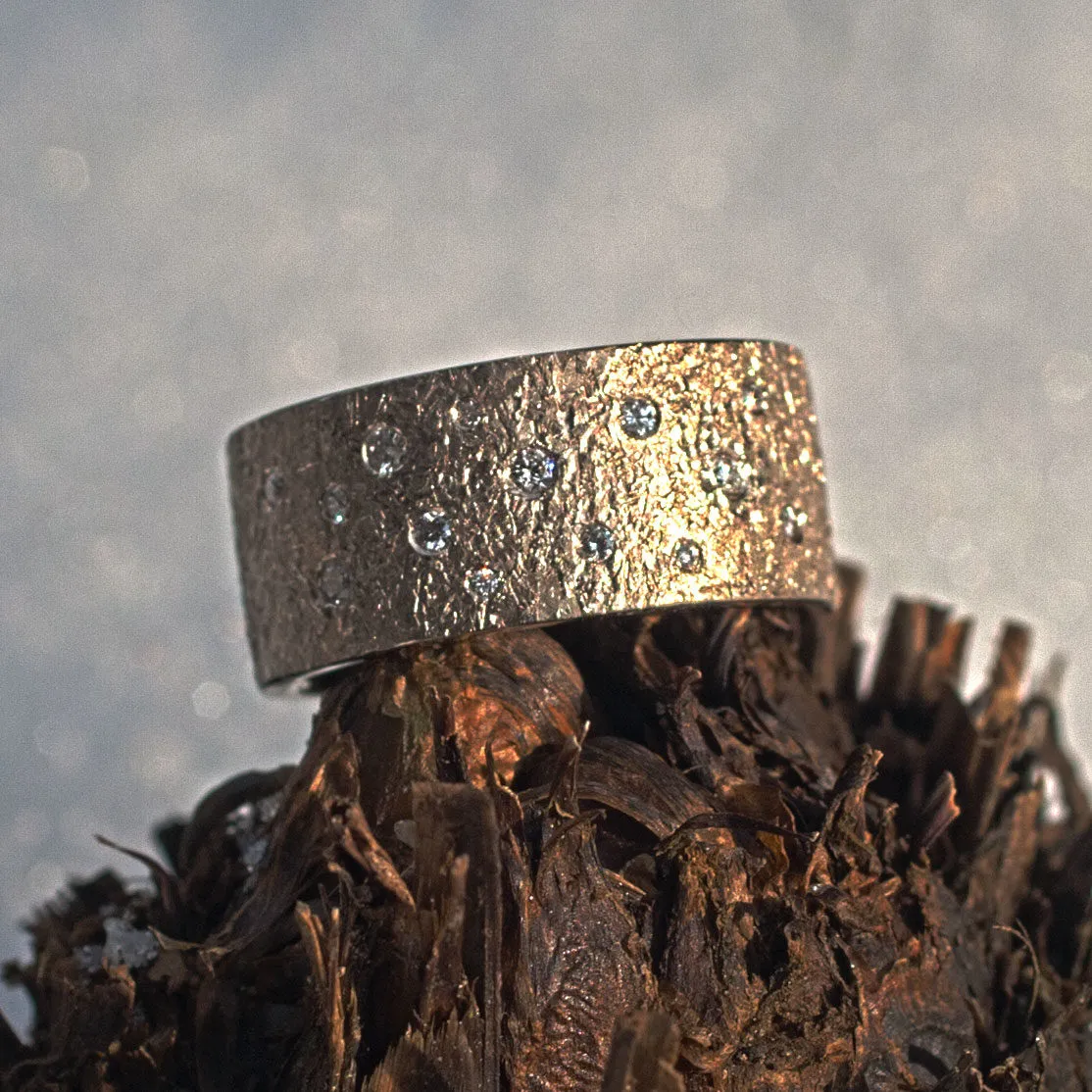 breiter Bandring Gelbgold mit dreizehn Brillanten in der Fläche eingerieben, Hammerschlagstruktur