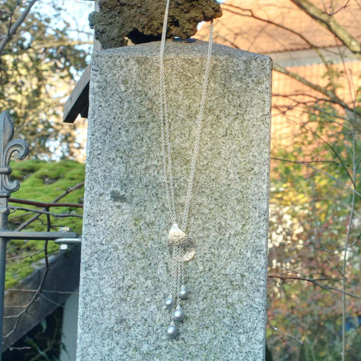 Collier aus 2 Silberketten mit grauen Süßwasserzuchtperlen an den Enden und einer Schließe mit der