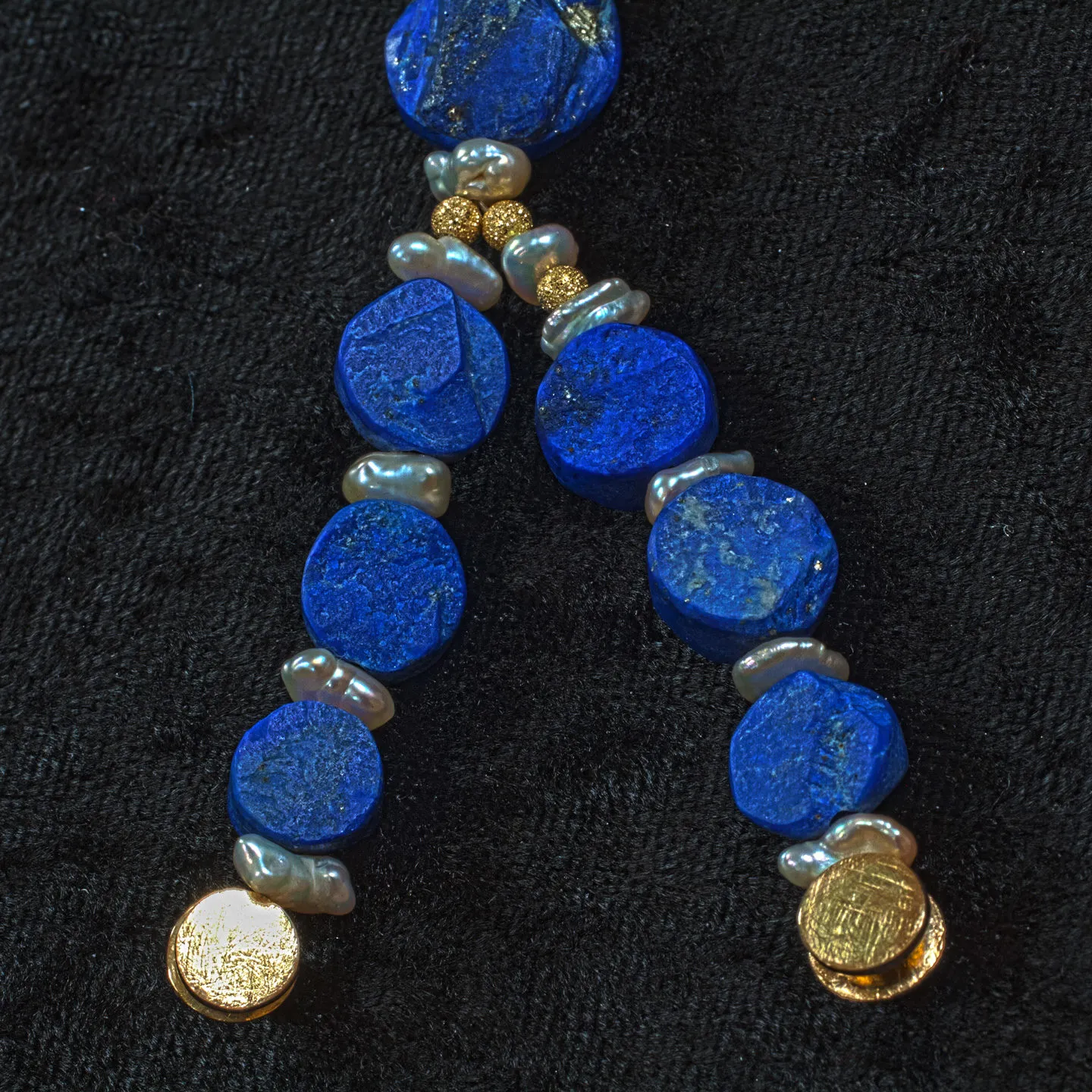 Collier aus Lapilazuli Kreisplatten im Verlauf mit zwischengesetzten Keshi Perlen und drei Goldteilen mit Brillantbesatz, Magnetschließe Gold