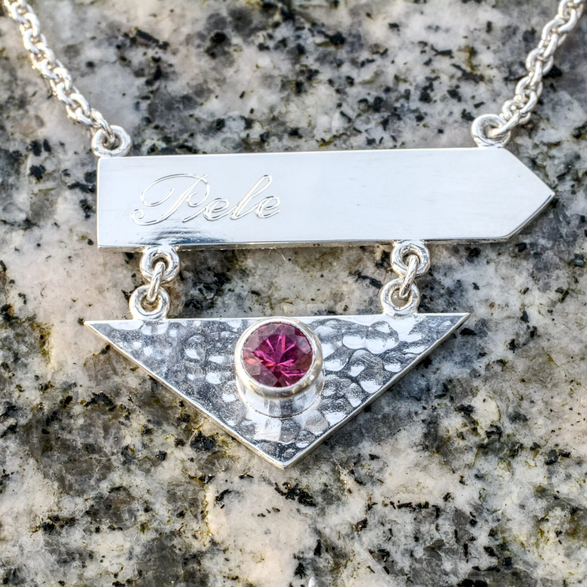 rosa Turmalin in silberner Zargenfassung auf dreiecckiger Grundplatte mit punktförmigem Hammerschlag