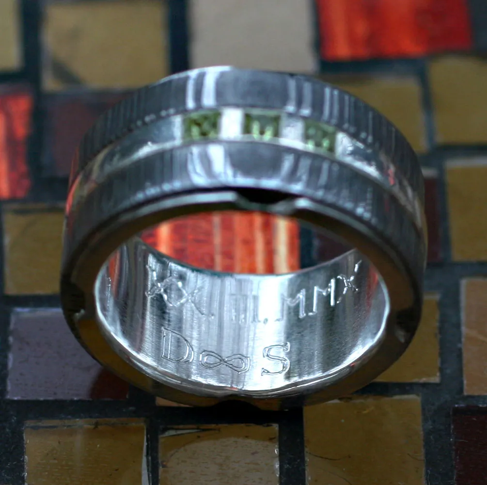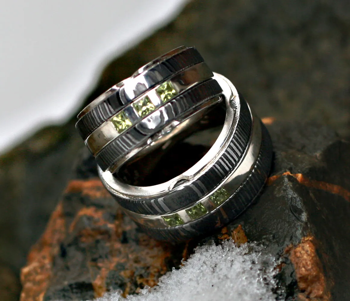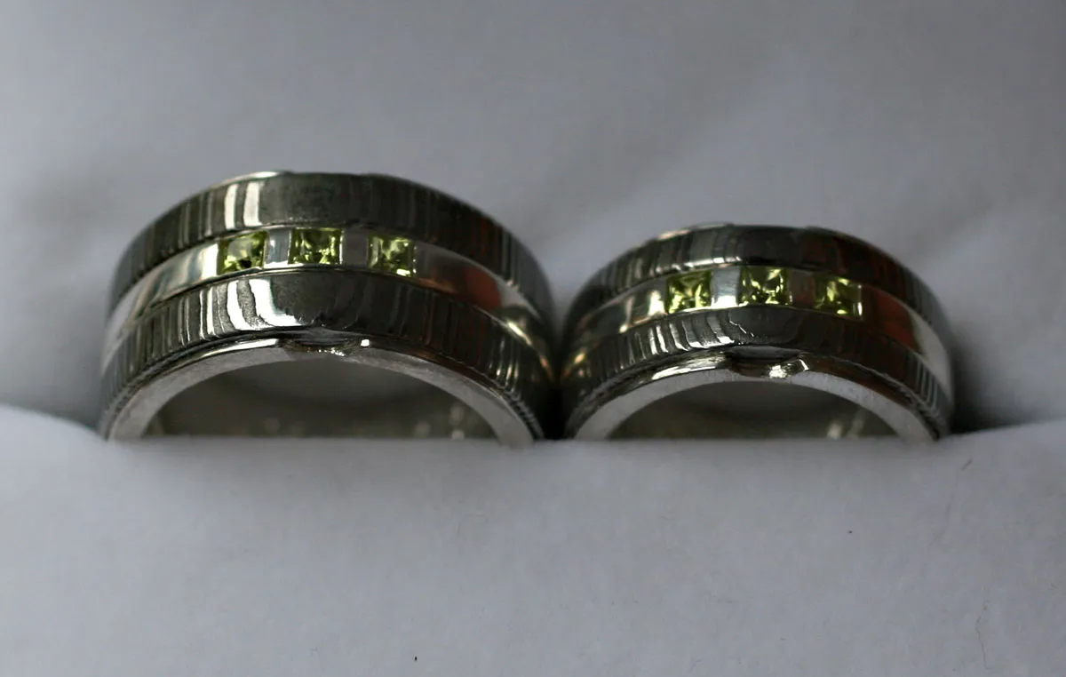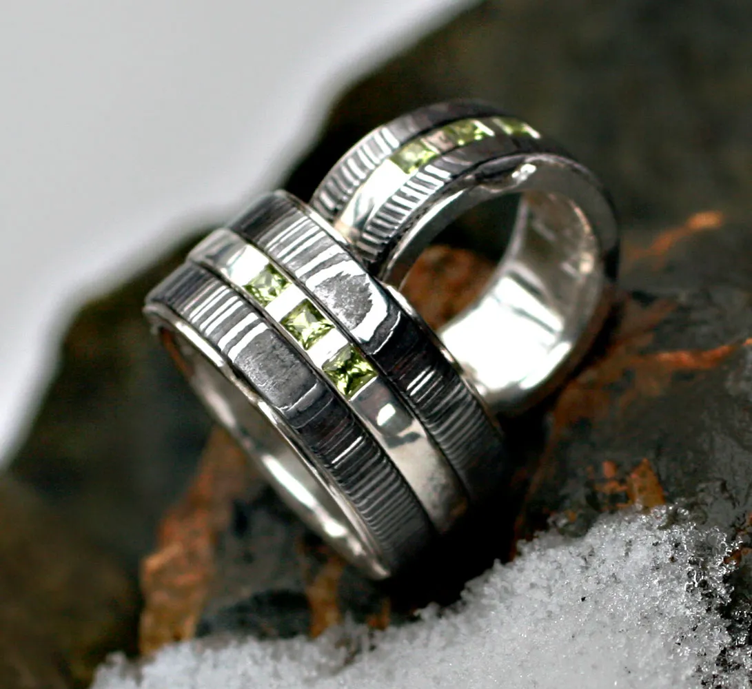 zwei Damastringe mit Zwischenring in Silber mit drei quadratischen Peridoten ausgefasst, Innenauskleidung Silber mit Runengravur