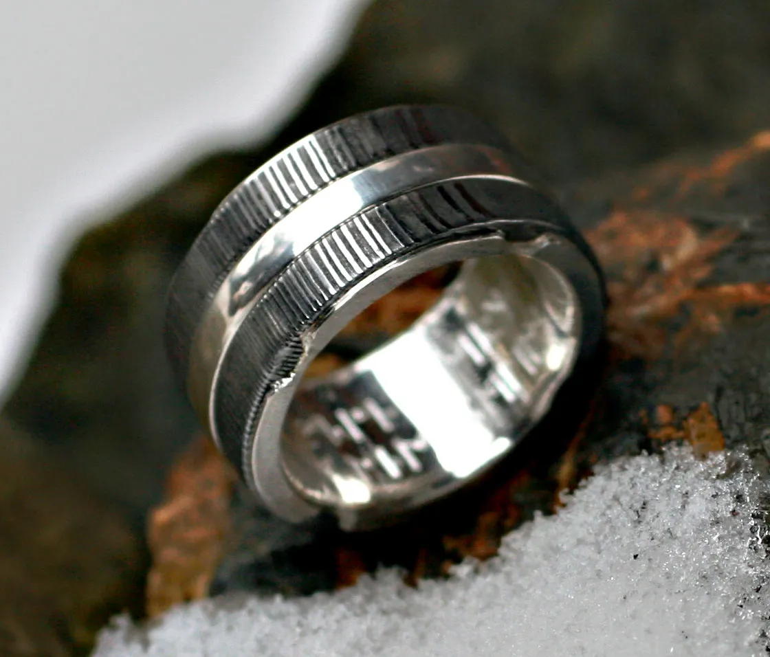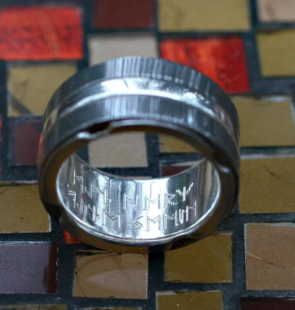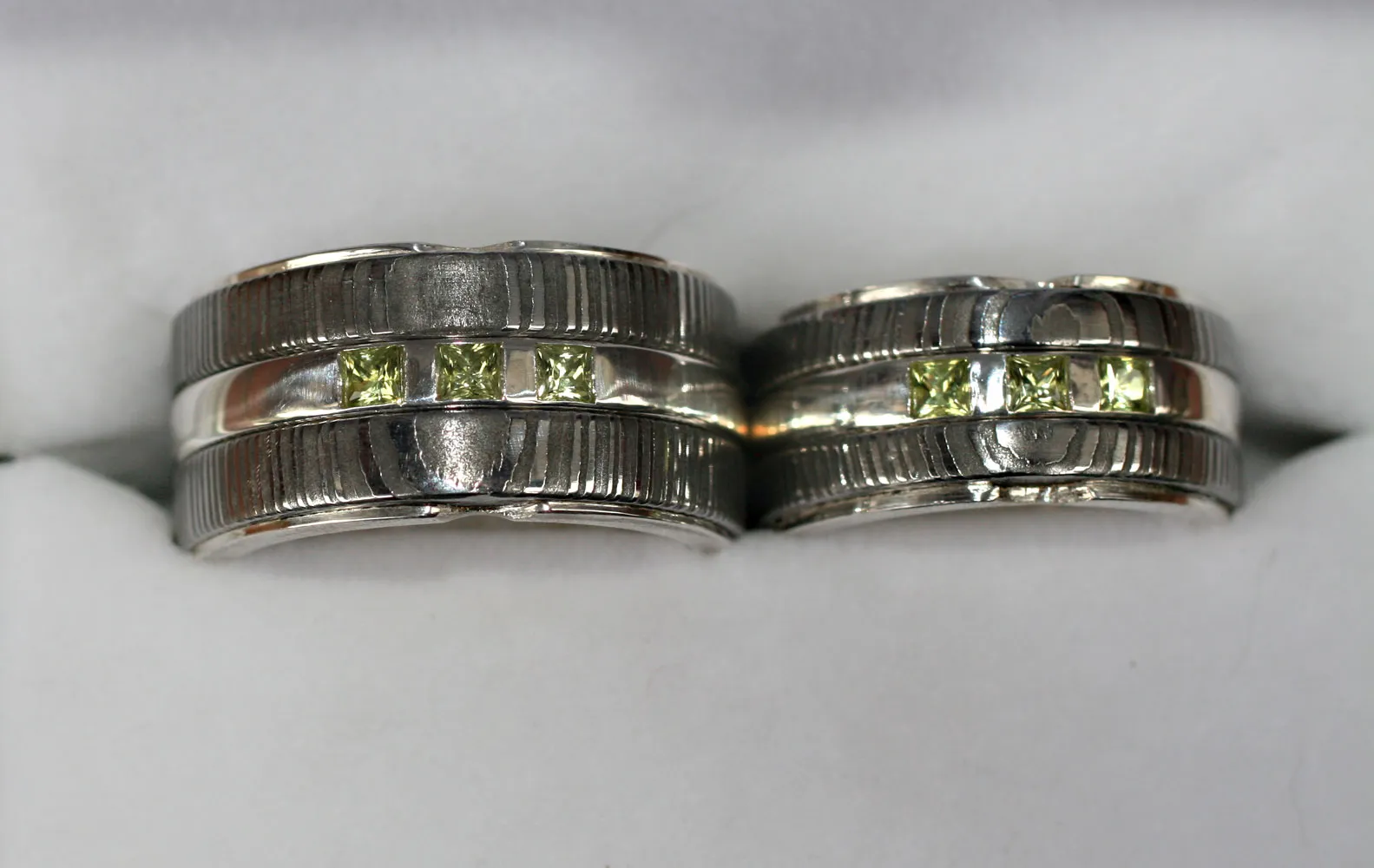 zwei Damastringe mit Zwischenring in Silber mit drei quadratischen Peridoten ausgefasst, Innenauskleidung Silber mit Runengravur