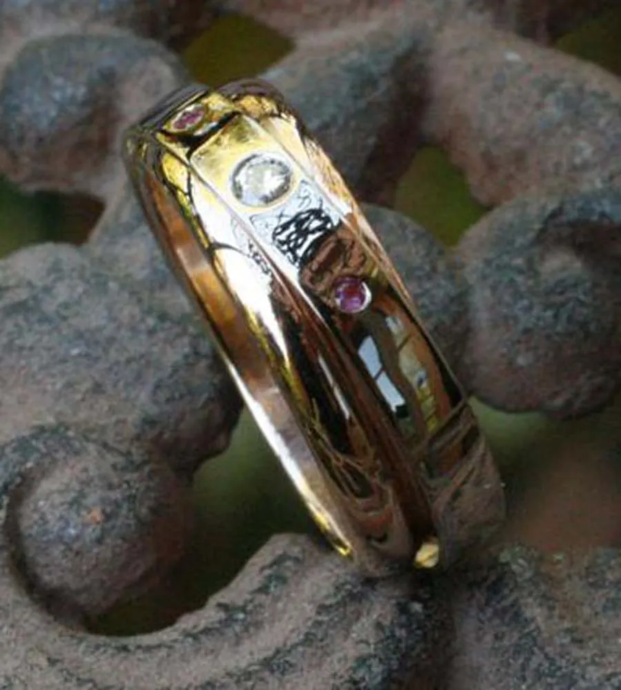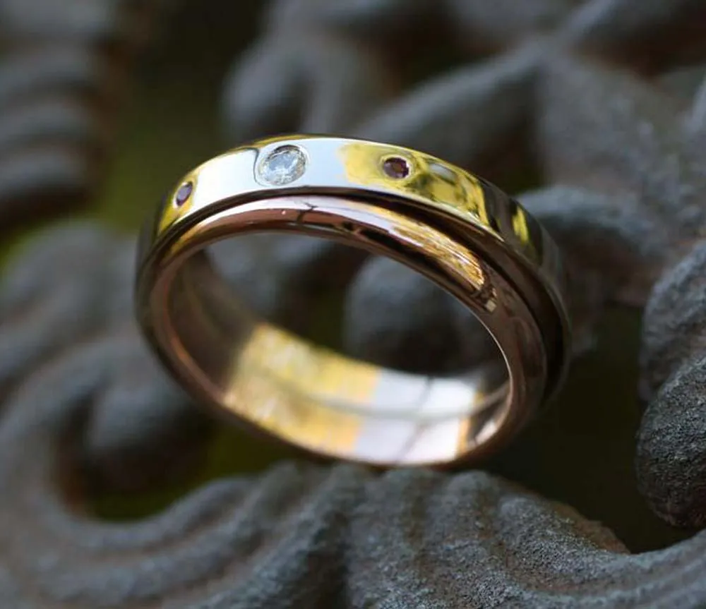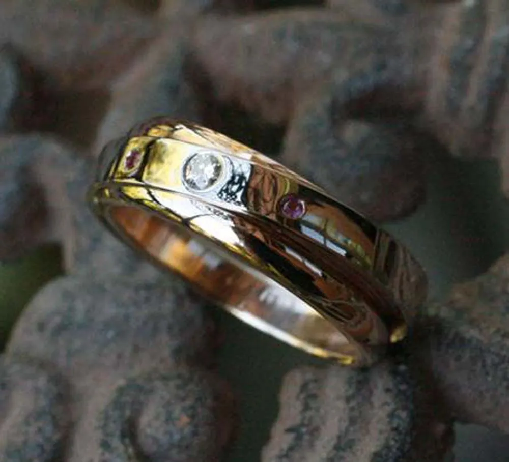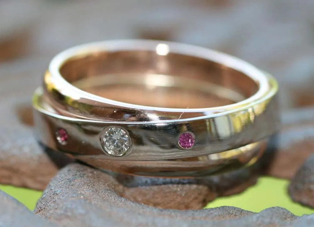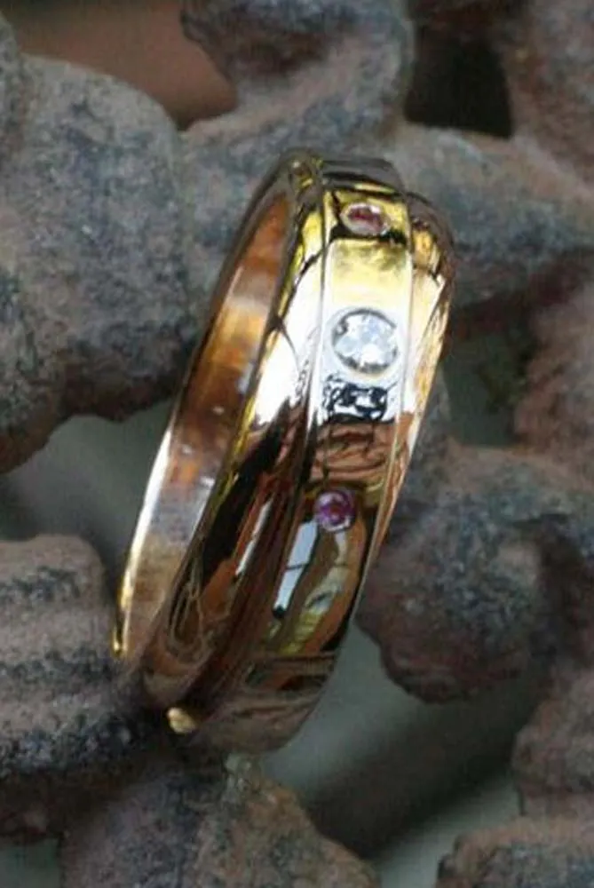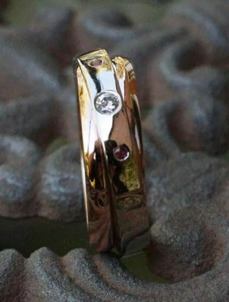Gelbgoldring mit schräg aufgesetztem Weißgoldring mit einem Brillanten und zwei Rubinen