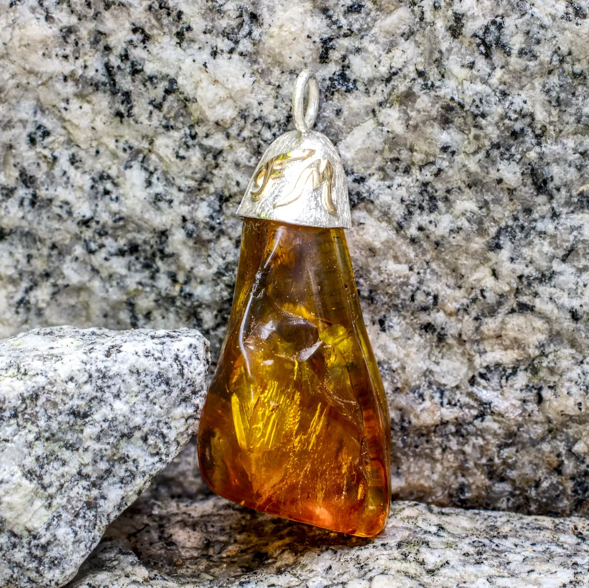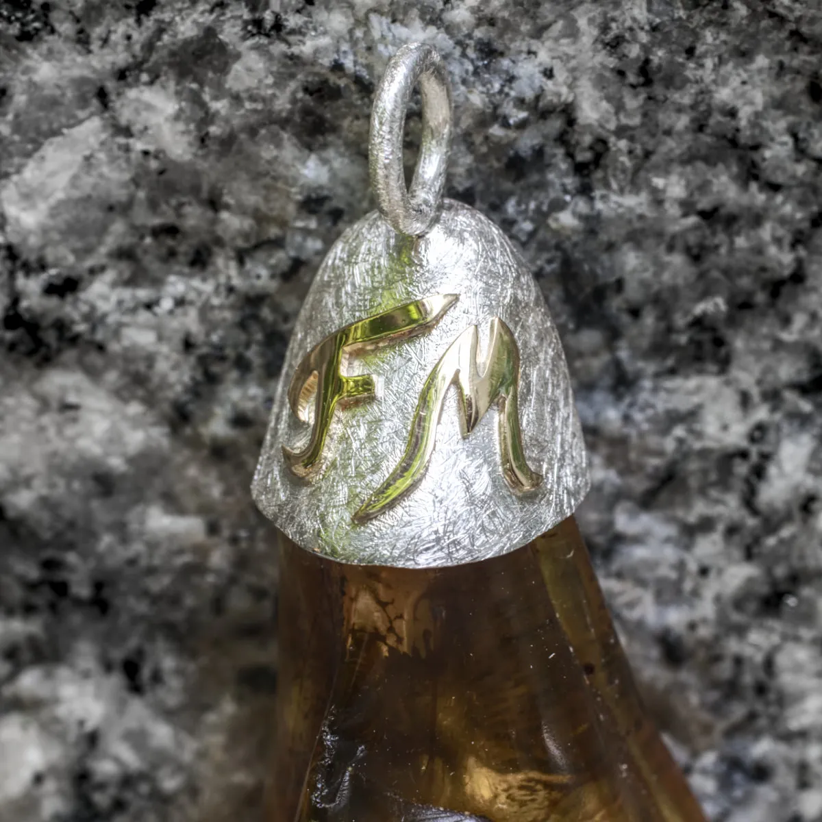 Fassung aus Silber für einen Bernstein mit aufgesetzten Initialen aus Gelbgold