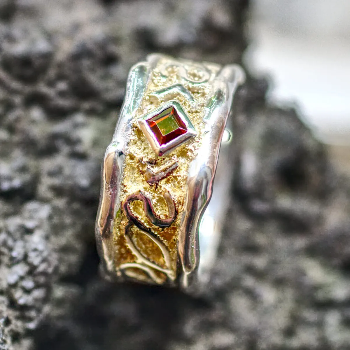 Silberring mit Schmorrand und keltischem Flechtband mit eingeschmolzenem Gelbgoldstaub und