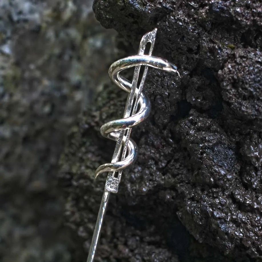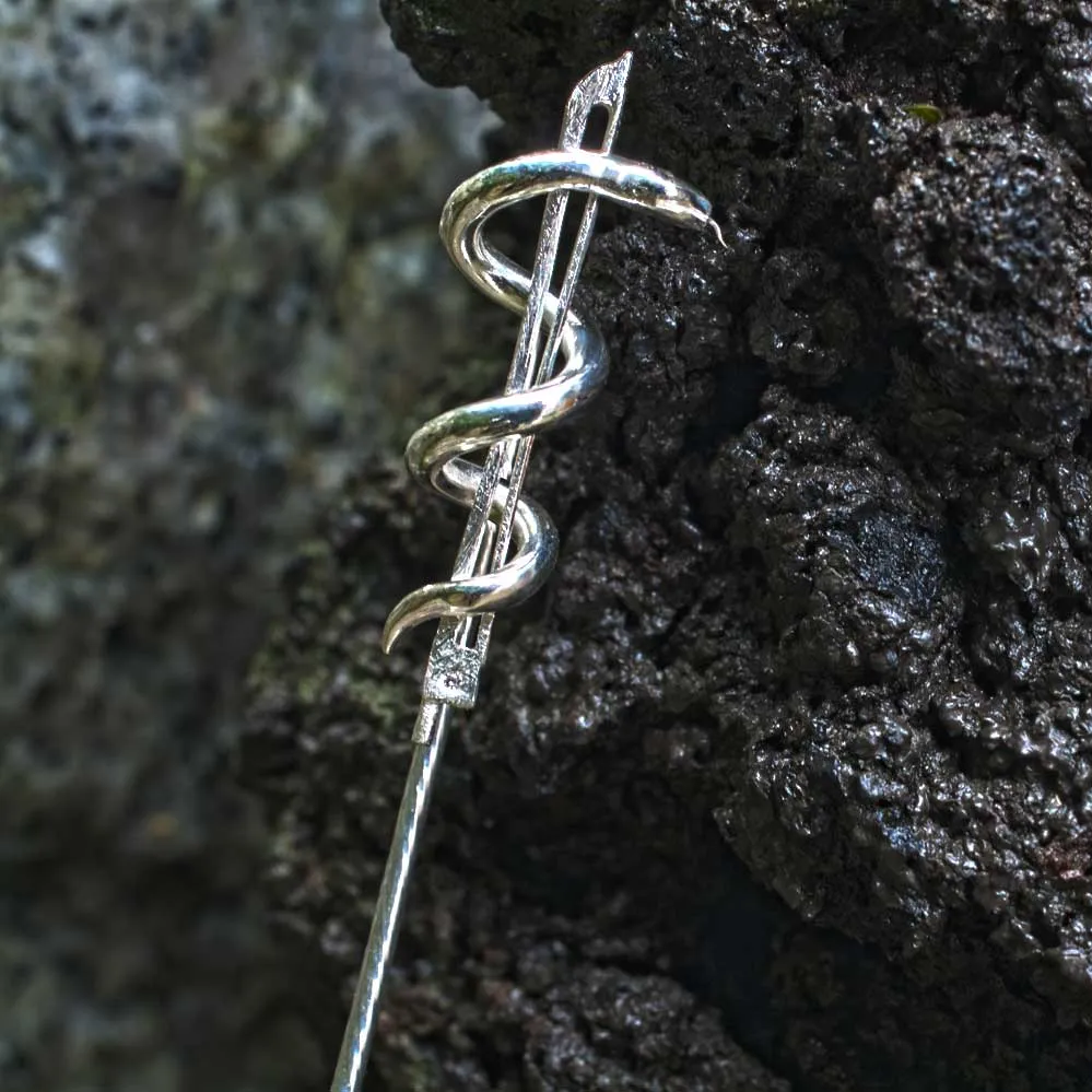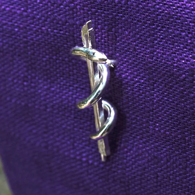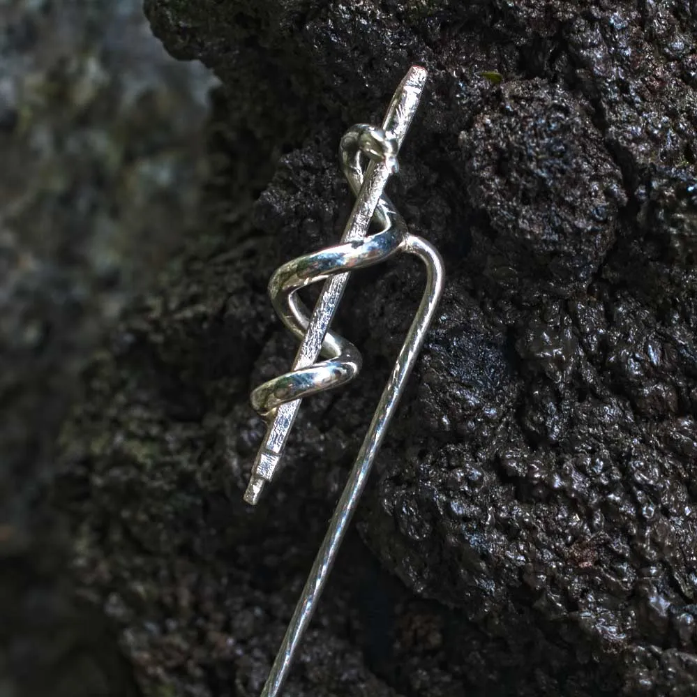 Anstecknadel Silber , dreidimensionale Darstelllung einer Aeskulabnatter, die sich um einen Geigenbogen windet.