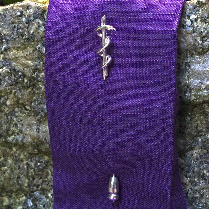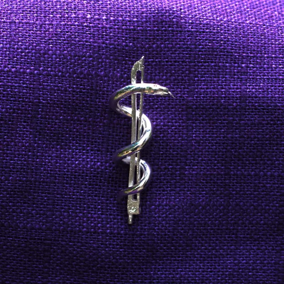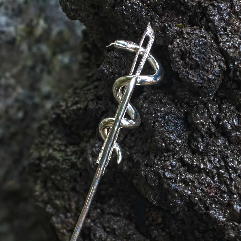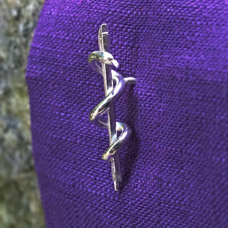 Anstecknadel Silber , dreidimensionale Darstelllung einer Aeskulabnatter, die sich um einen Geigenbogen windet.