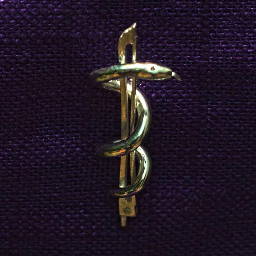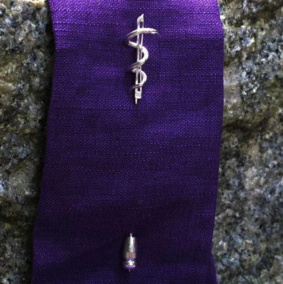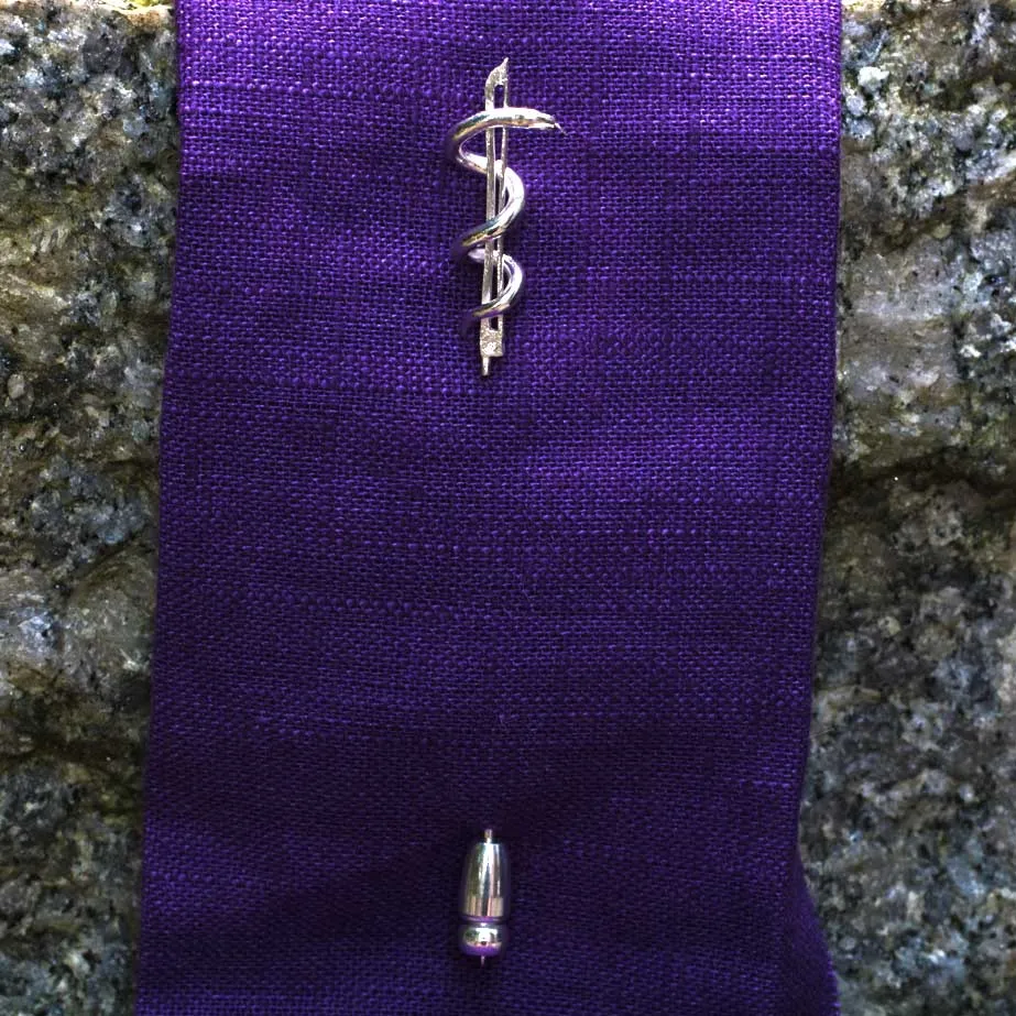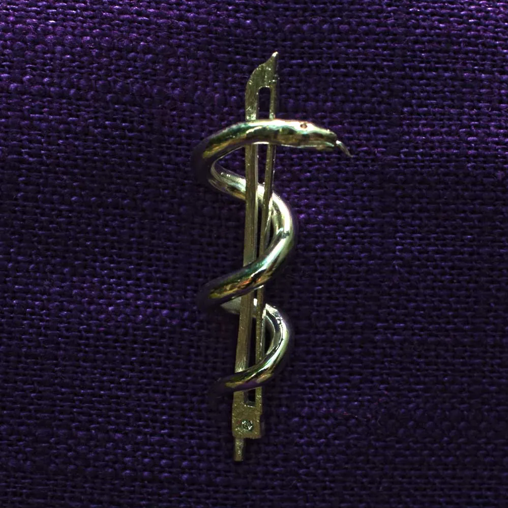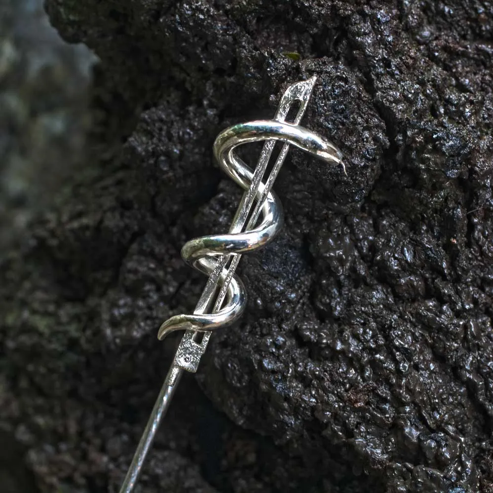 Brosche und Anstecknadel mit Aesculabnatter aus Silber die sich um einen Geigenbogen windet in dem ein kleiner Brillant sitzt.