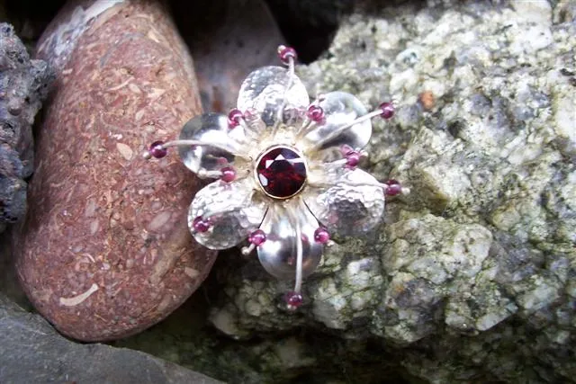 Silberring mit ziselierter, aufgesetzter Blume, mittig ein Granat in Zargenfassung, Pollenfäden aus Silbesaite mit Granat-Kügelchen