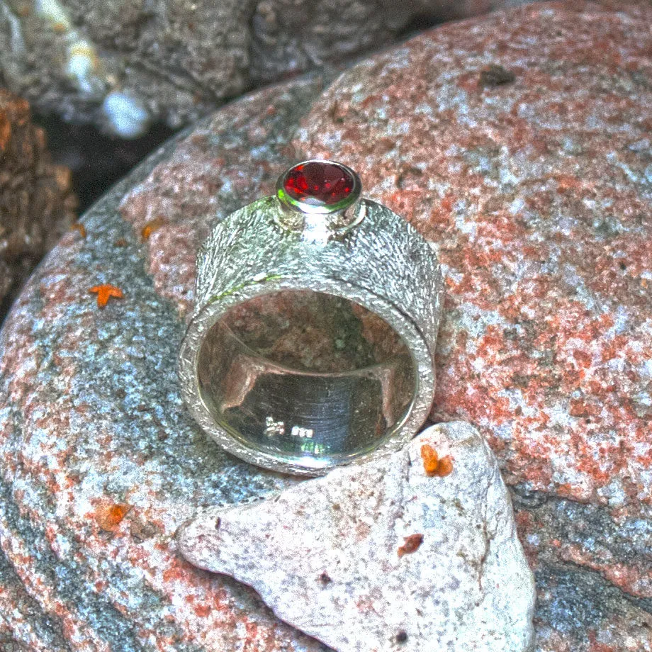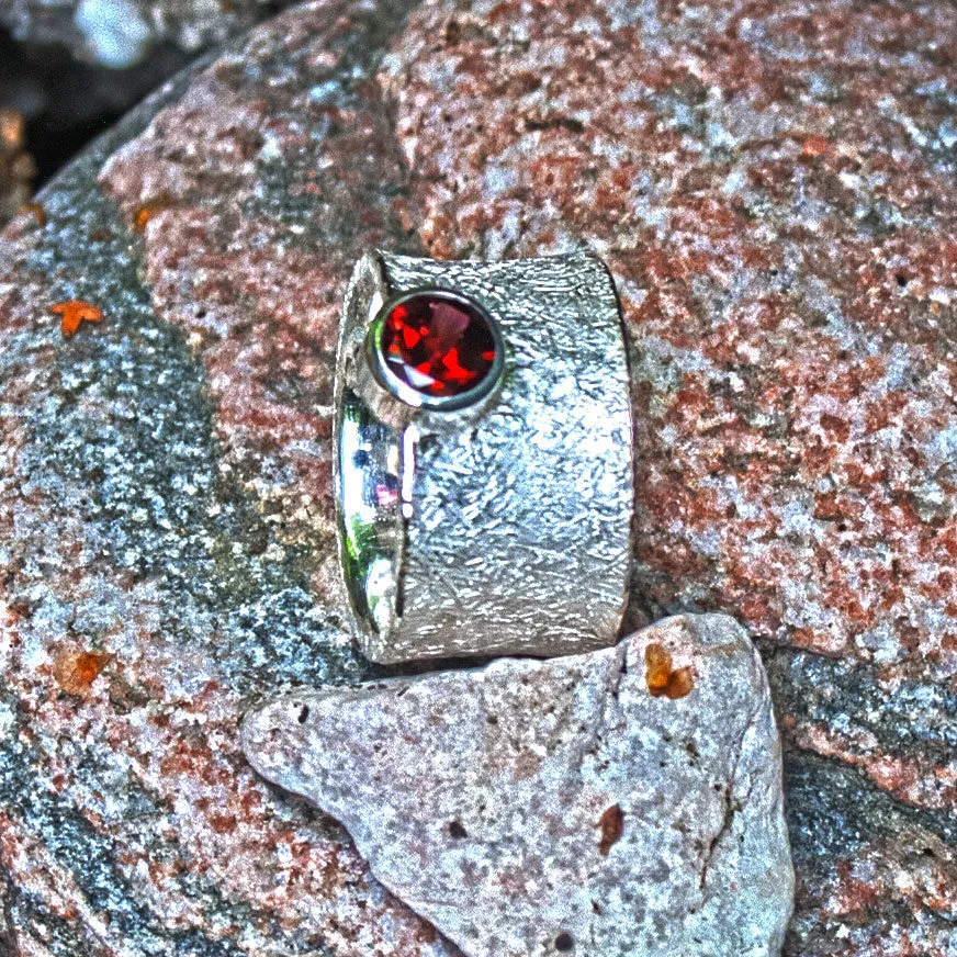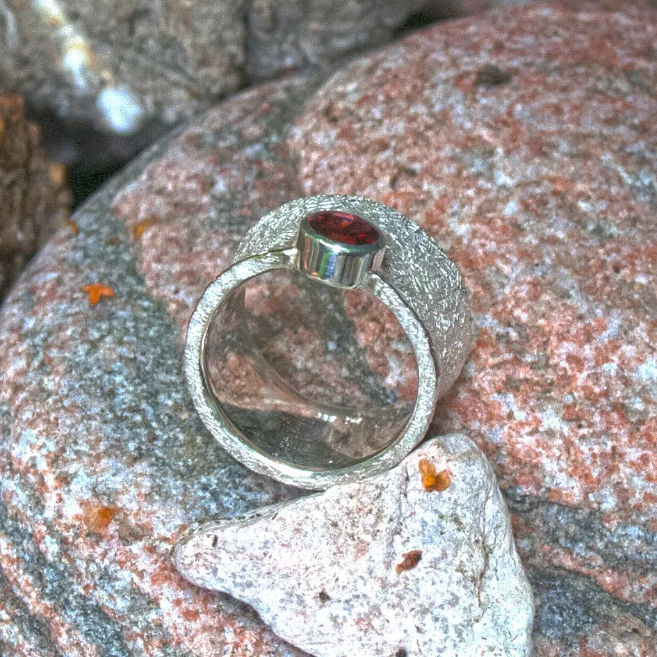 konkaver breiter Silberring mit angesetztem Granat in Zargenfassung