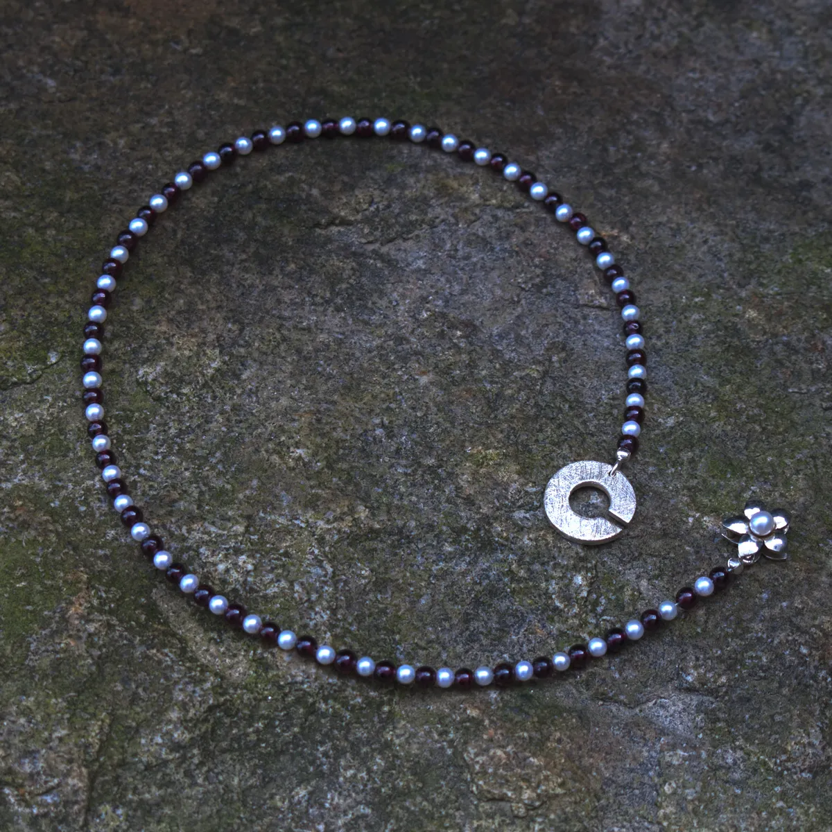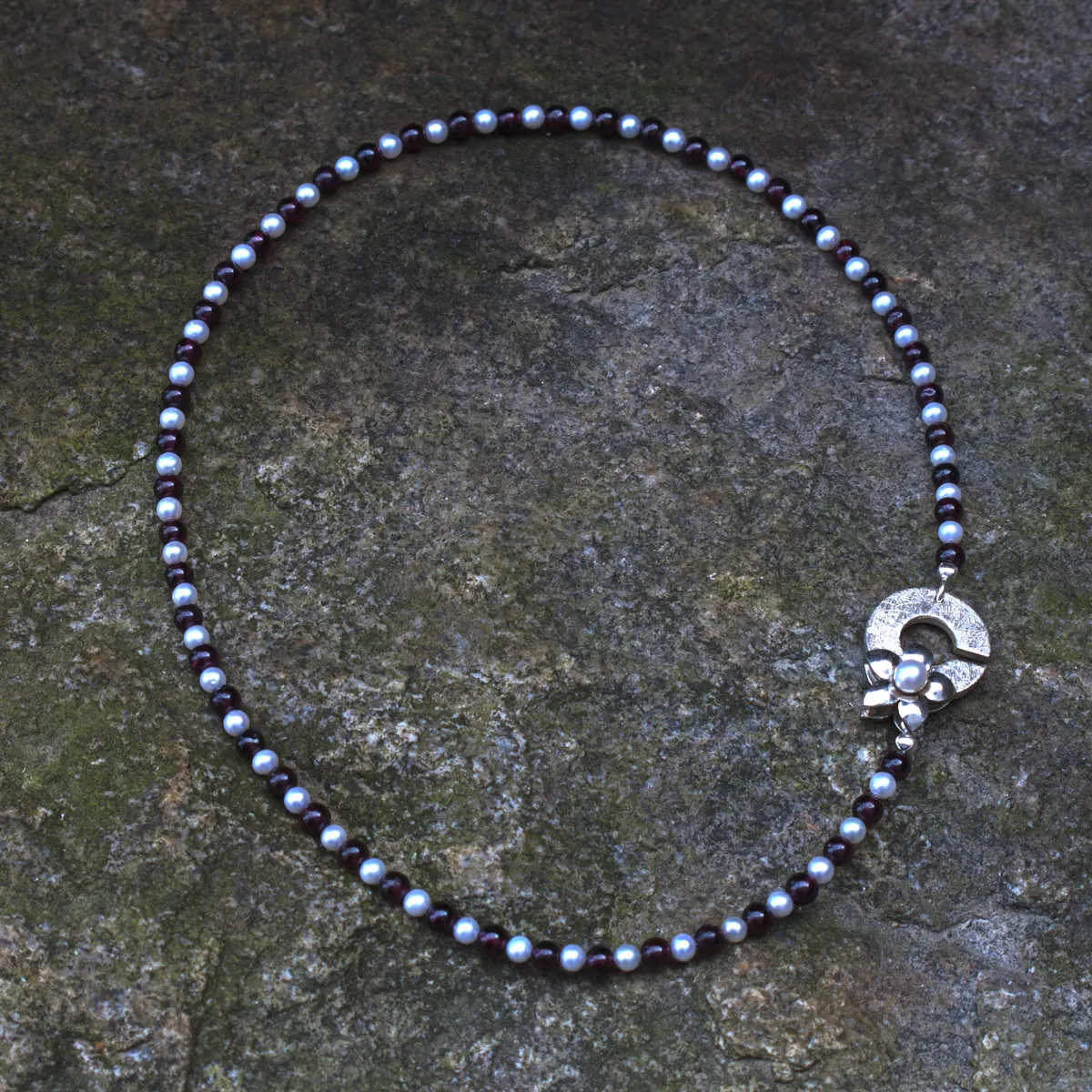 Collier aus Granatkugeln und Süßwasserzuchtperlen mit Silberschließe in Blumenform