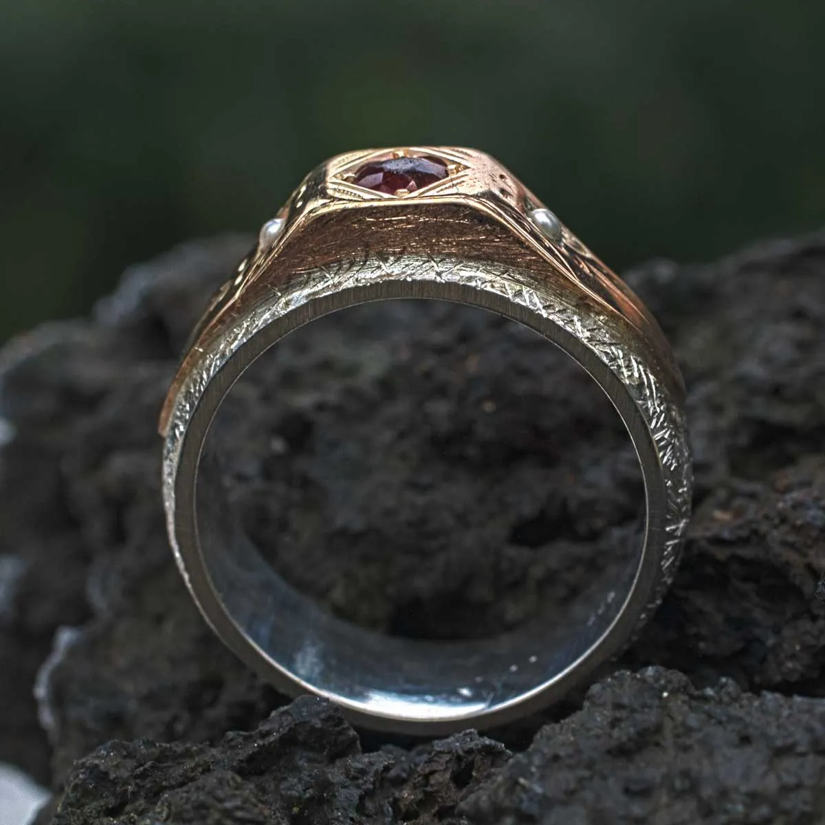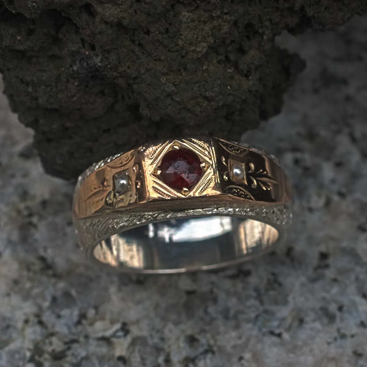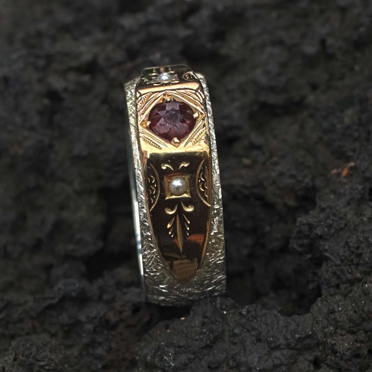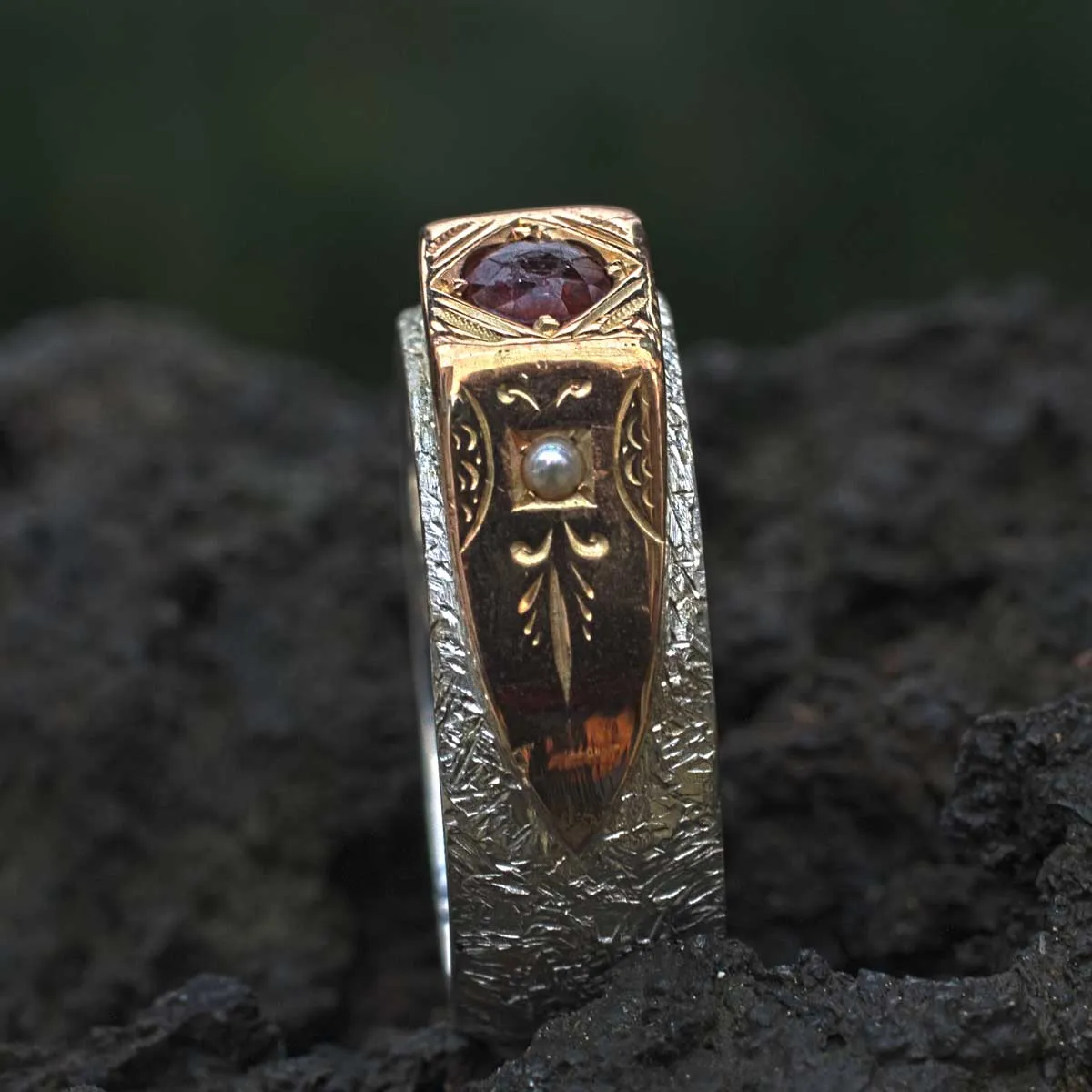 Erbstück Ring aus Gelbgold mit Perlen un Granat als Aufsatz auf einem breiten Silberring mit Hammerschlag Oberfläche
