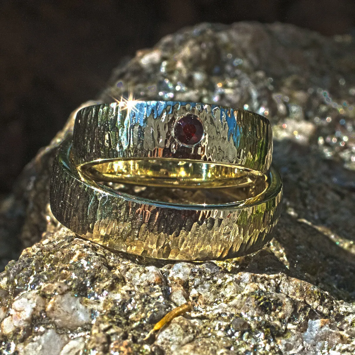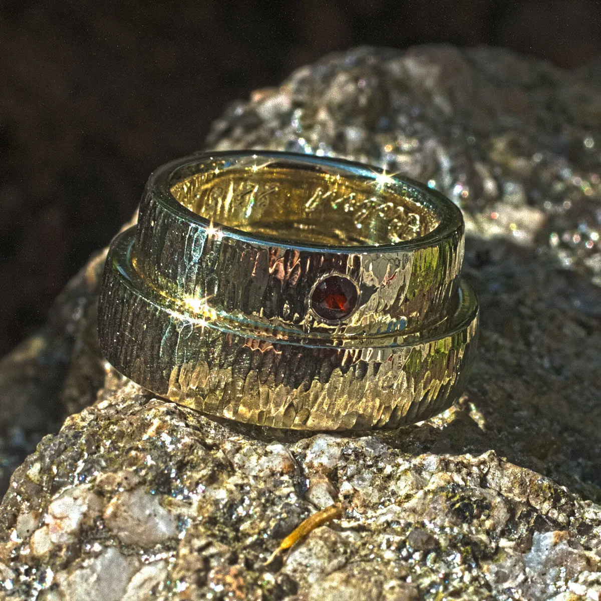 Trauringe Grüngold mit Hammerschlag Finne, Damenring mit eingeriebenem Granat