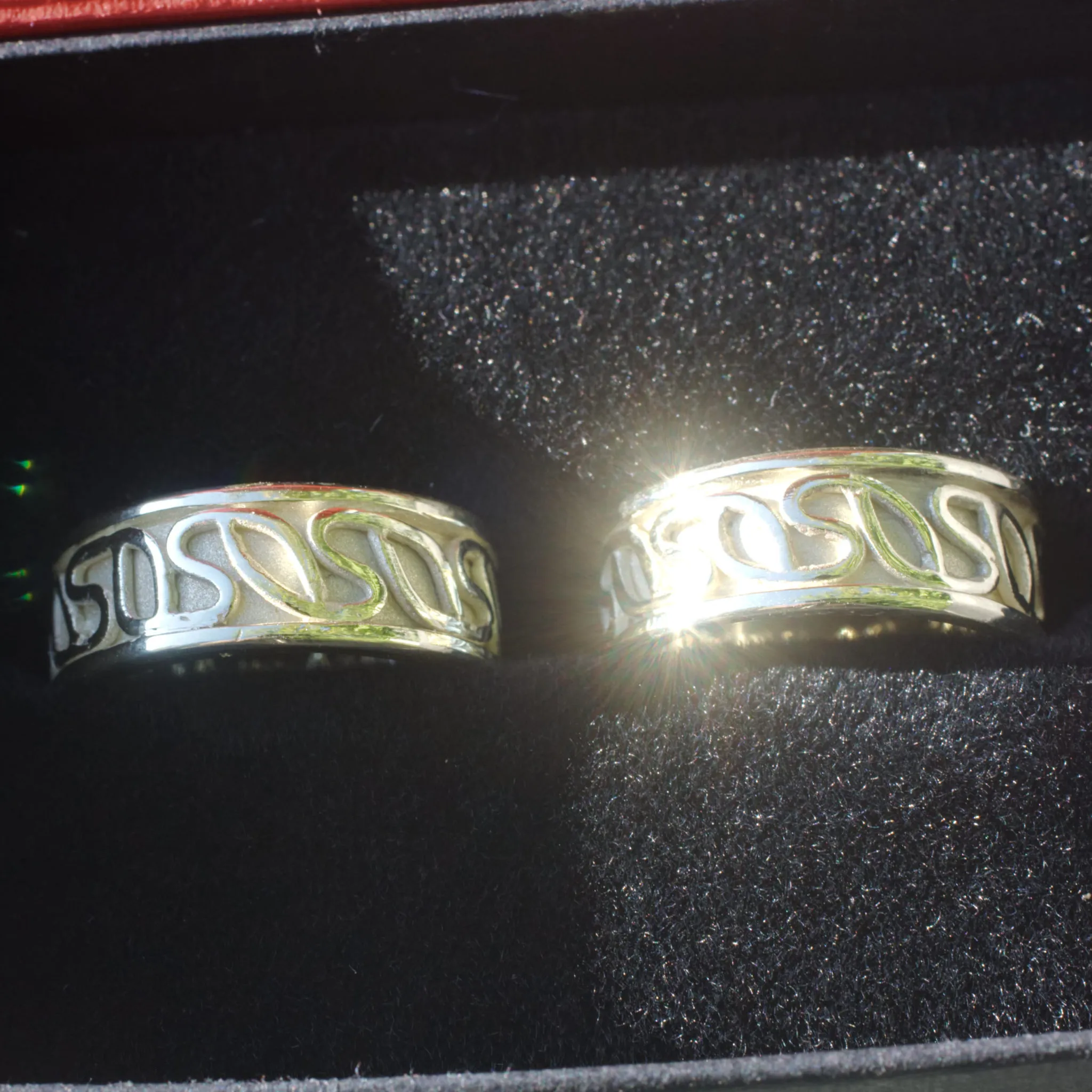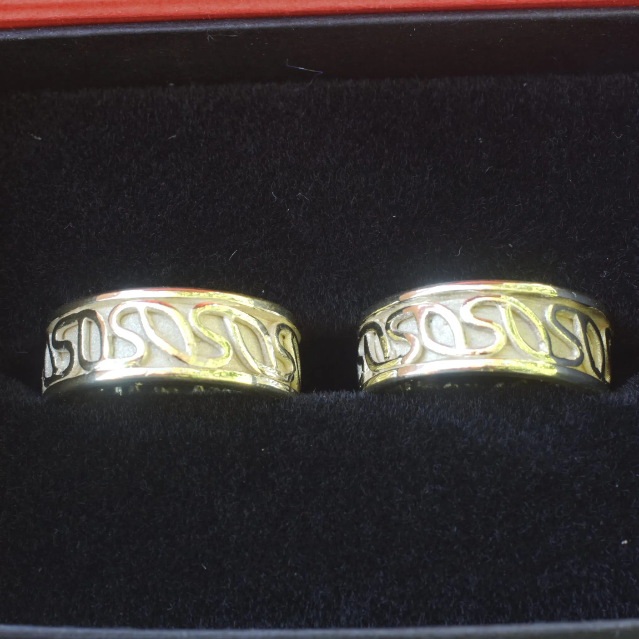 Trauringe aus 646 Grüngold mit poliertem keltischem Ornament auf sandgestrahltem Untergrund