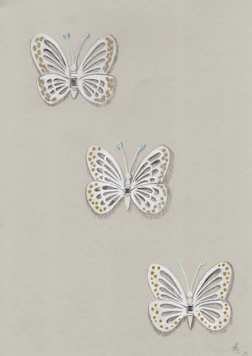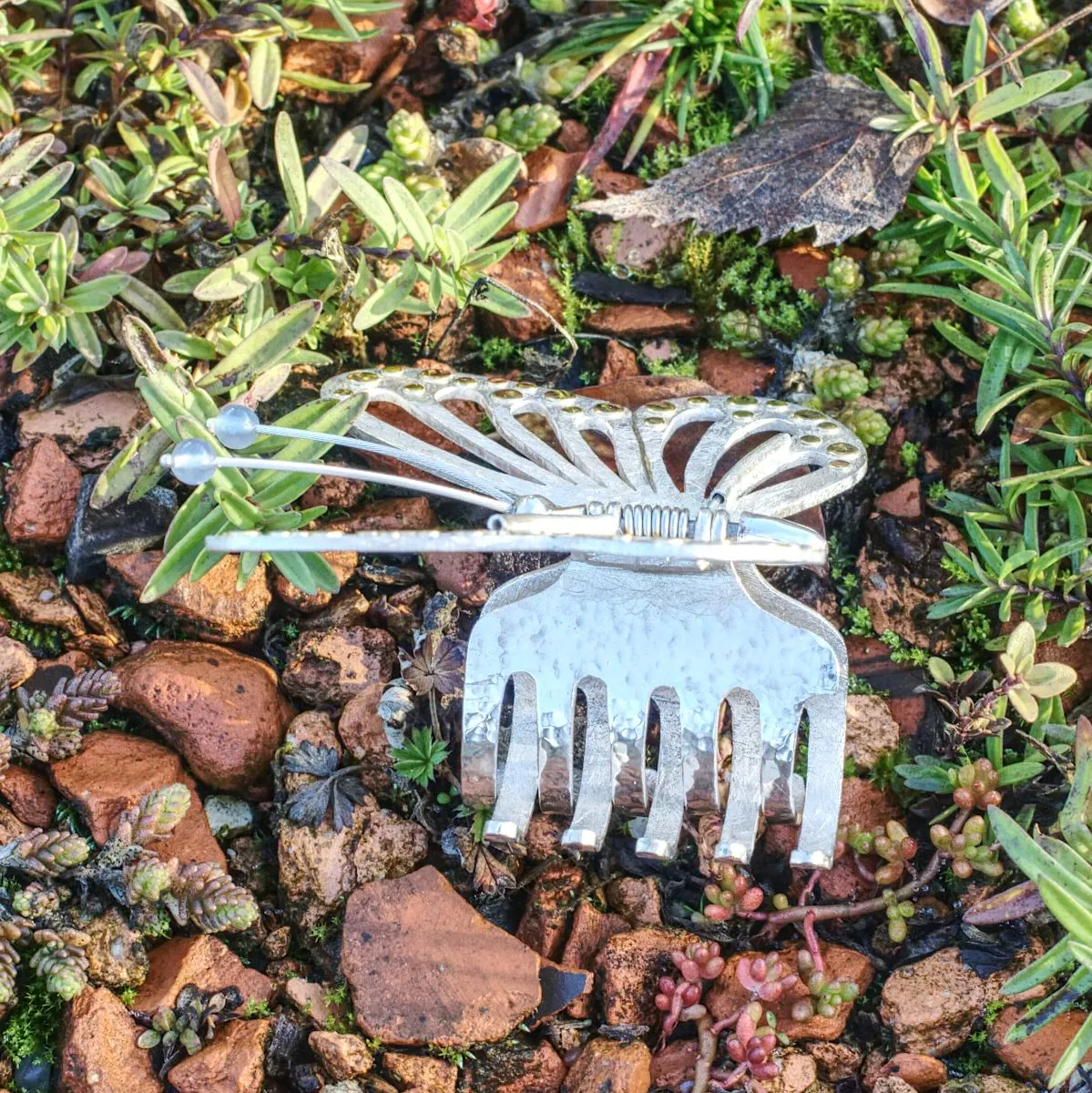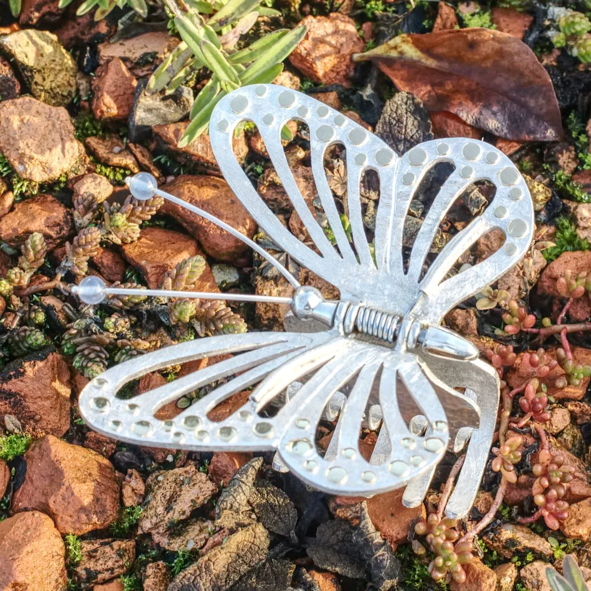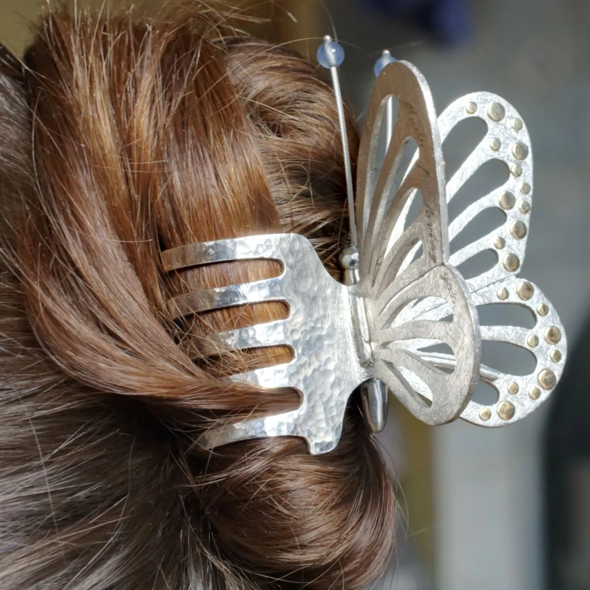 Haarklammer in Form eines silbernen Schmetterlings mit runden durchbrochenen Flügeln und