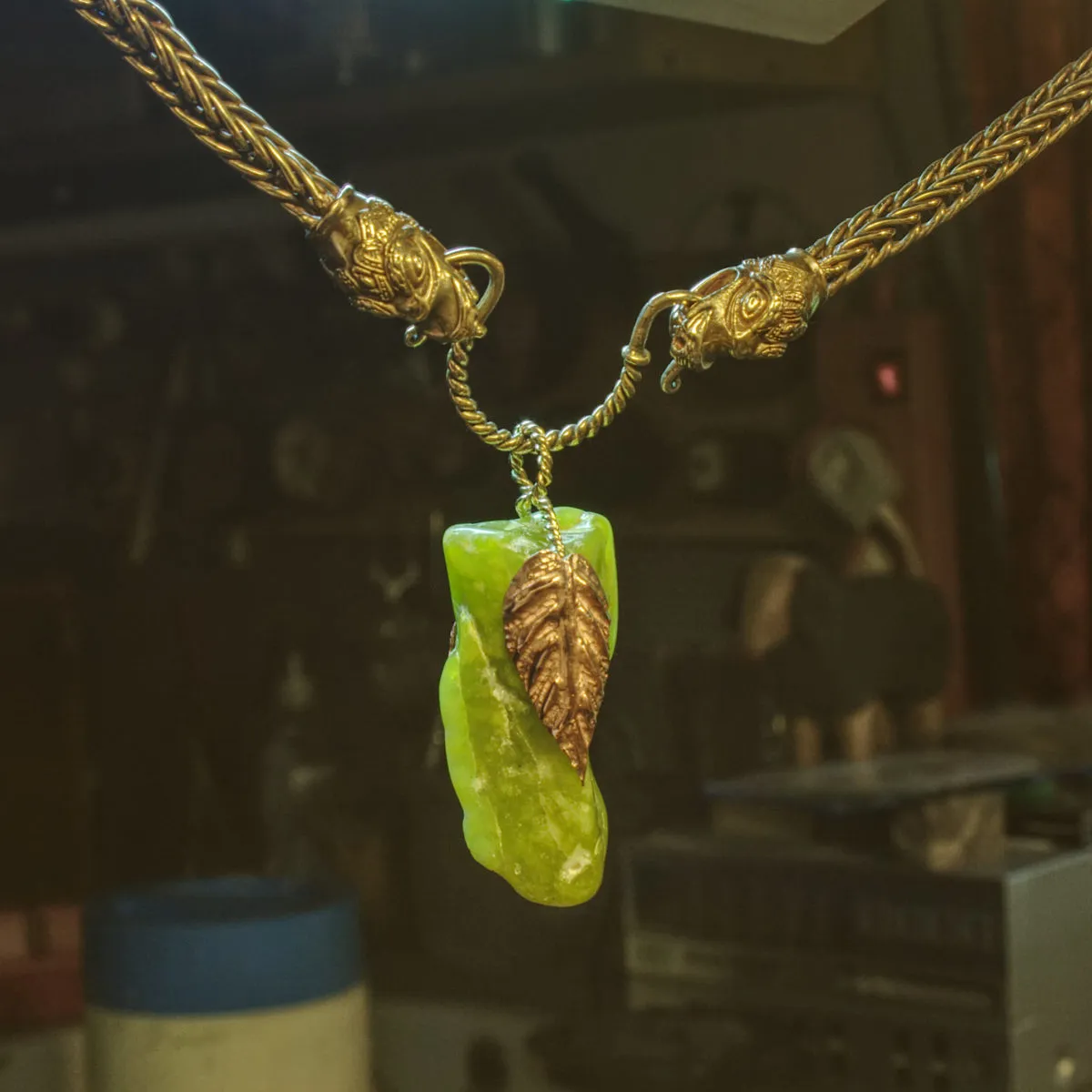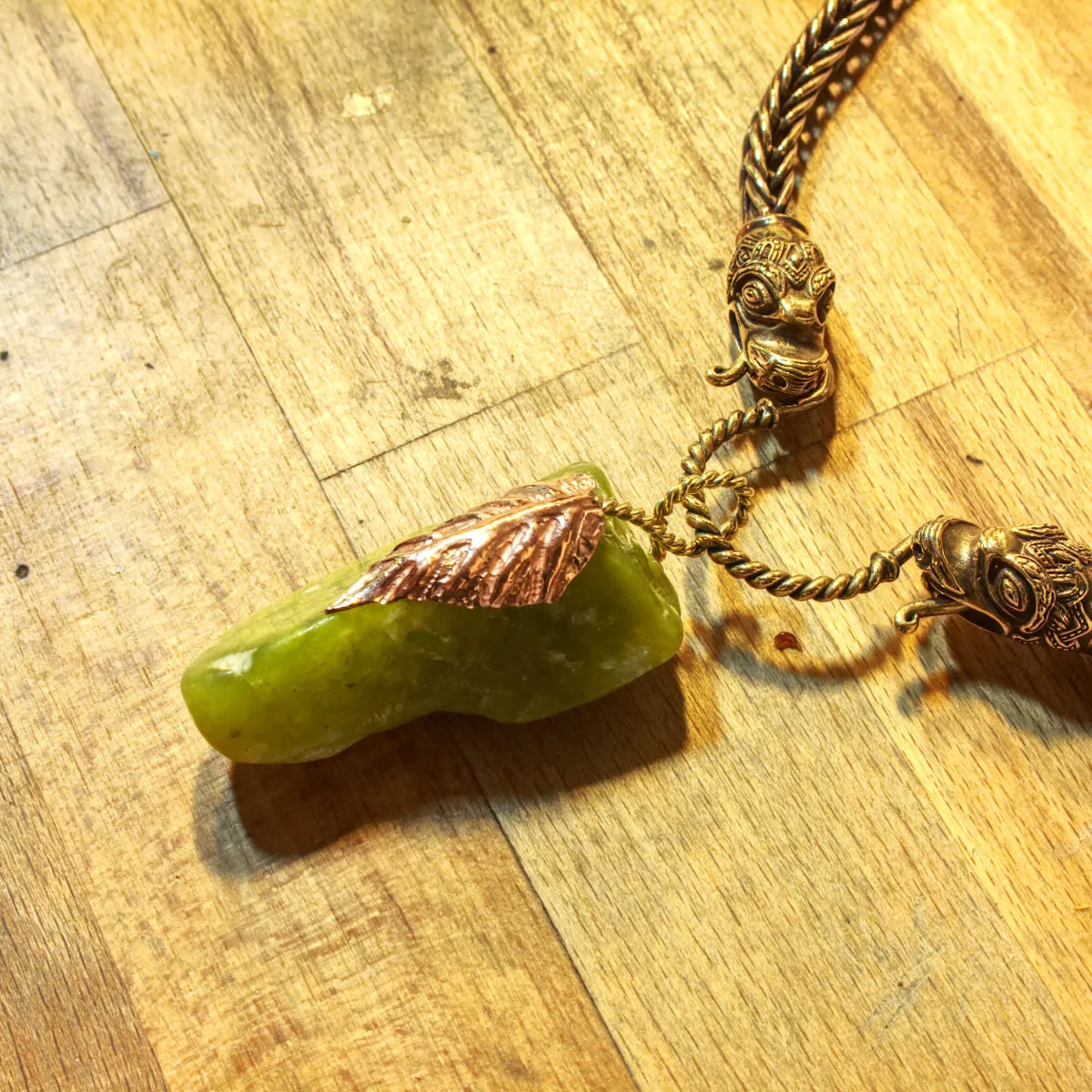 Jade gefasst in zwei ziselierten Silberblättern verbunden mit einer Silberkordel als Anhänger