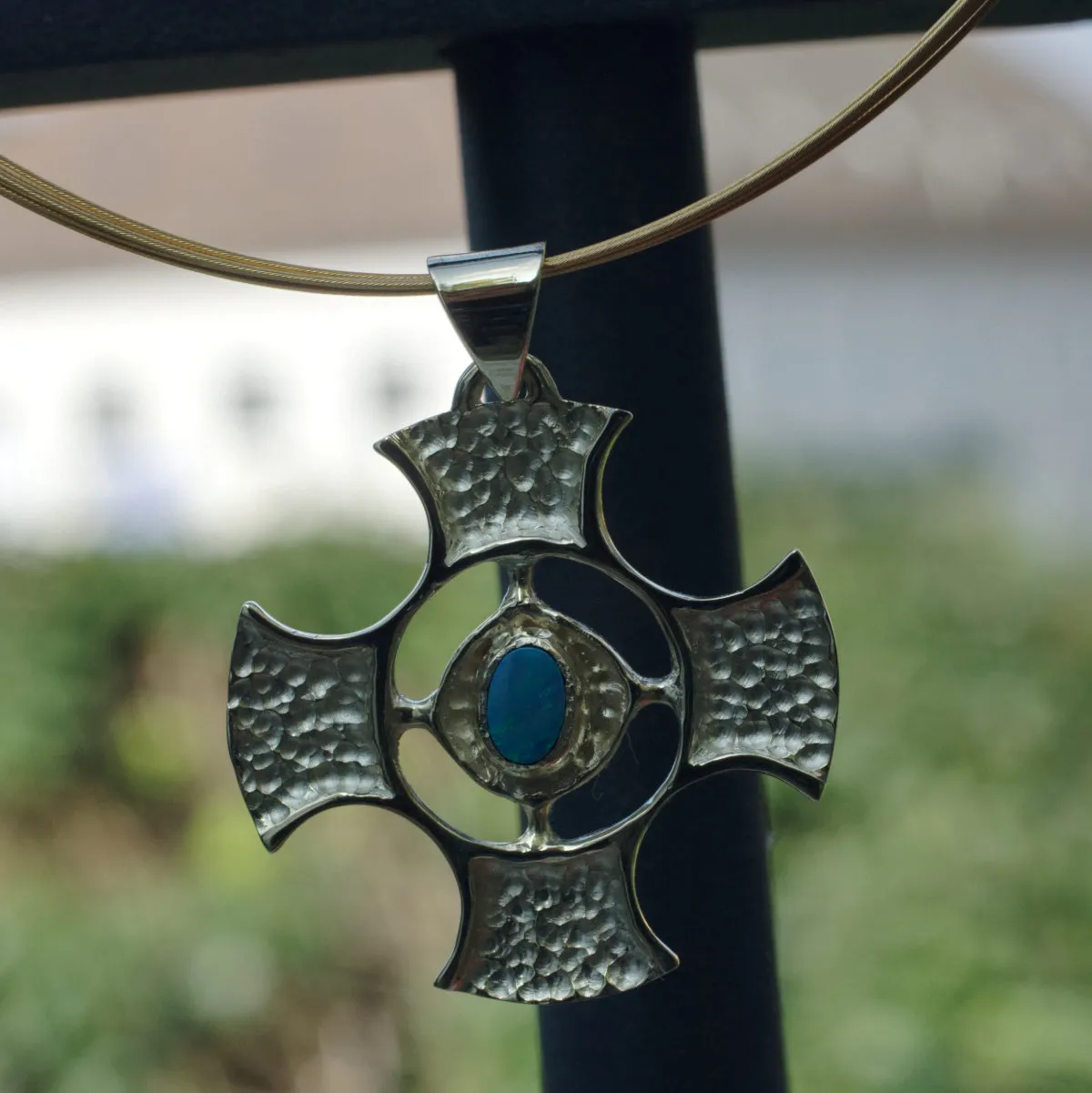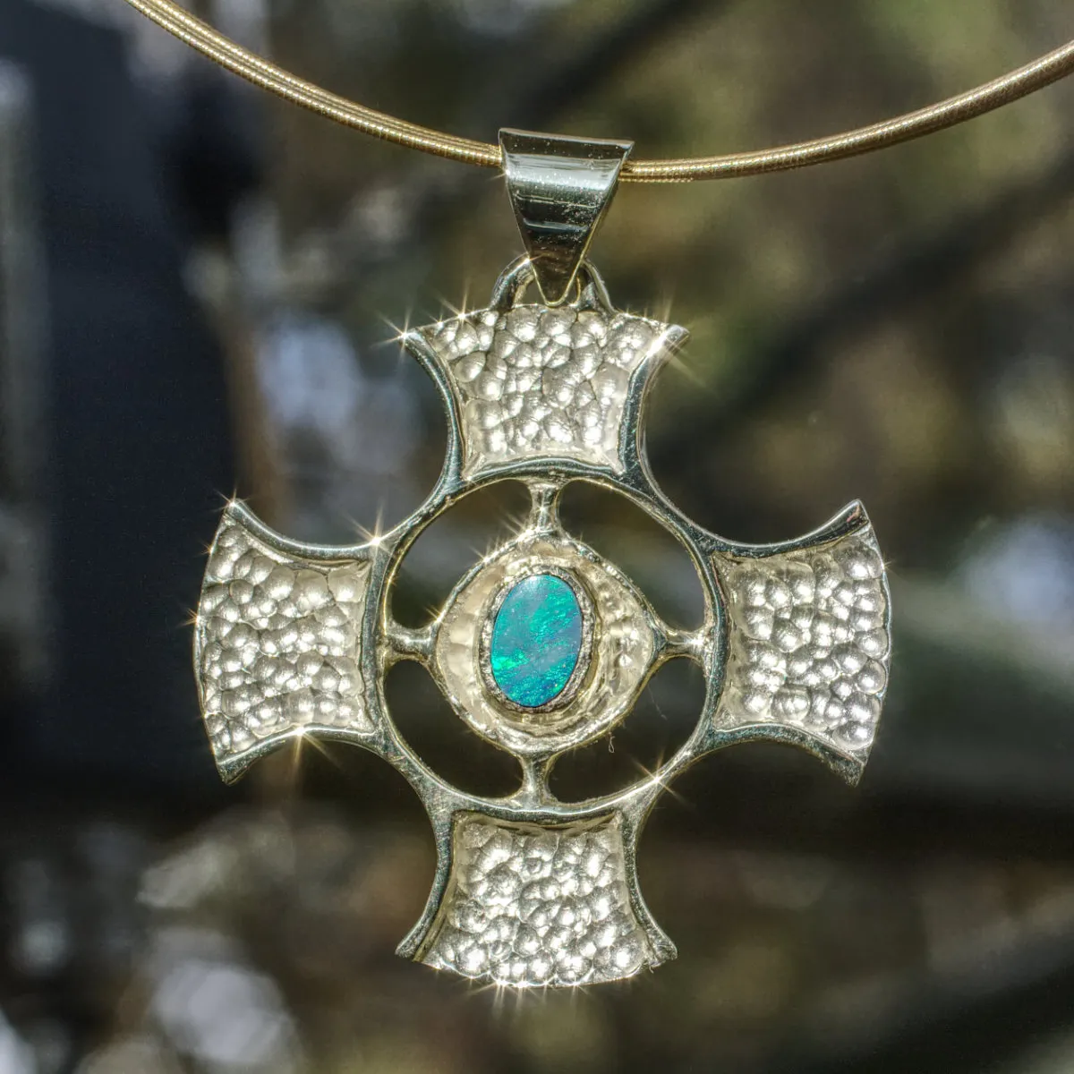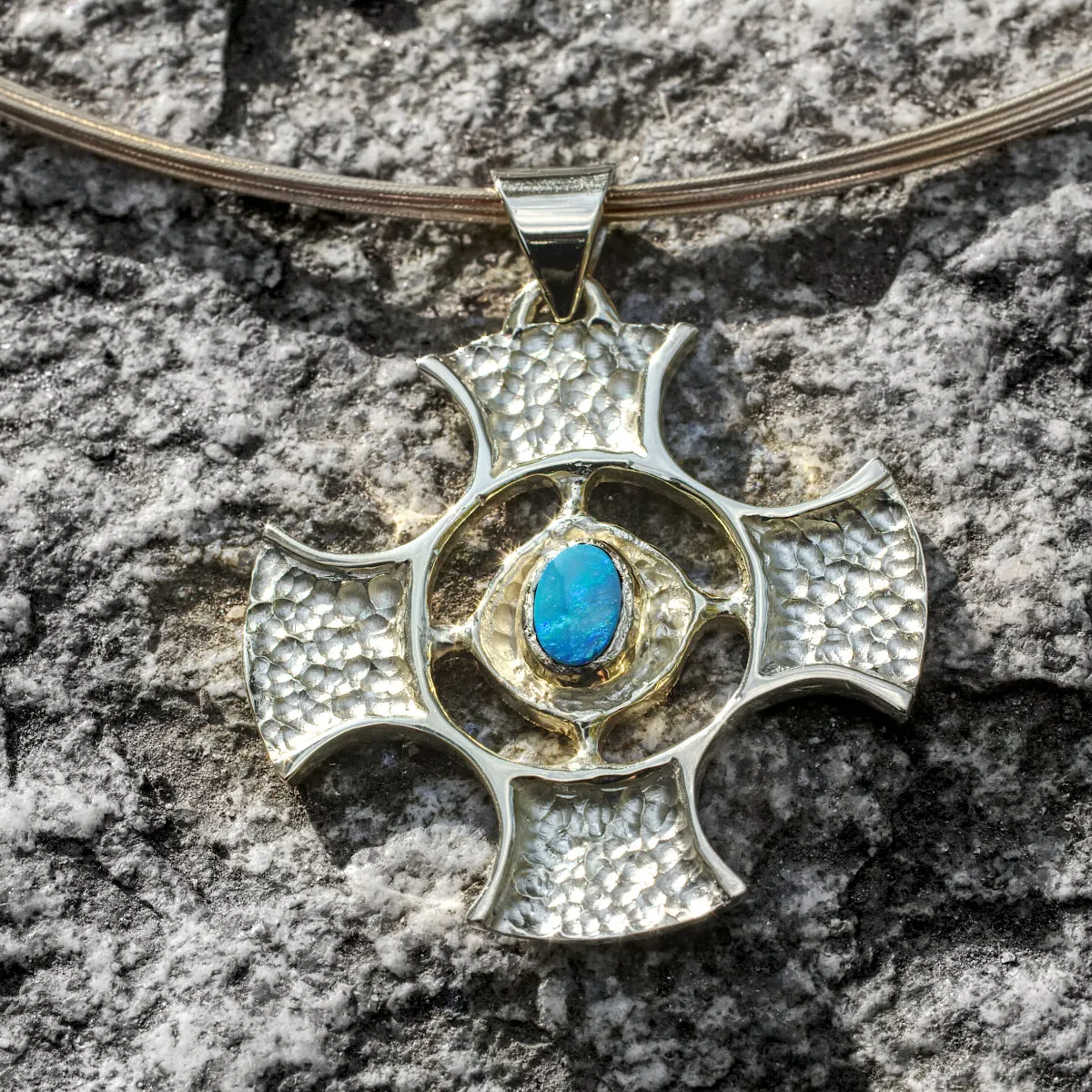 ovaler dunkler Opal in Zargenfassung in der Mitte des Kreuzes