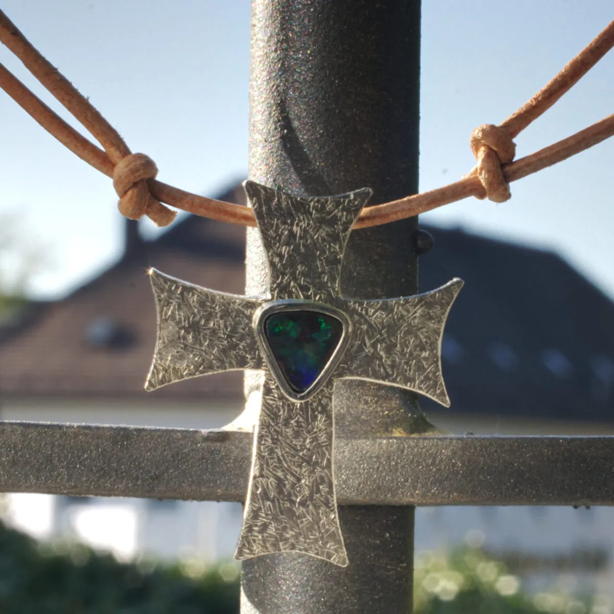 Silberkreuz mit runder Hammerschlagoberfläche und boulderopal in Zargenfassung