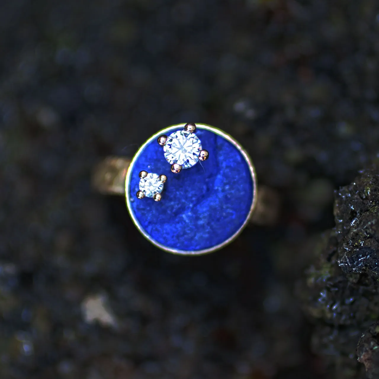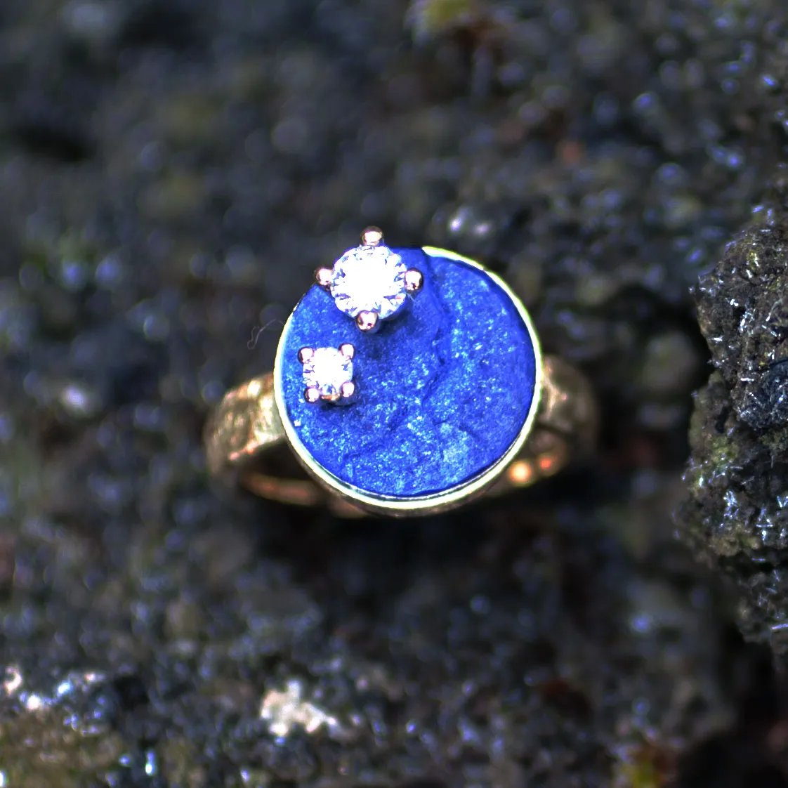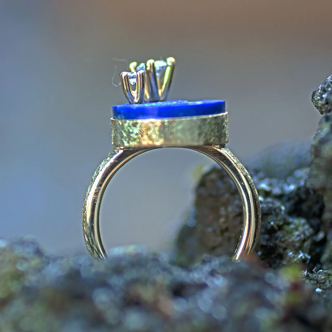 Gelbgoldring mit strukturierter Kreisplatte aus Lapislazuli in Zargenfassung mit zwei aufgesetzten, verschraubten Krappenfassungen mit Brillanten