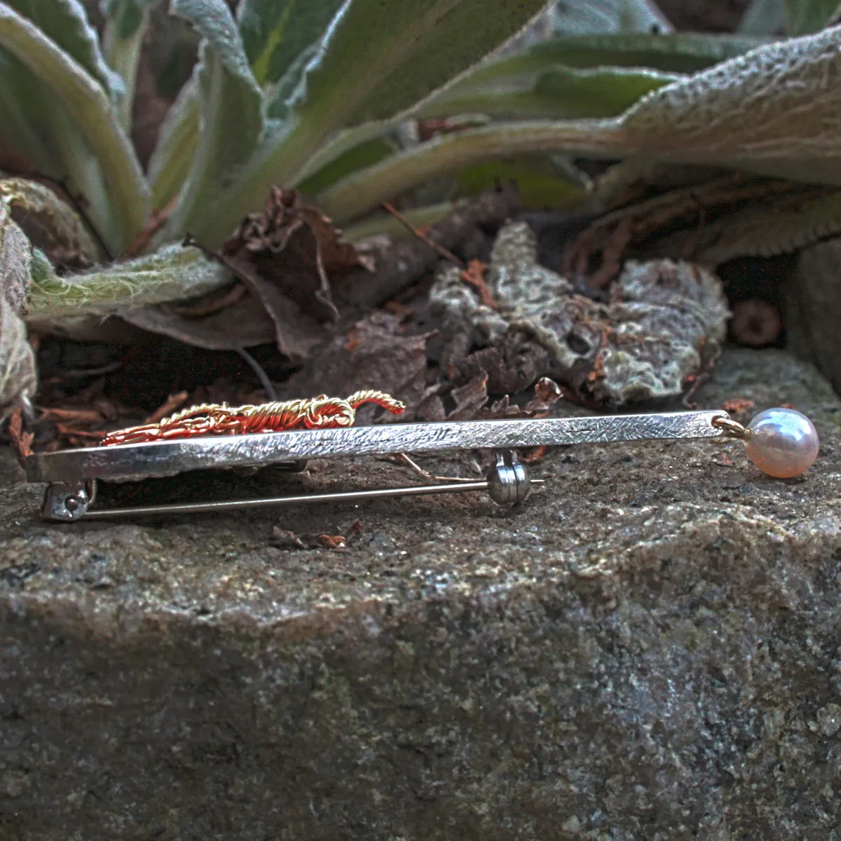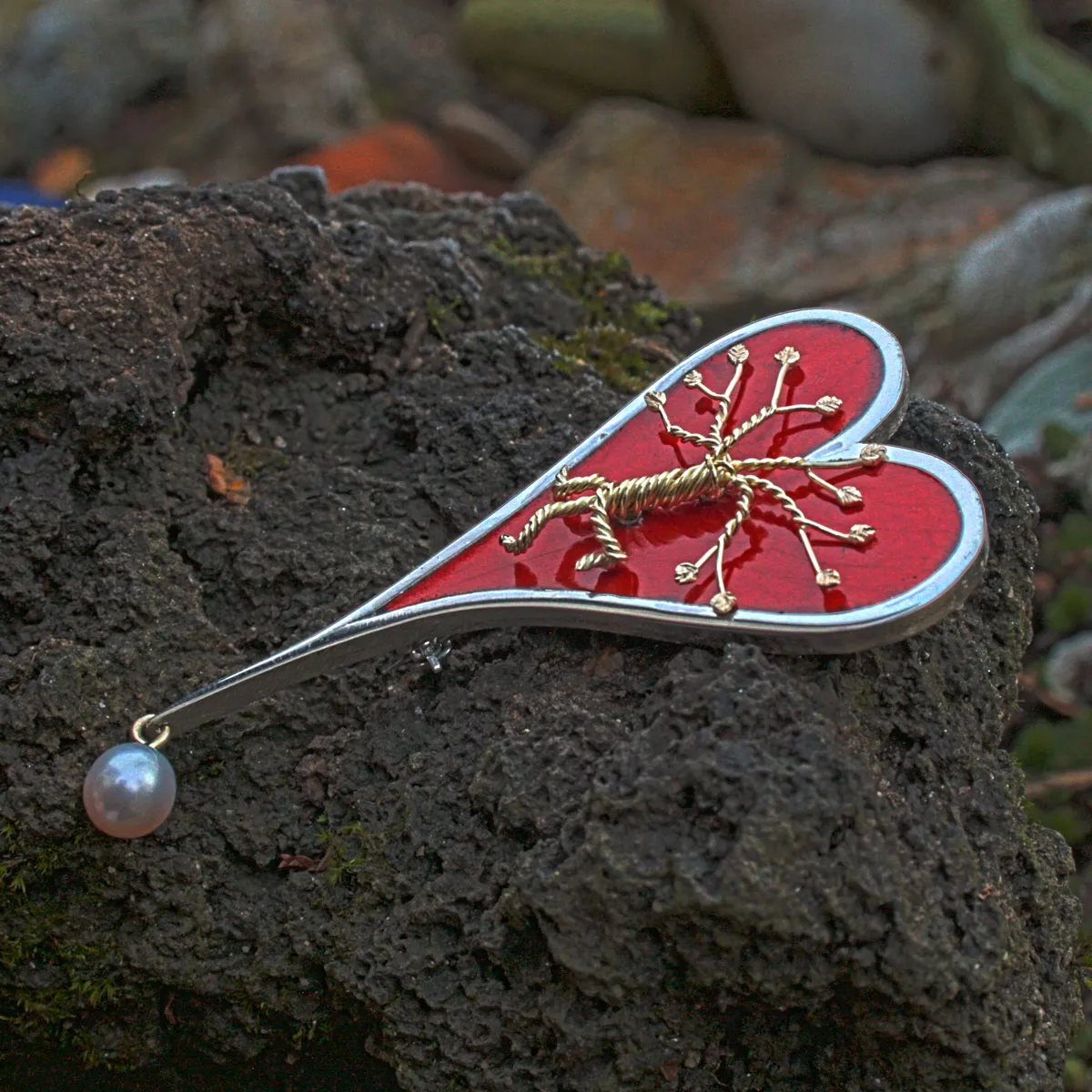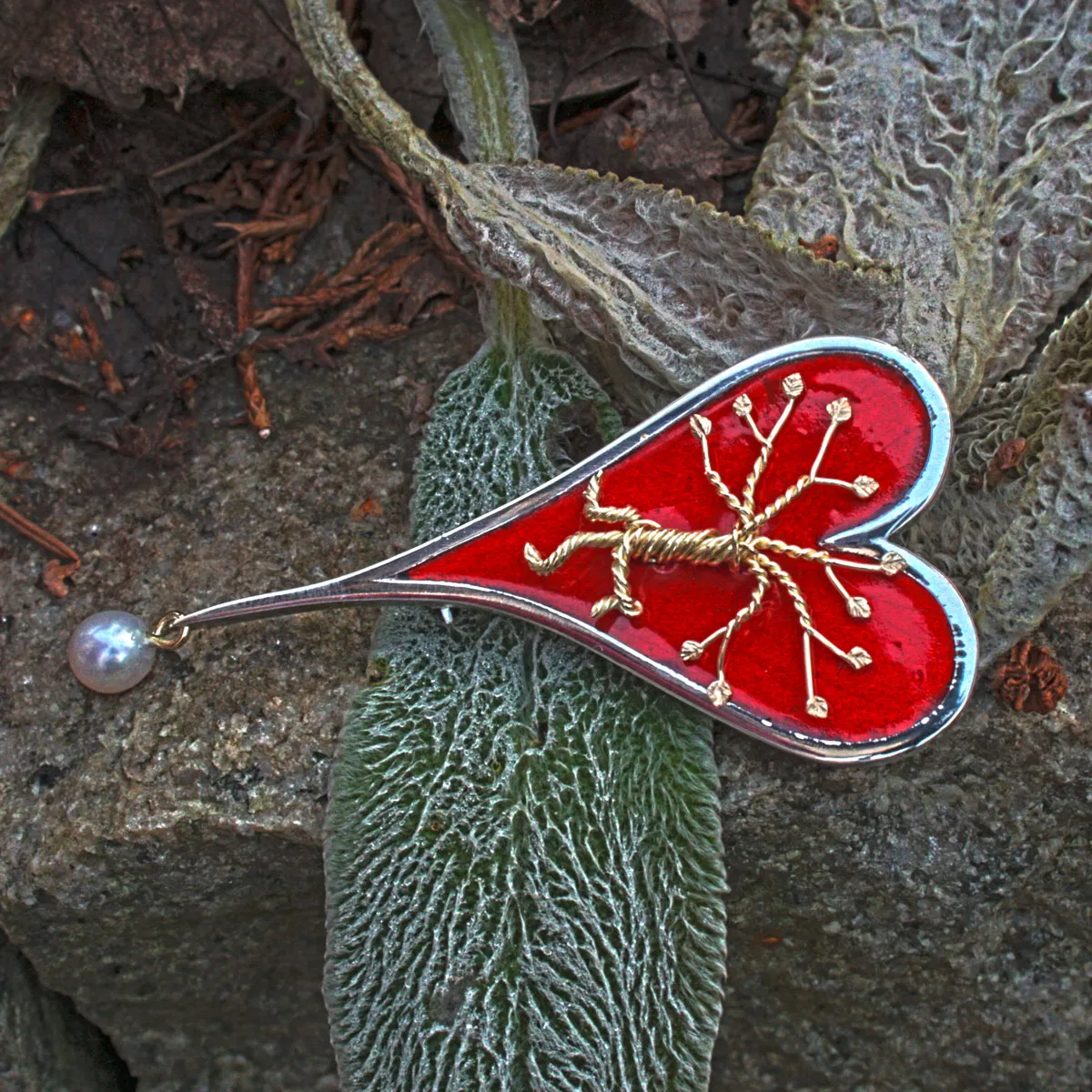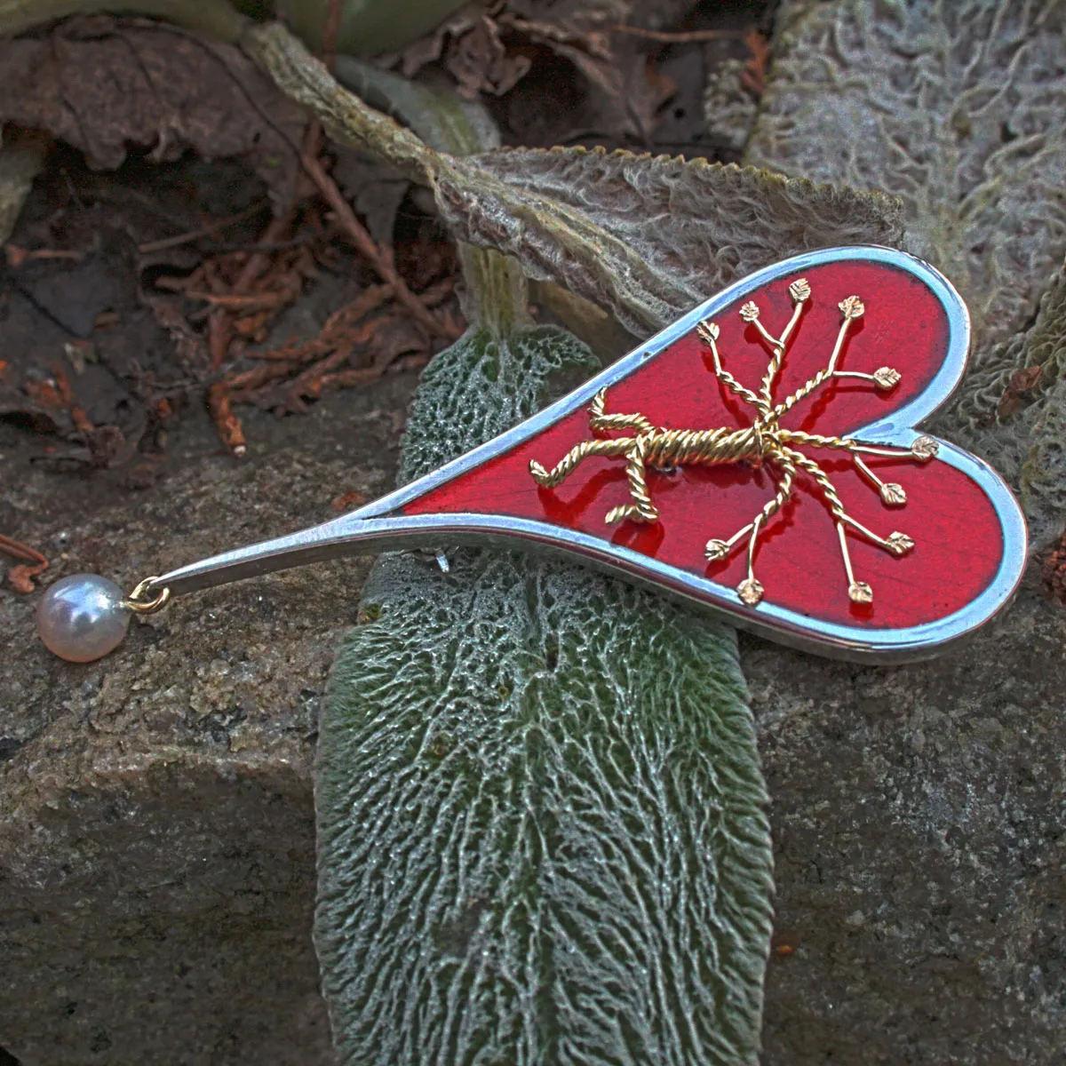 herzförmige Silberbrosche mit rotem Emaille und aufgesetzem goldenen Lebensbaum