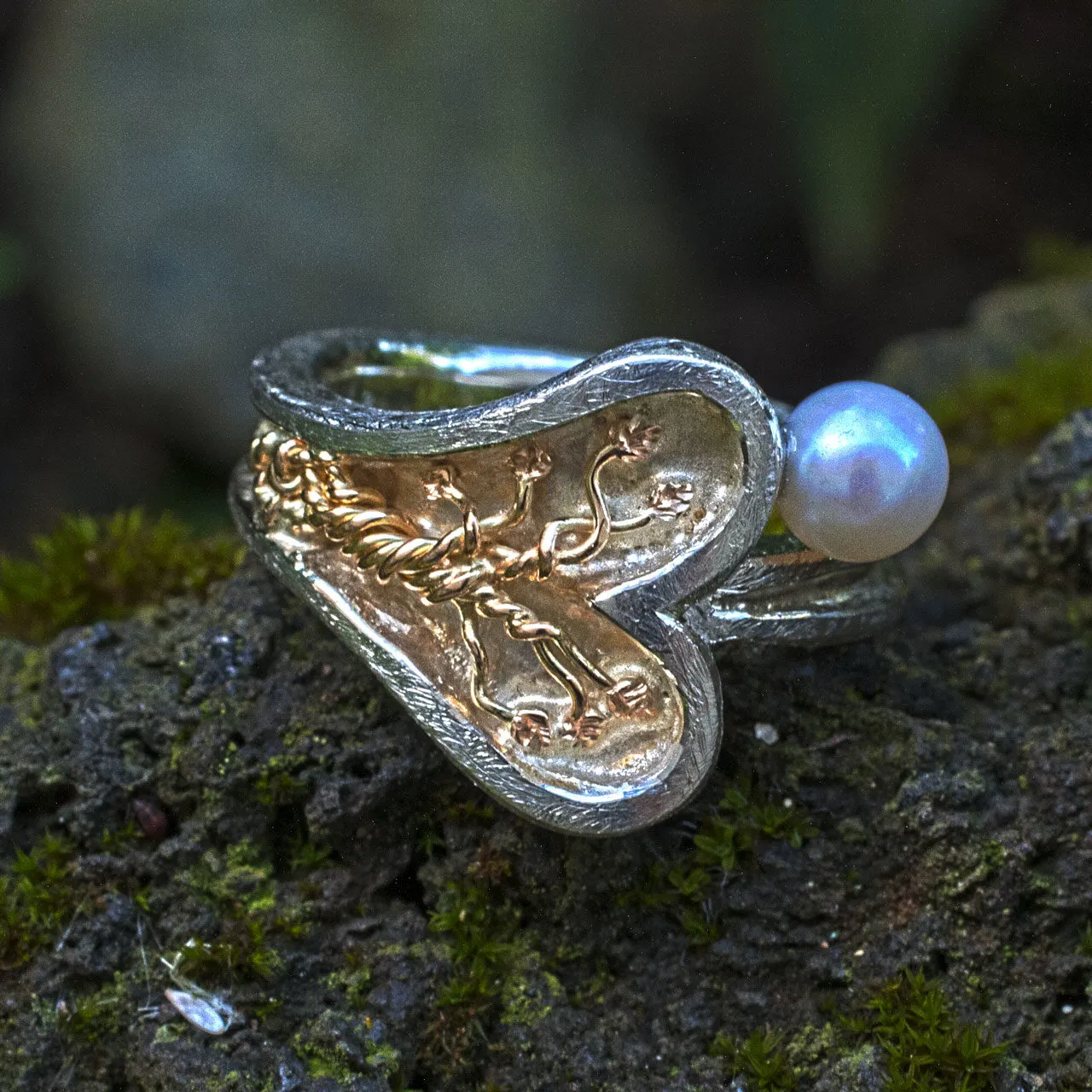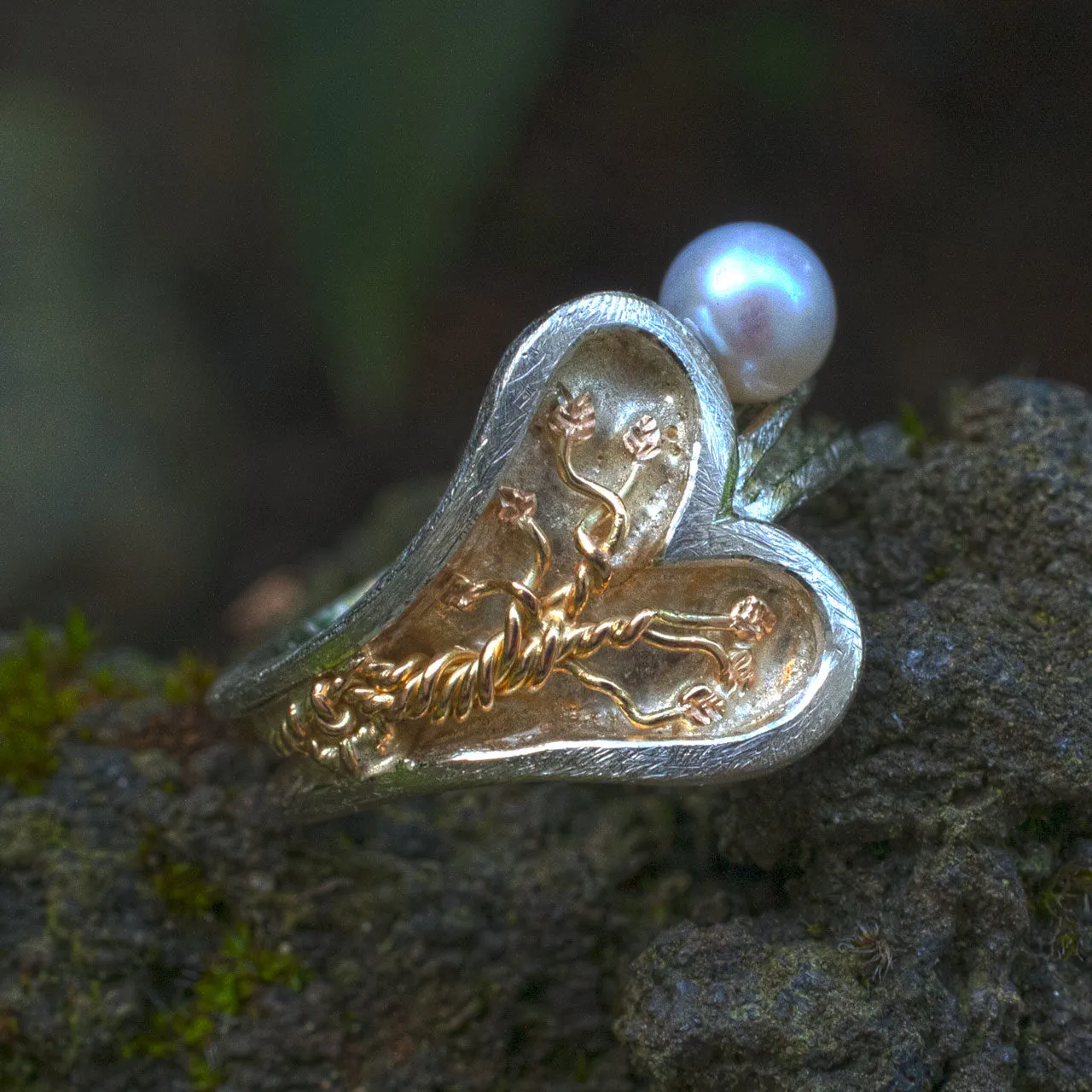 Silberring in Herzform mit aufgesetztem goldenen Lebensbaum und angesetzter Perle