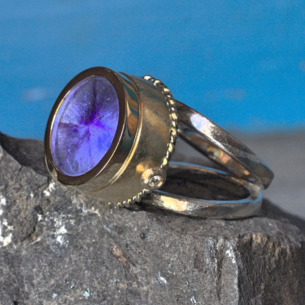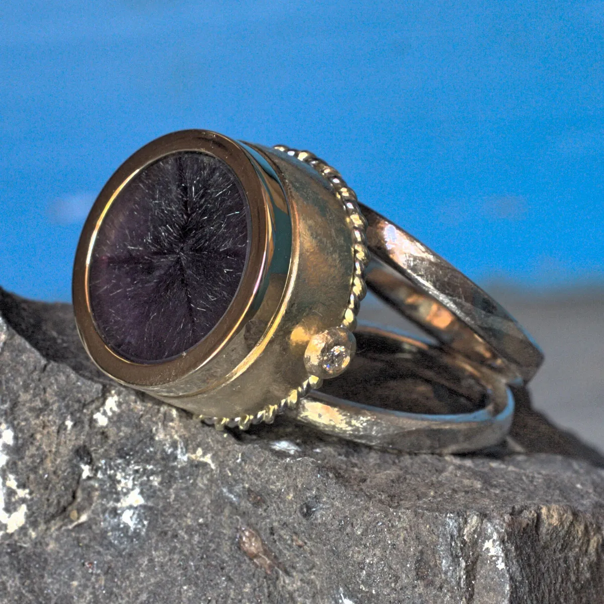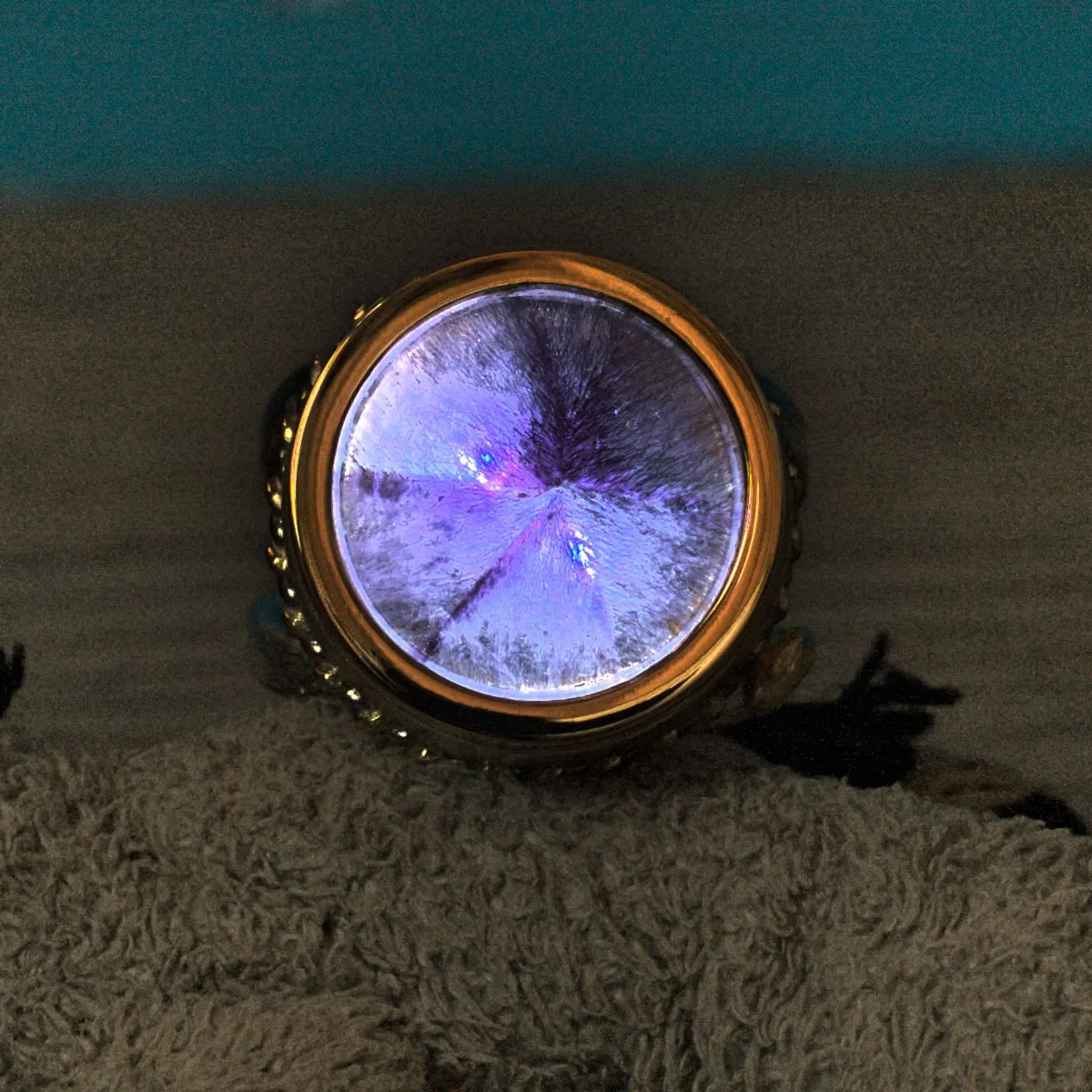 V-Schiene aus Silber-Palladium Kordeln mit aufgesetzter Schale in Silber, aufgesetzte Goldzarge mit Cacoxonith in Amethyst, eingebaute LED-Beleuchtung durch drehen des Steins ein- und auschaltbar