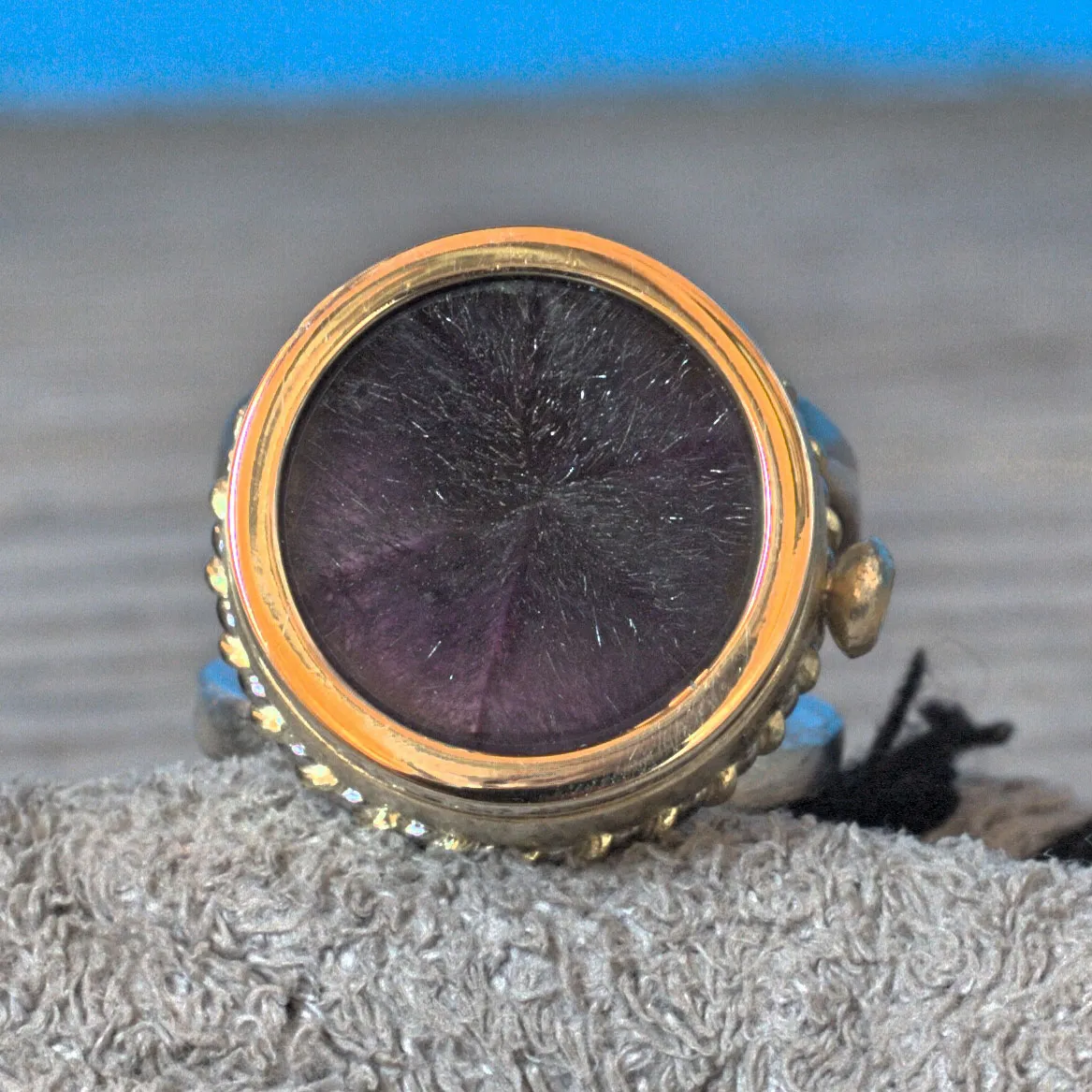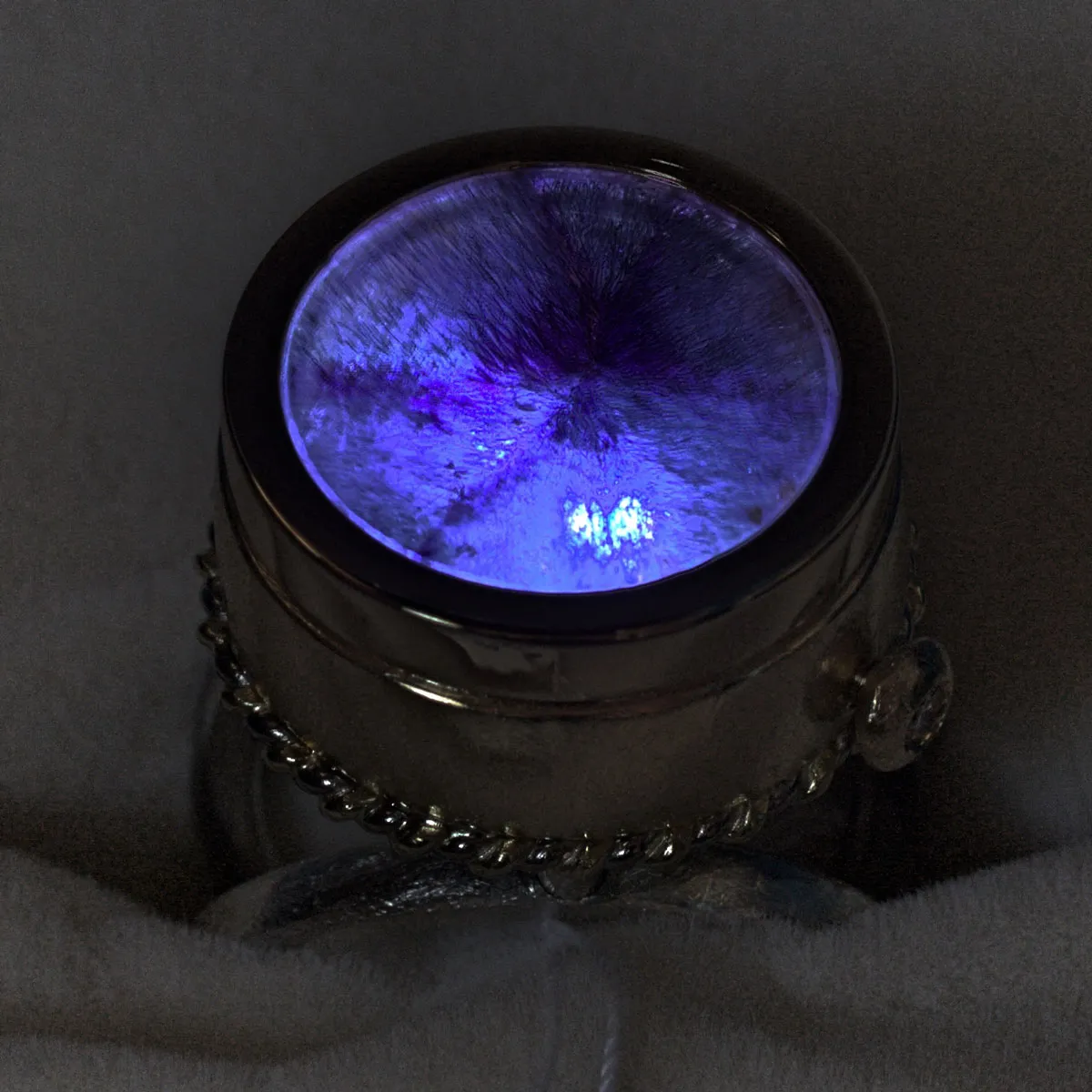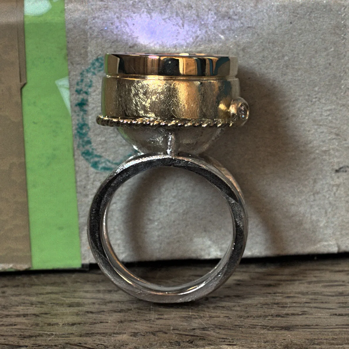 V-Schiene aus Silber-Palladium Kordeln mit aufgesetzter Schale in Silber, aufgesetzte Goldzarge mit Cacoxonith in Amethyst, eingebaute LED-Beleuchtung durch drehen des Steins ein- und auschaltbar