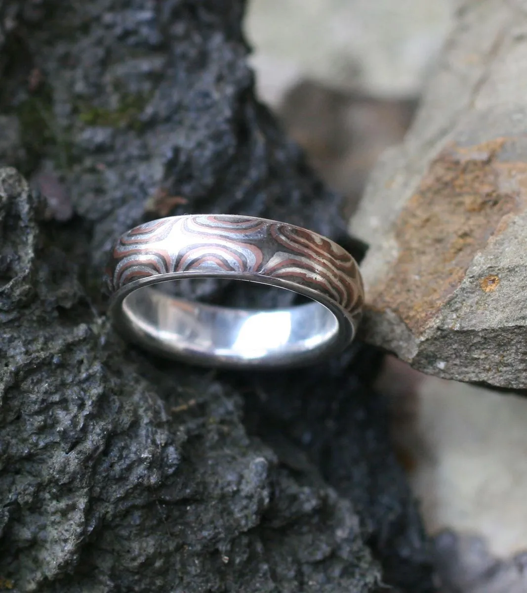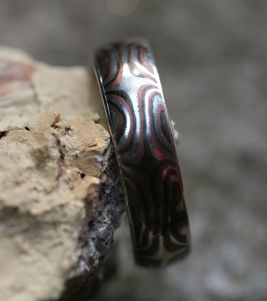 Mokume Gane Ring mit Sternen aus Feinsilber-Shakudo-Shibuishi