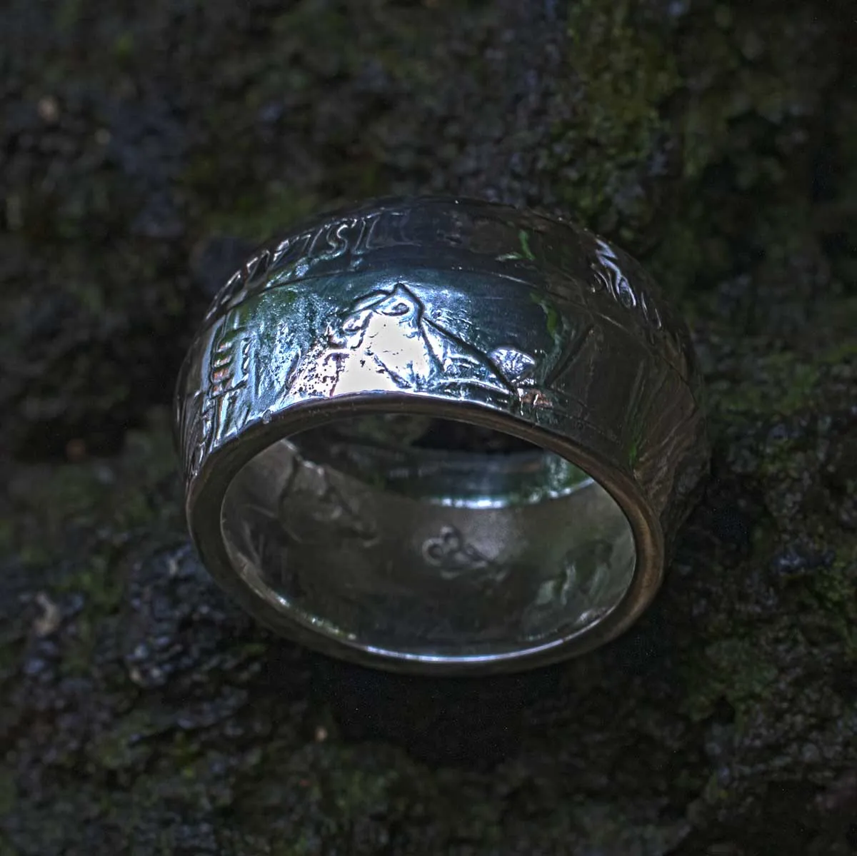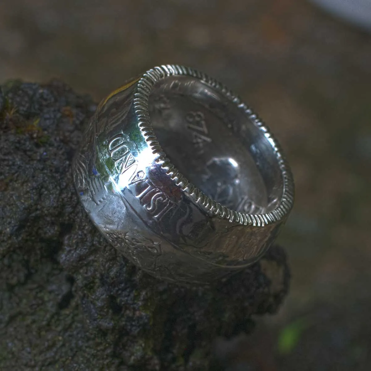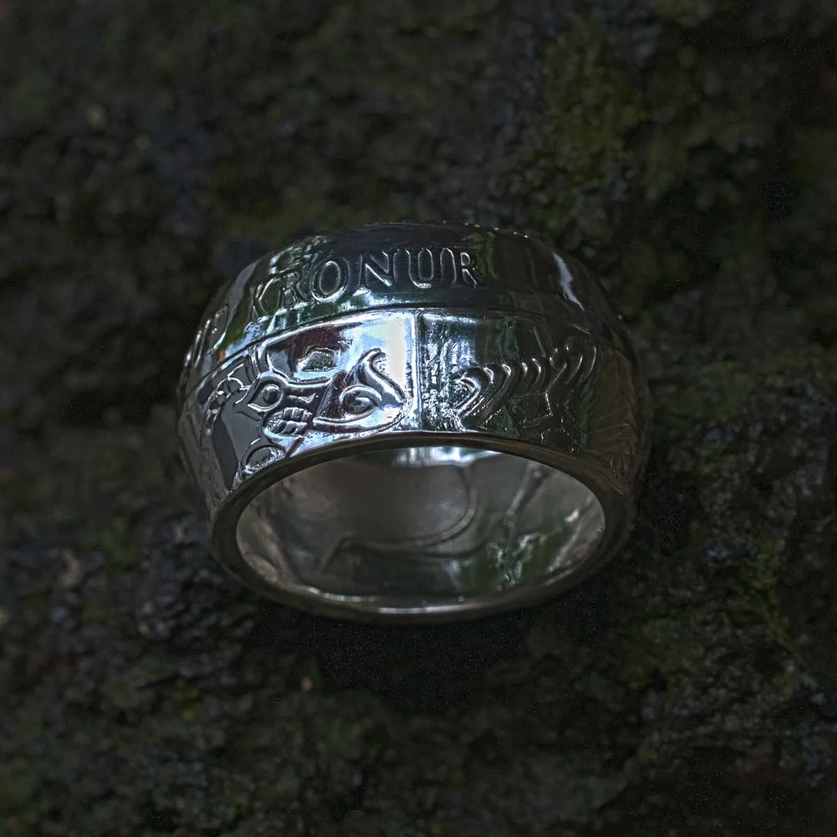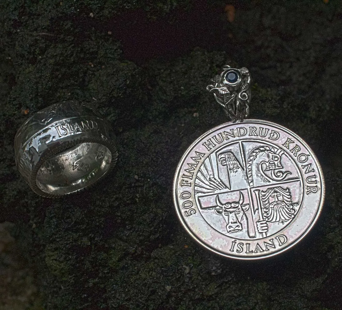 Ring und Anhänger aus einer isländischen Silbermünze als Eheringe