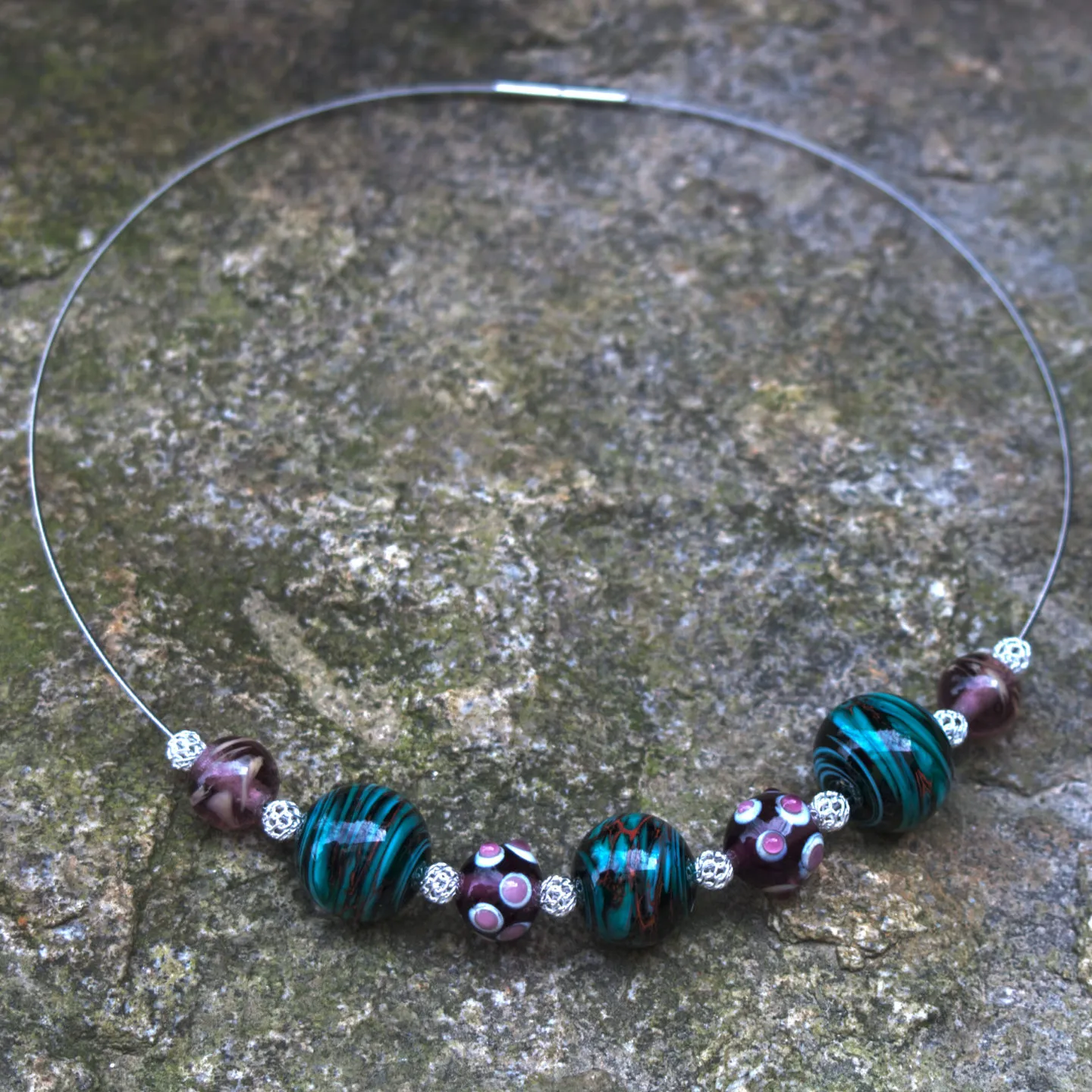 handgefertigte Muranoglas Perlen in Lila- und Blautönen mit Silberzwischenteilen auf Stahlseide-Reif mit Bajonettverschluß