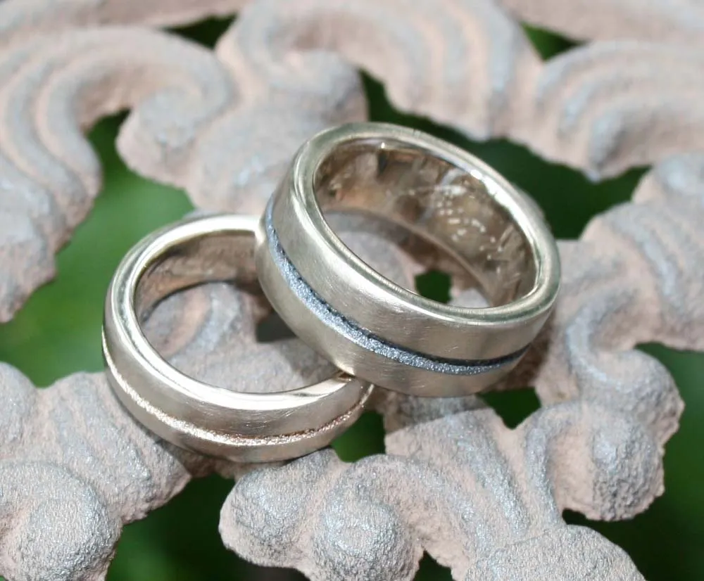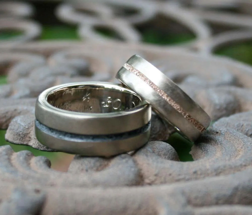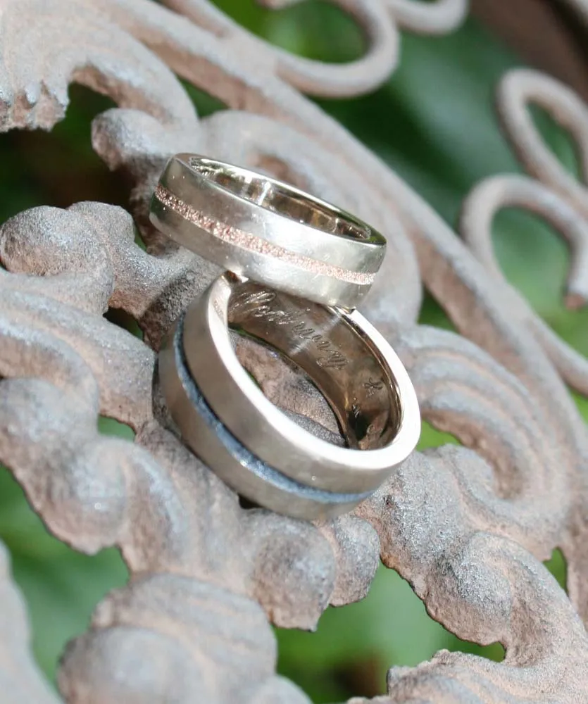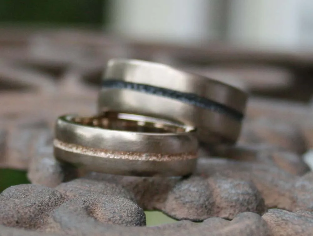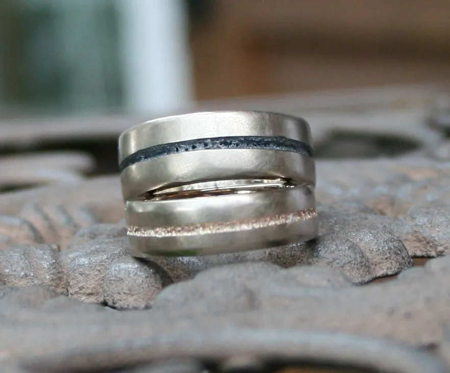 Weißgoldringe mit eingeschmolzenem Strifen in Niello und Rotgold