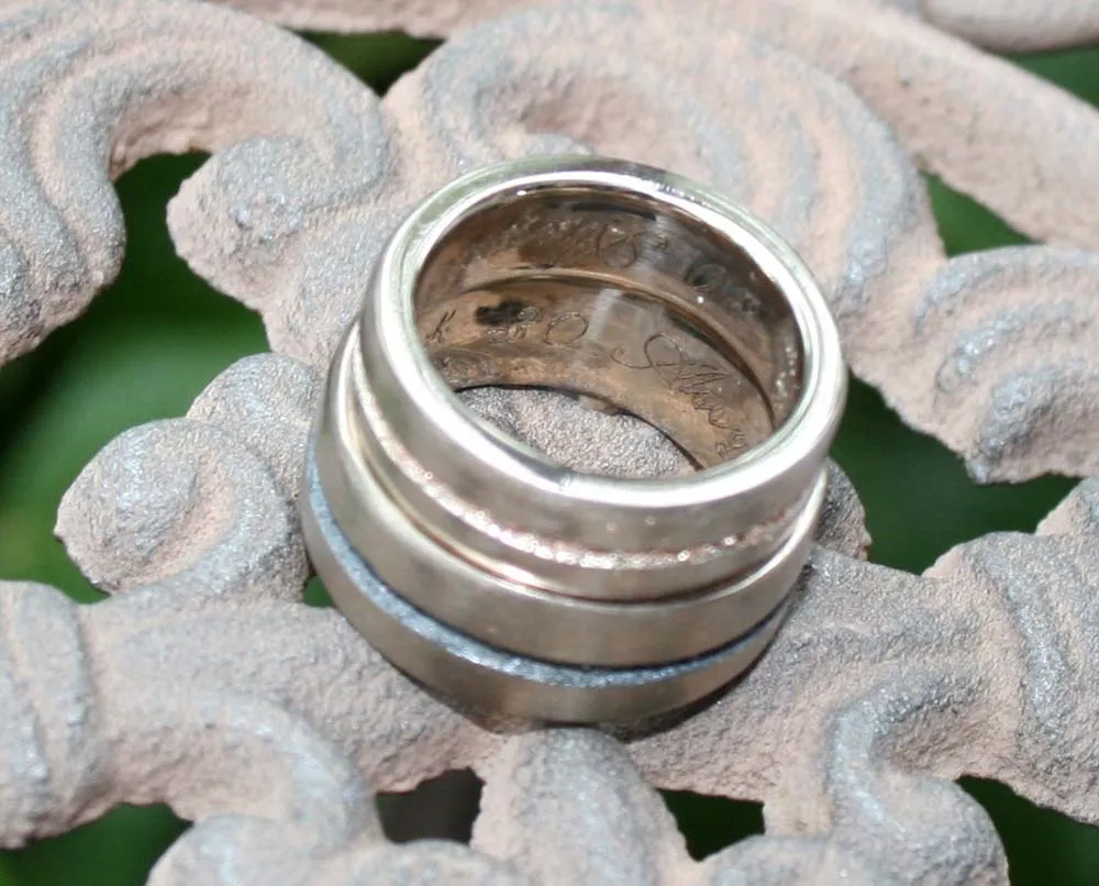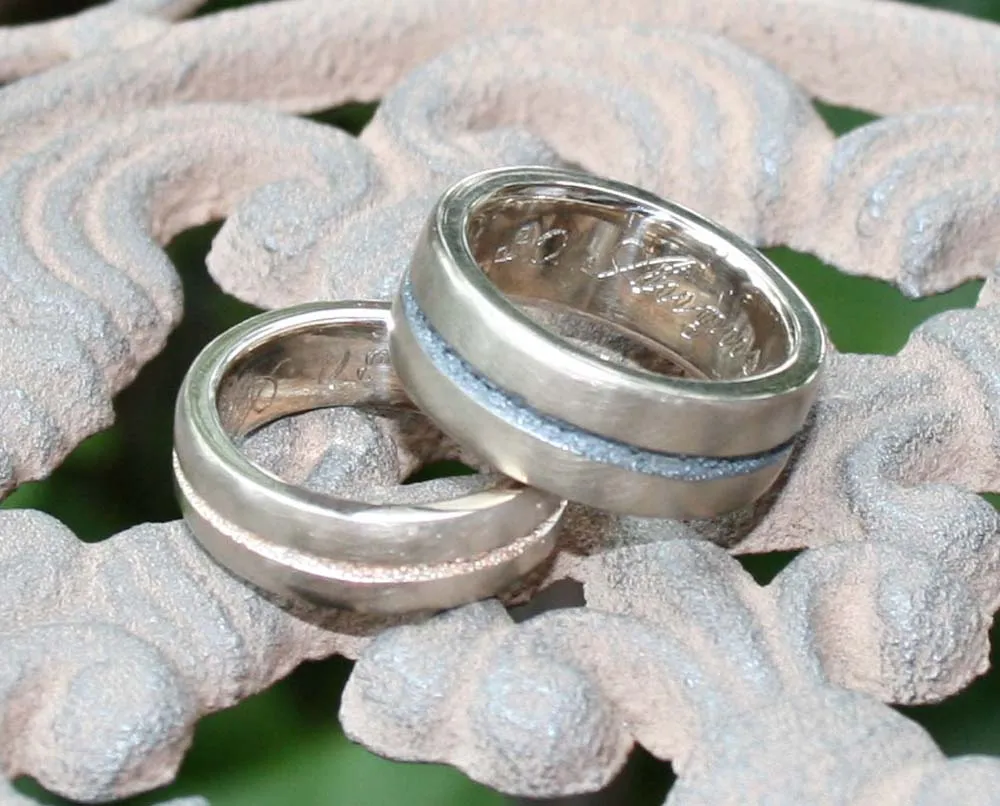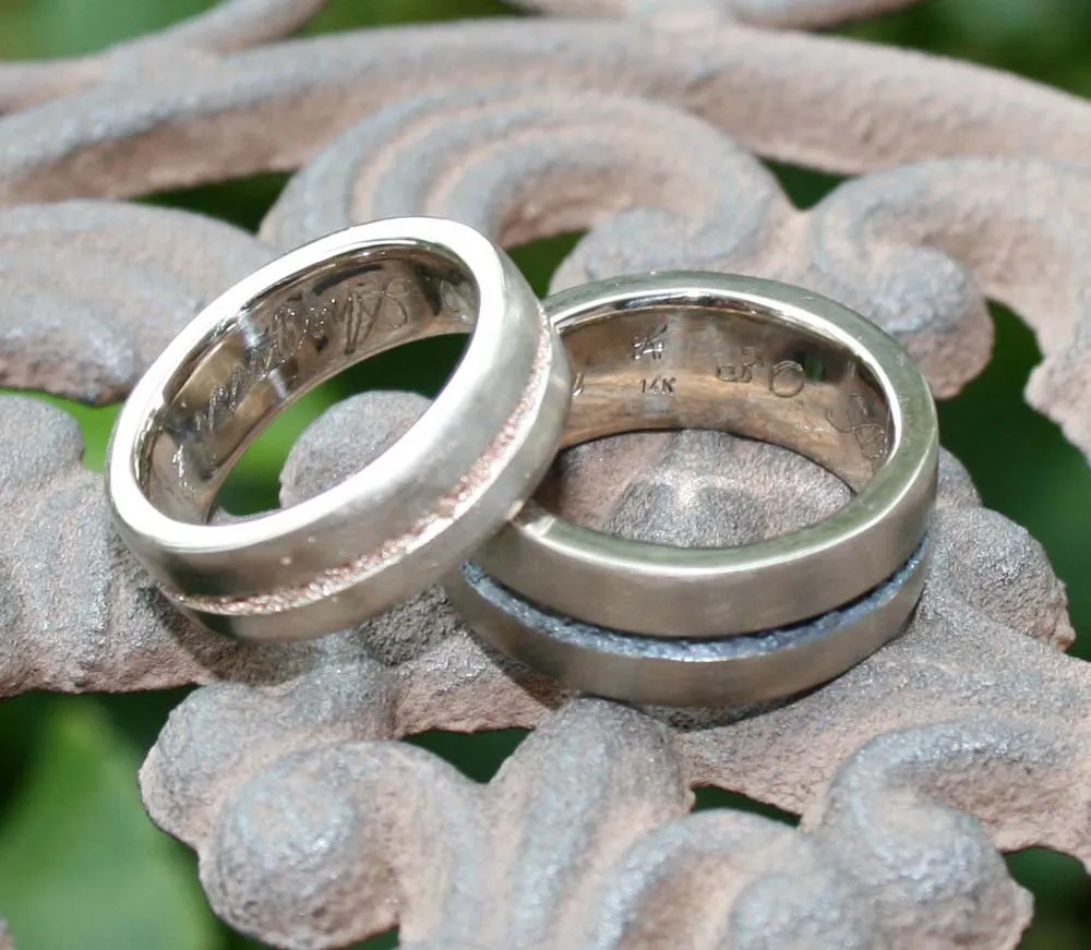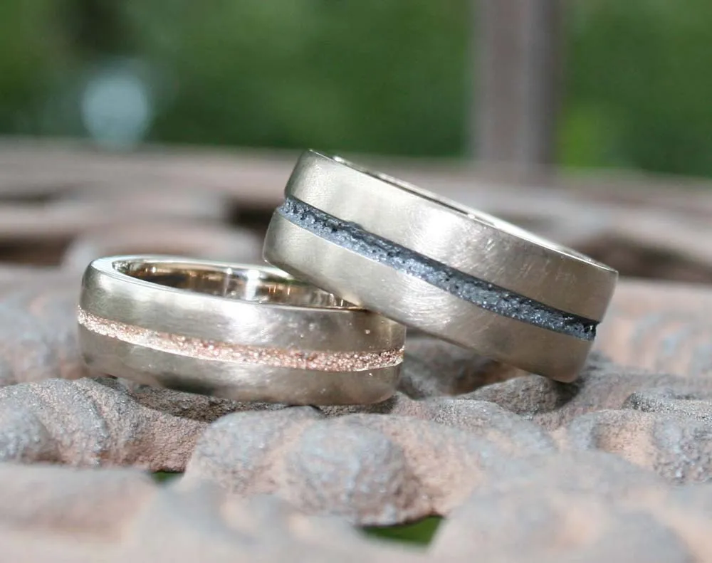 Weißgoldringe mit eingeschmolzenem Strifen in Niello und Rotgold