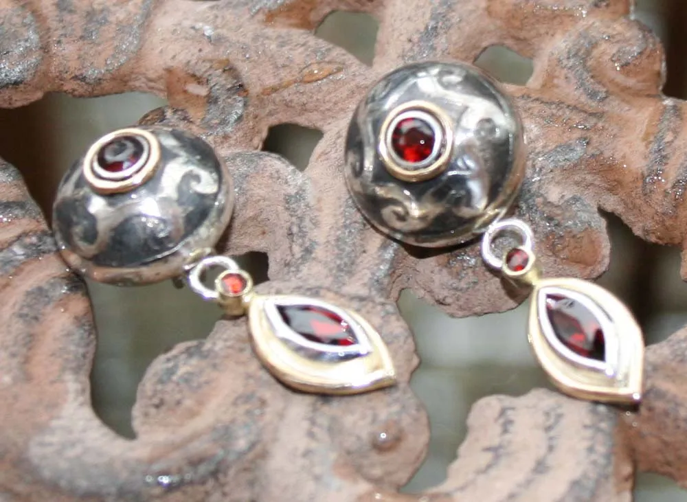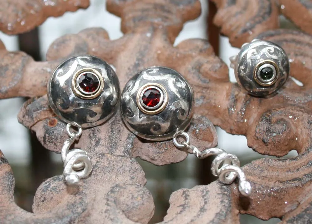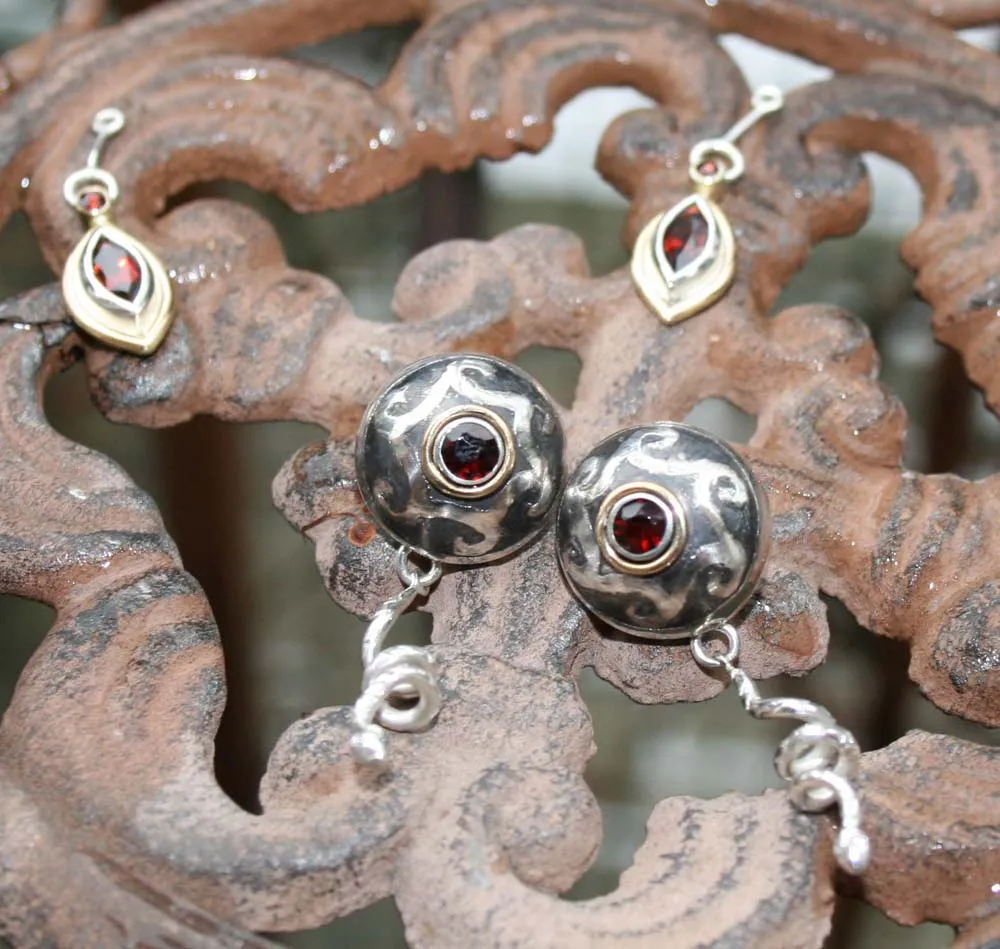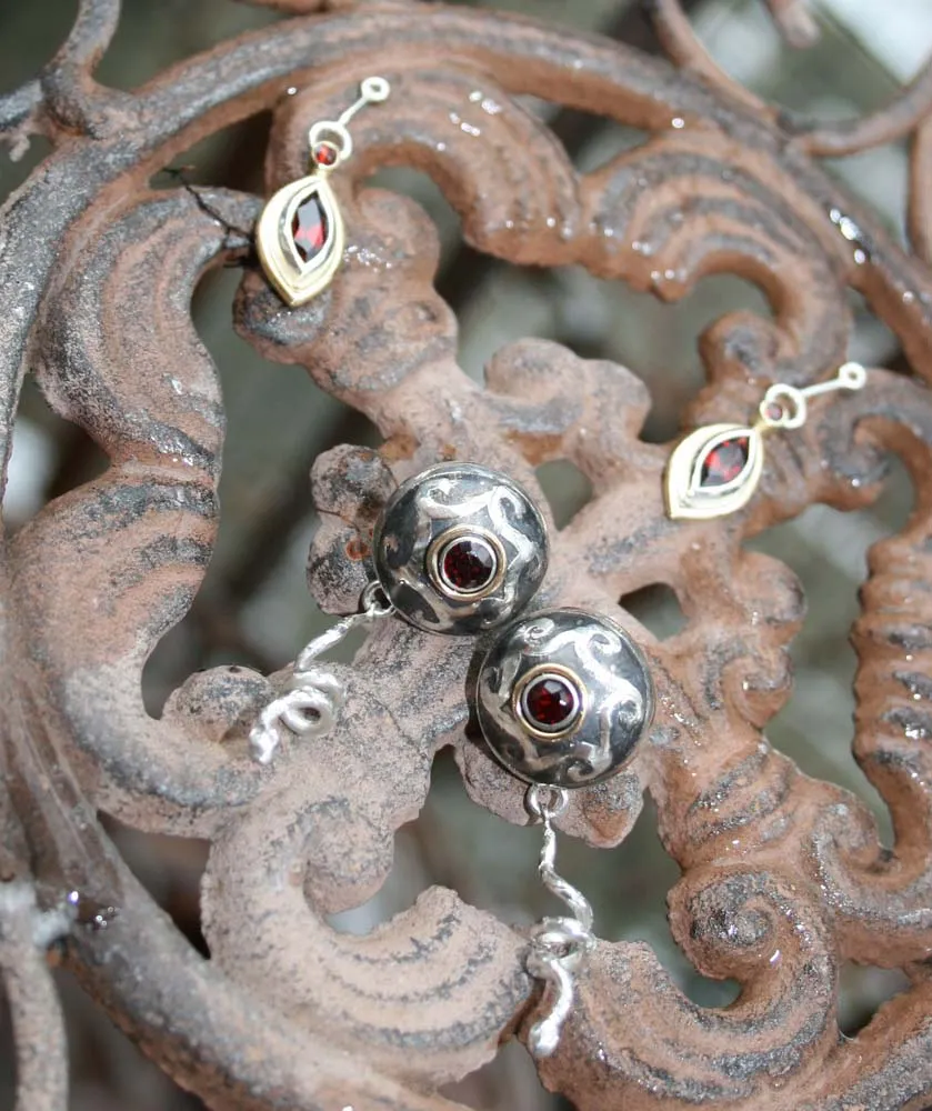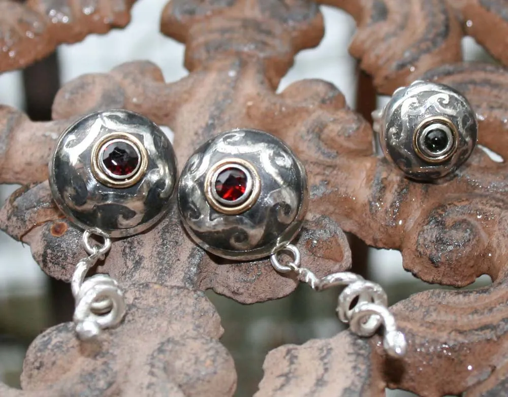 Ohrringe Silber, rund, gewölbt, mit geätzem Muster, mittig ein Granat in Gelbgoldfassung;