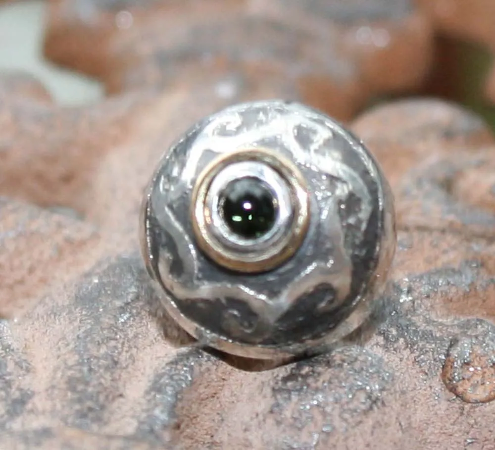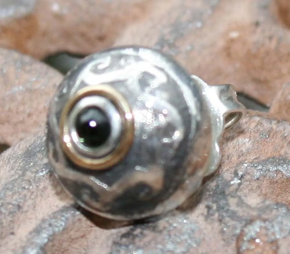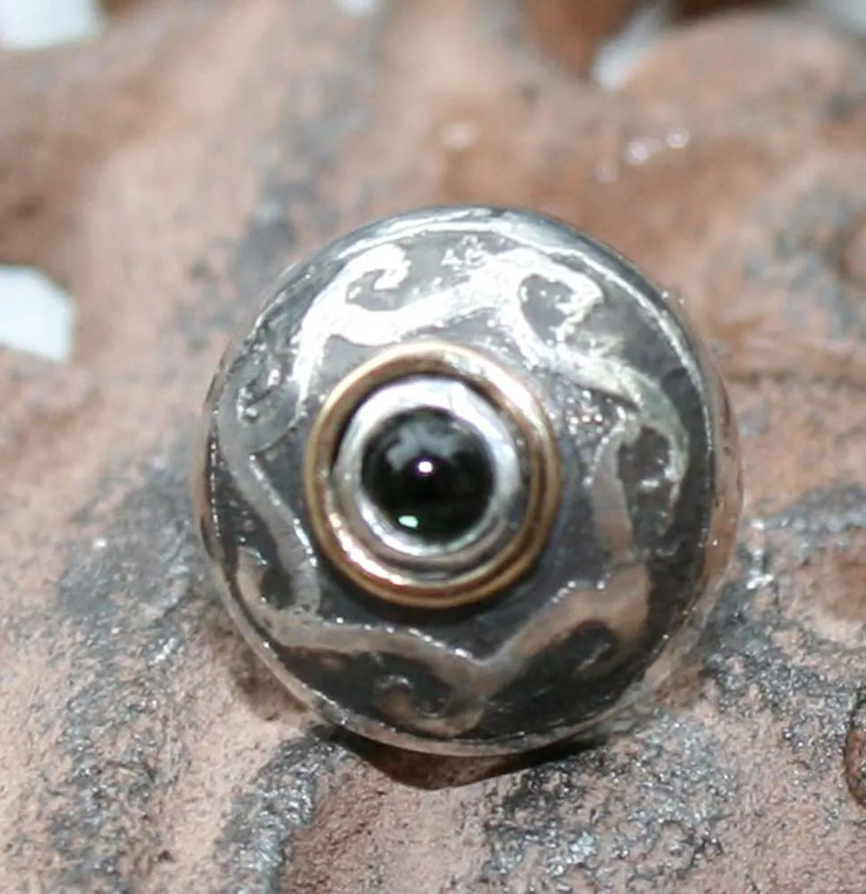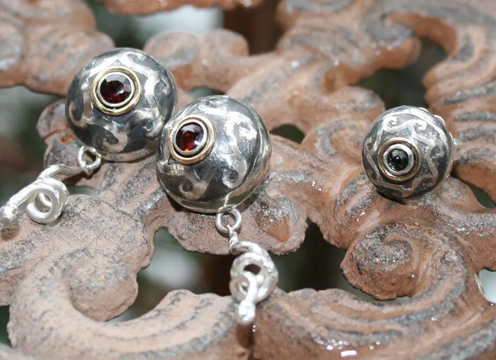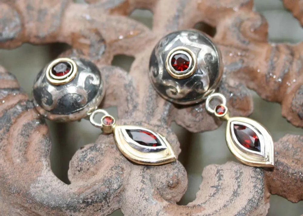 Ohrringe Silber, rund, gewölbt, mit geätzem Muster, mittig ein Granat in Gelbgoldfassung;