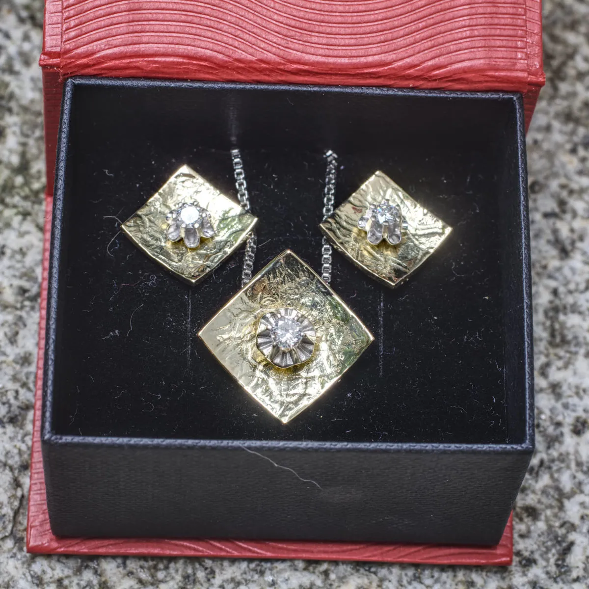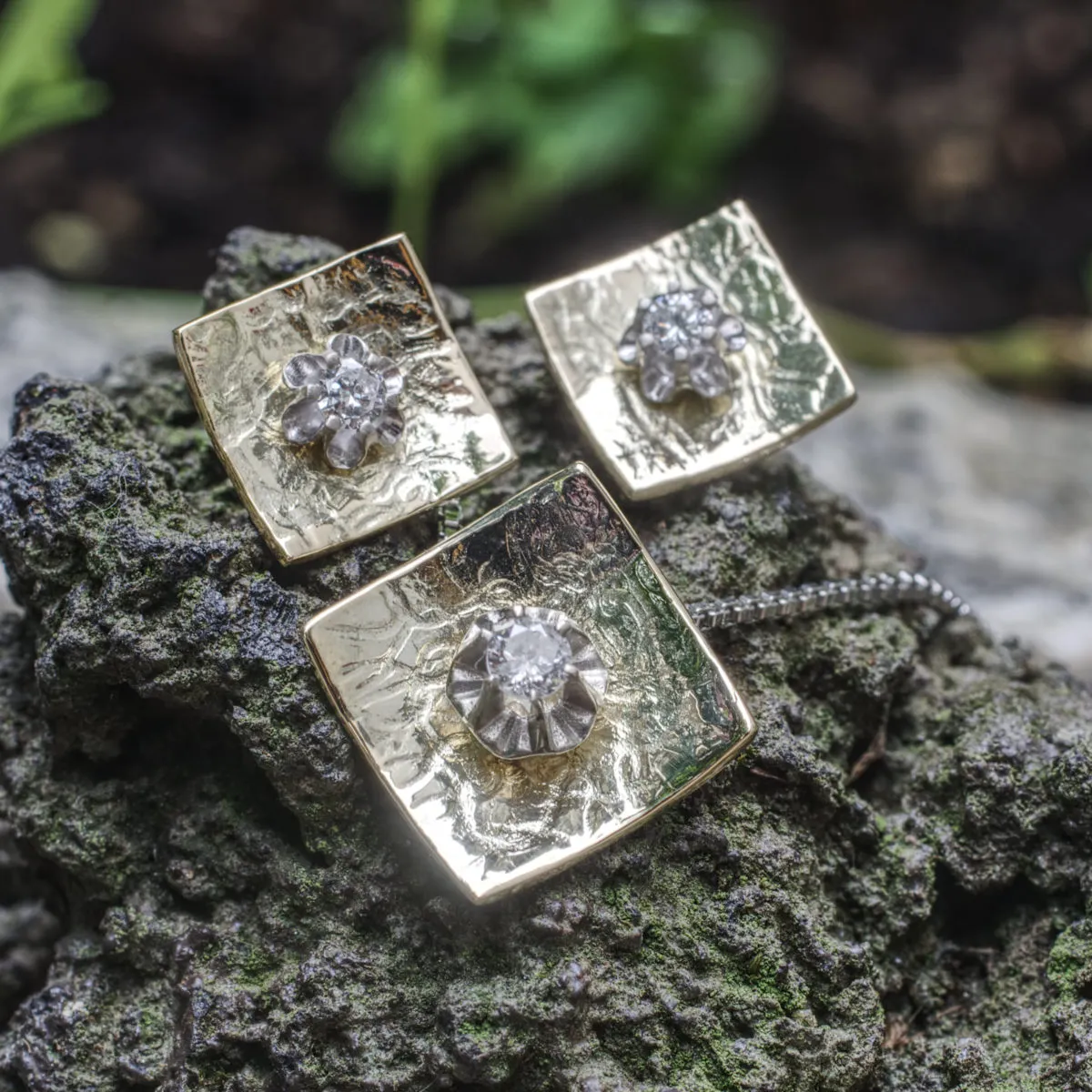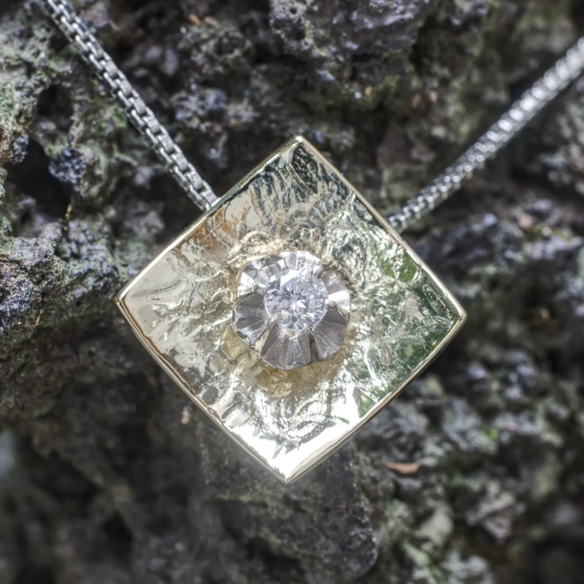 Quadratischer Anhänger Gelbgold mit Häkeldraht-Muster und aufgesetzter Weßgold-Blumenfassung mit Stein