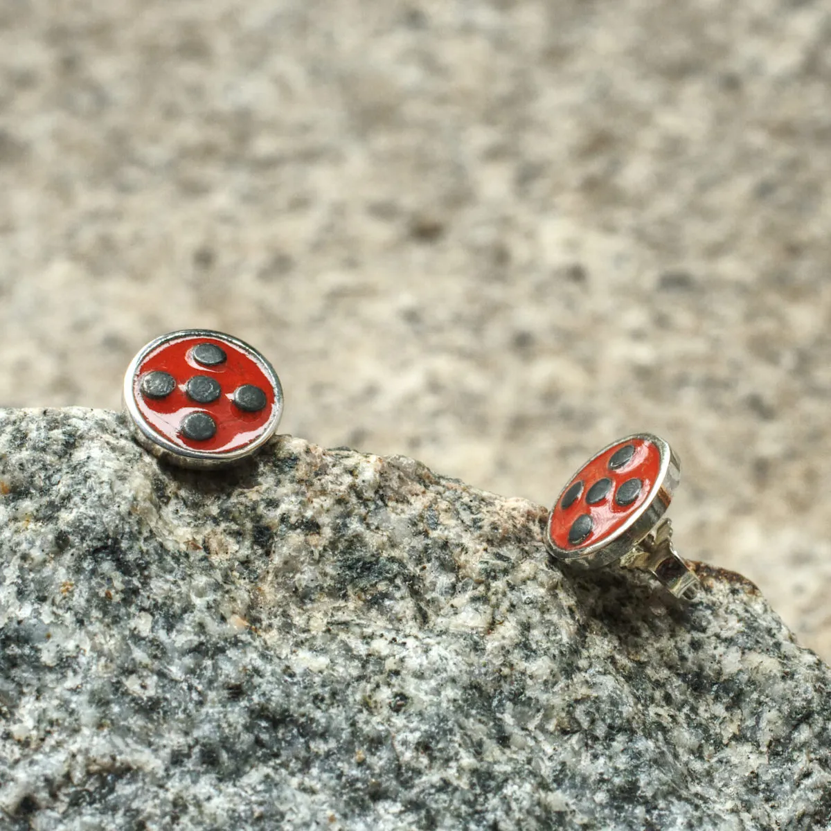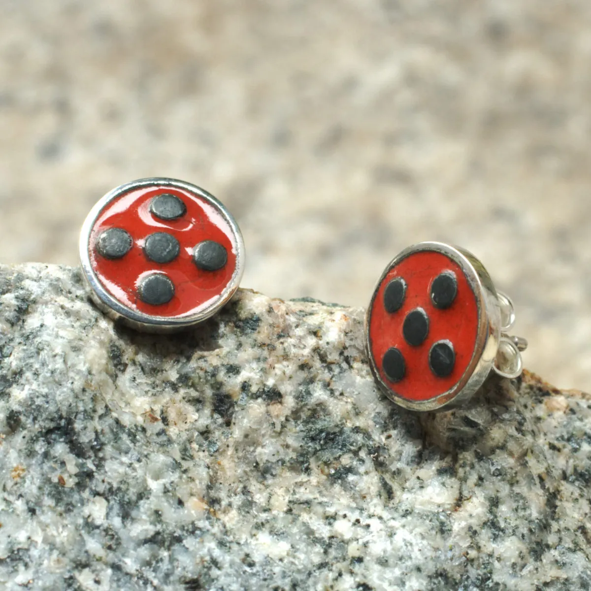 Ohrstecker Silber mit rotem Emaille und schwarzen Punkten (Marienkäfer)