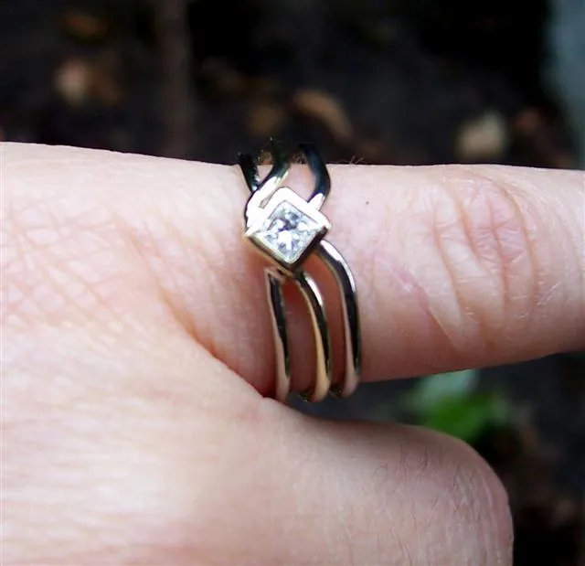 zweifarbiger Geflechtring aus Gelbgold und Weißgold, mit Diamant im Pricess-cut in Zargenfassung
