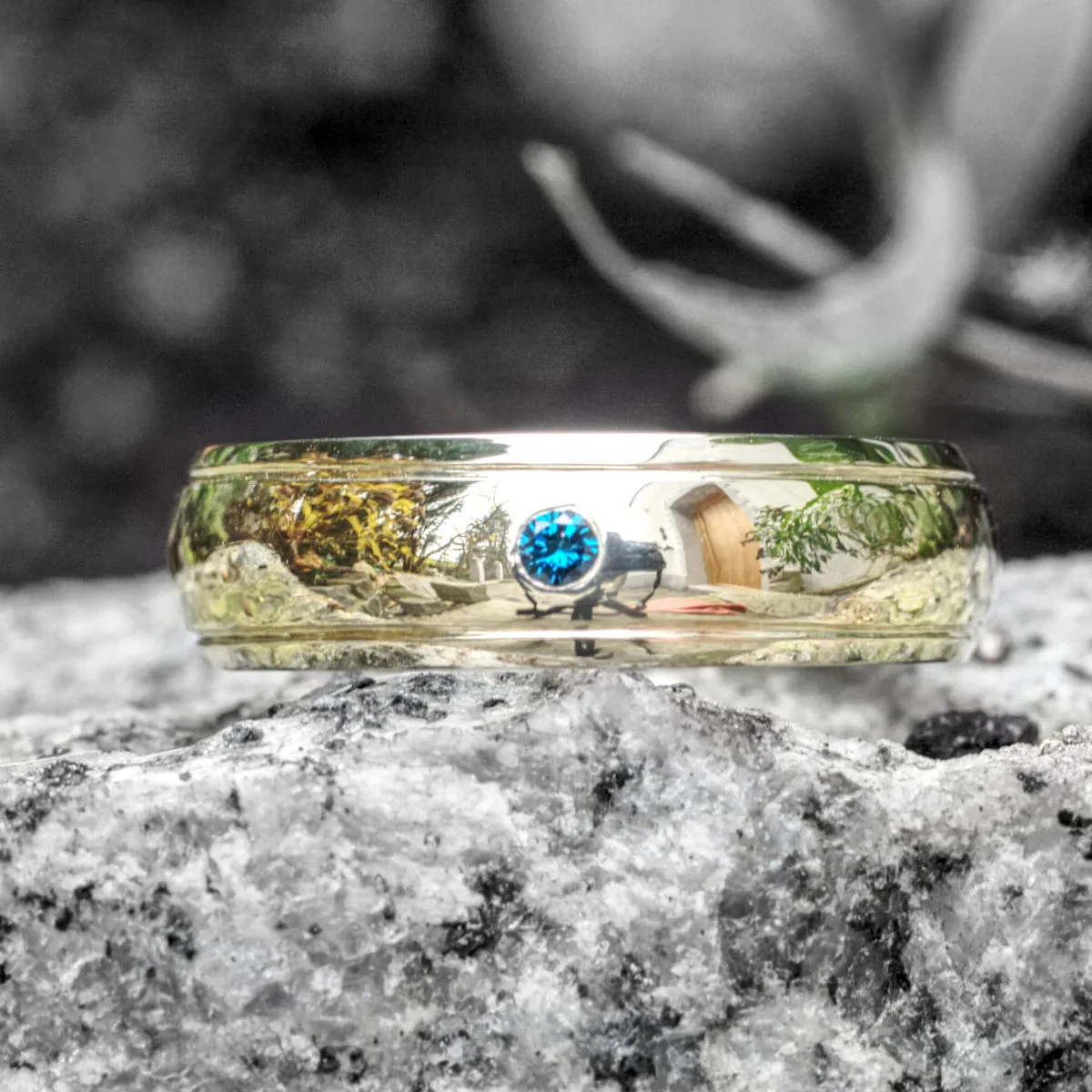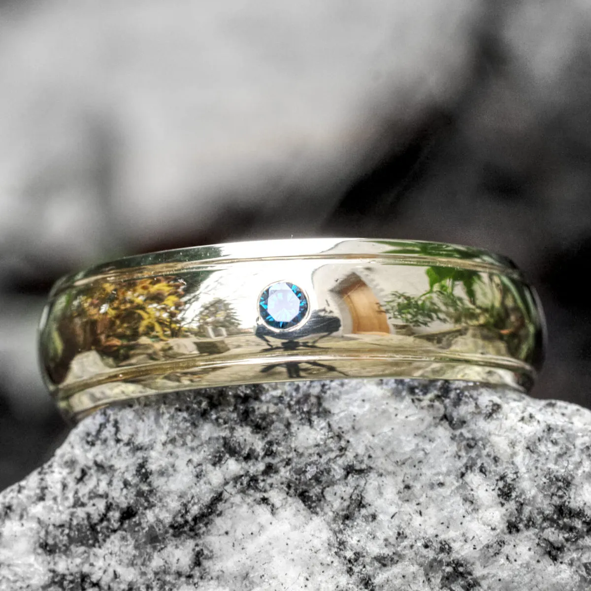 gewölbter Ring aus 585/°°° Gelbgold mit je eine Nut links und rechts und einem blauen Brillanten