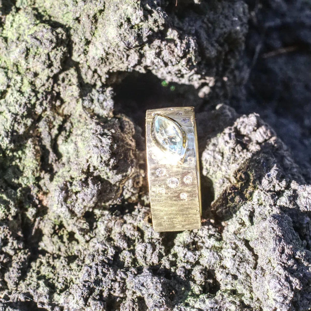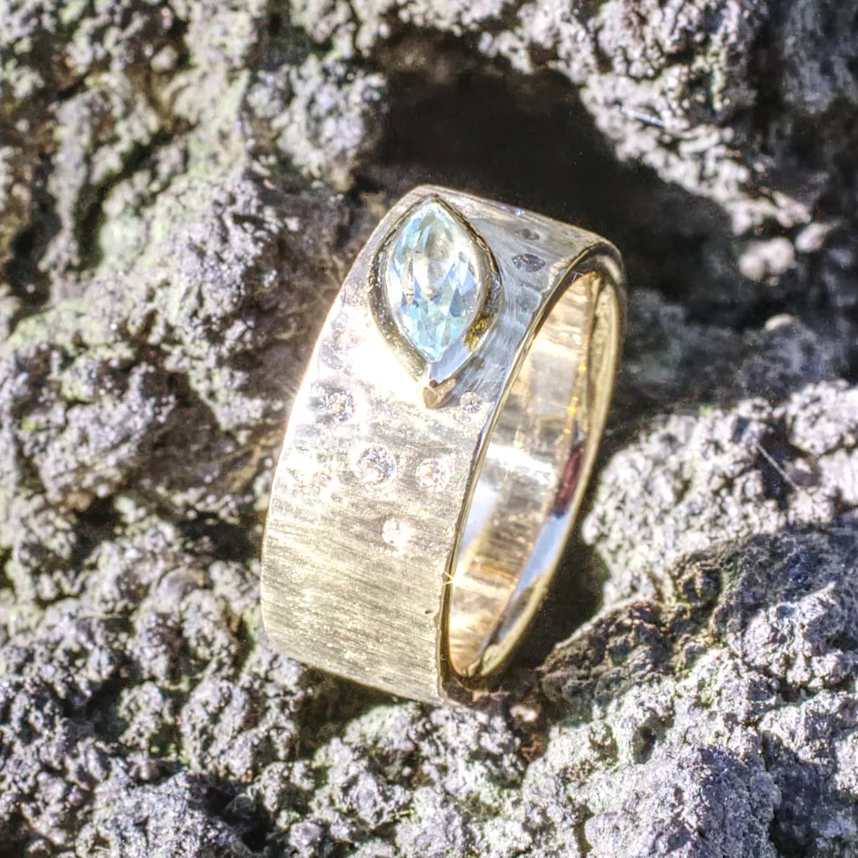 Bandring mit Hammerschlagstruktur Finne, mit aufgesetzter schräger Zarge für facettiertes blaues Navett,
