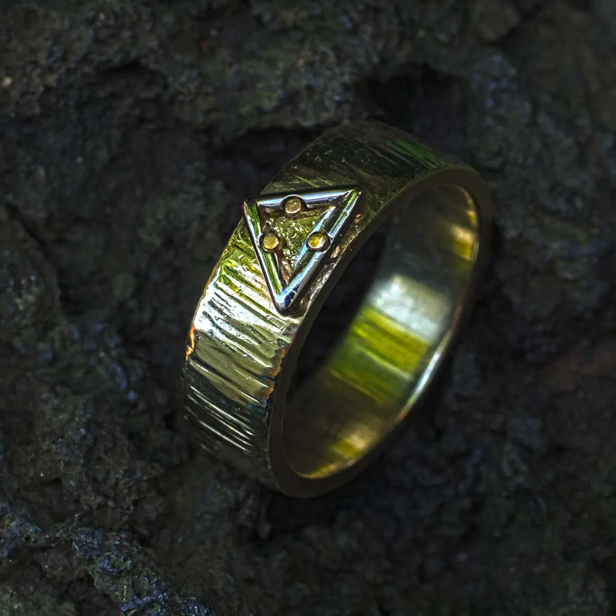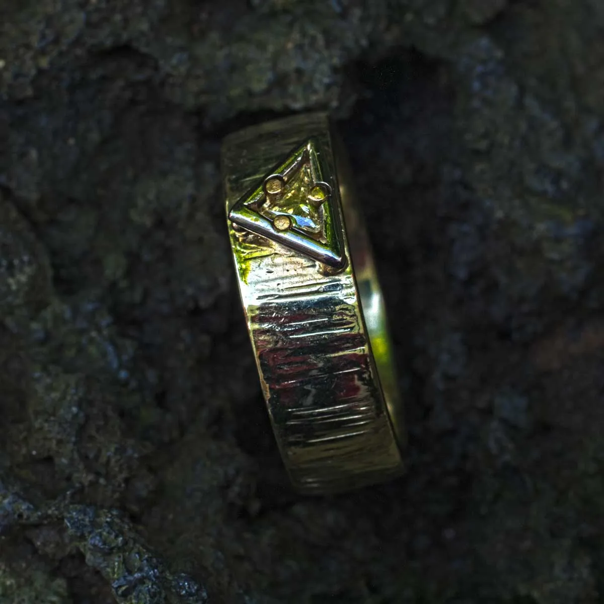 6,4mm breiter Ring aus Grüngold mit Hammerschlag Oberfläche mit aufgesetztem dreieckigen Diamantein in Krappenfassung mit Weißgold-Rand