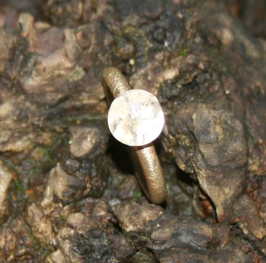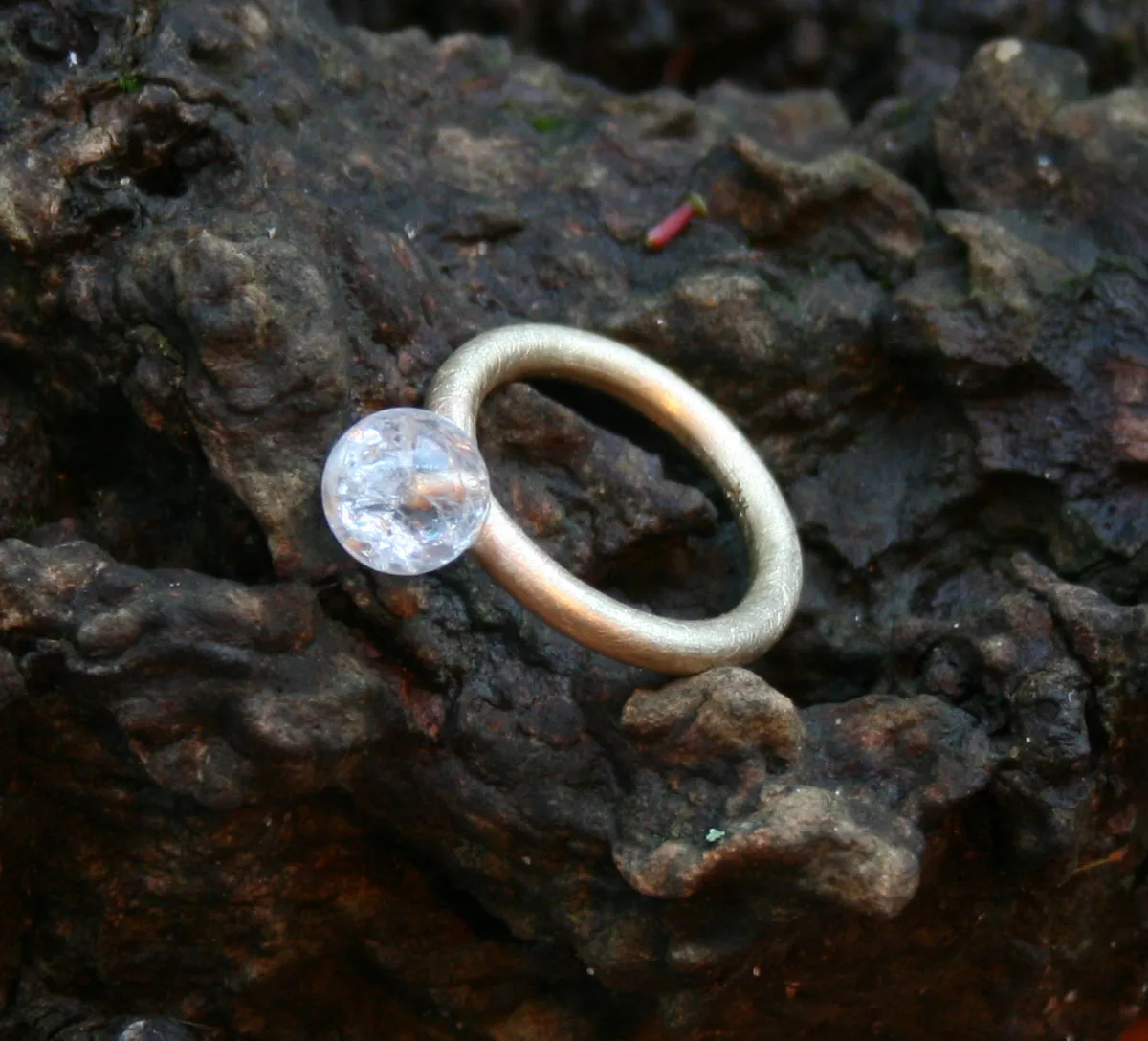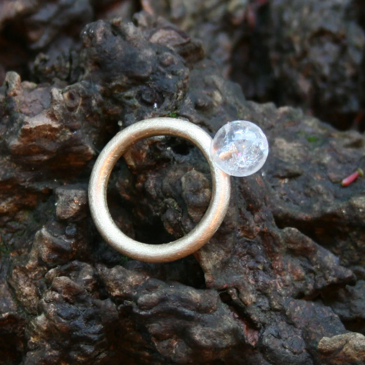 Gelbgoldring aus Runddraht mit aufgesetzter Bergkristall-Kugel